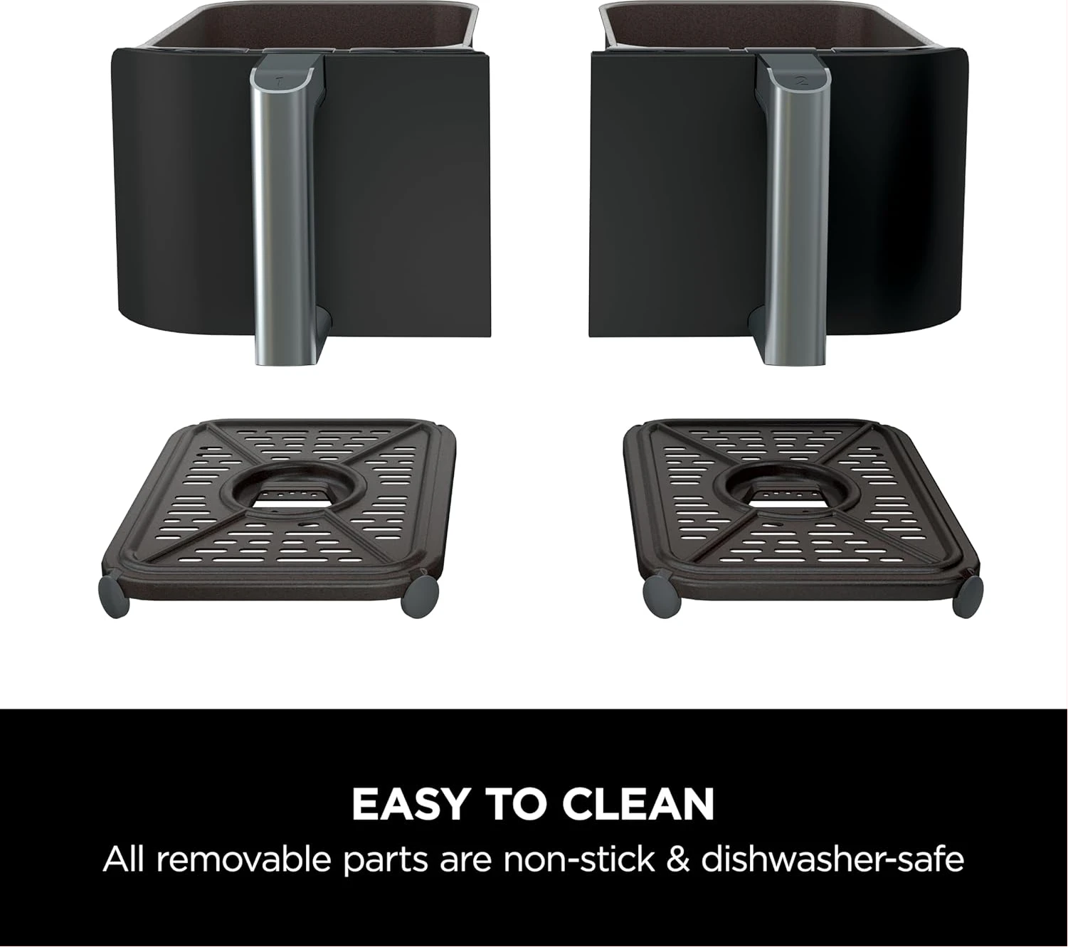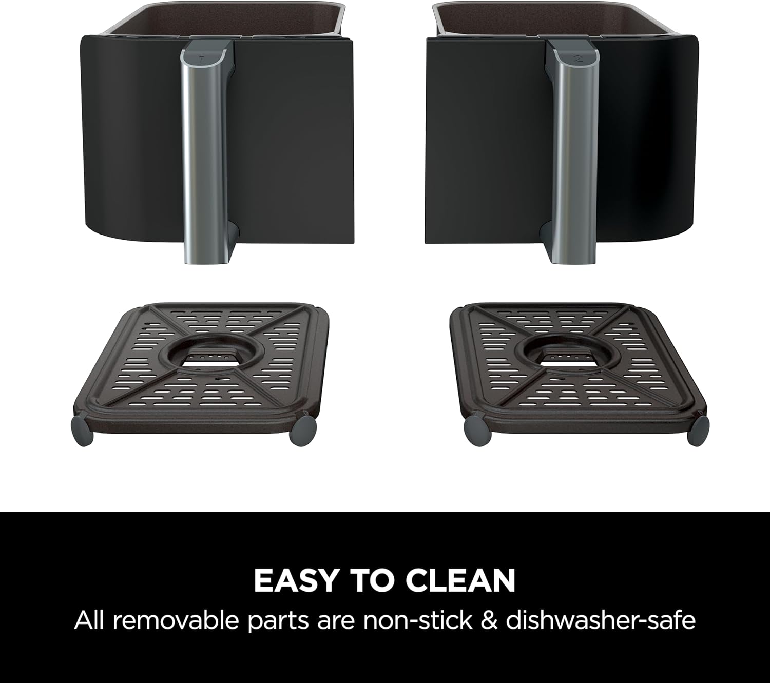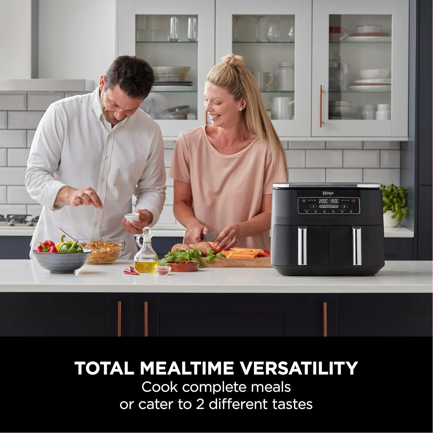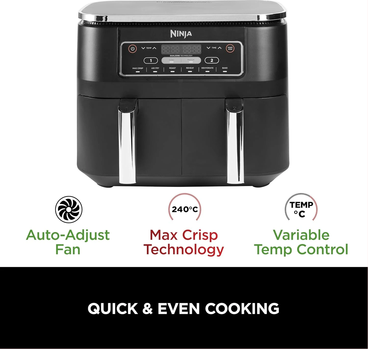 Ninja Foodi 7.6L Dual Zone Digital Air Fryer, 2 Drawers, 6-in-1, Air Fry, Max Crisp, Roast, Bake, Dehydrate, Cooks 4-6 Portions, Non-Stick, Dishwasher Safe Baskets, Black, AF300ME, 2 Years Warranty. Save up to 75% on your oven energy bill. The air fryer that cooks 2 foods, 2 ways, and finishes at the same time. More than an air fryer. 6 ways to cook – Max Crisp, Roast, Bake, Reheat, Dehydrate and Air Fry. When it comes to cooking, timing is everything. The Ninja Foodi Dual Zone 7.6L Air Fryer does the thinking and timing for you. With 2 independent cooking zones, you can mix and match cooking programs, times and temperatures across both drawers to create delicious meals in moments! SYNC to cook different foods in each drawer – both ready to serve at exactly the same time! Feeding the whole household? MATCH to make double the amount of food in the same amount of time! Up to 75% faster than fan ovens, cook from frozen to crispy in minutes. Air Fry using little to no oil – up to 75% less fat. (Testing and calculations based on recommended cook time for sausages, using air fry function versus conventional ovens. Tested against fish fingers and sausages, including pre-heat. Tested against deep fried, hand-cut French fries.)