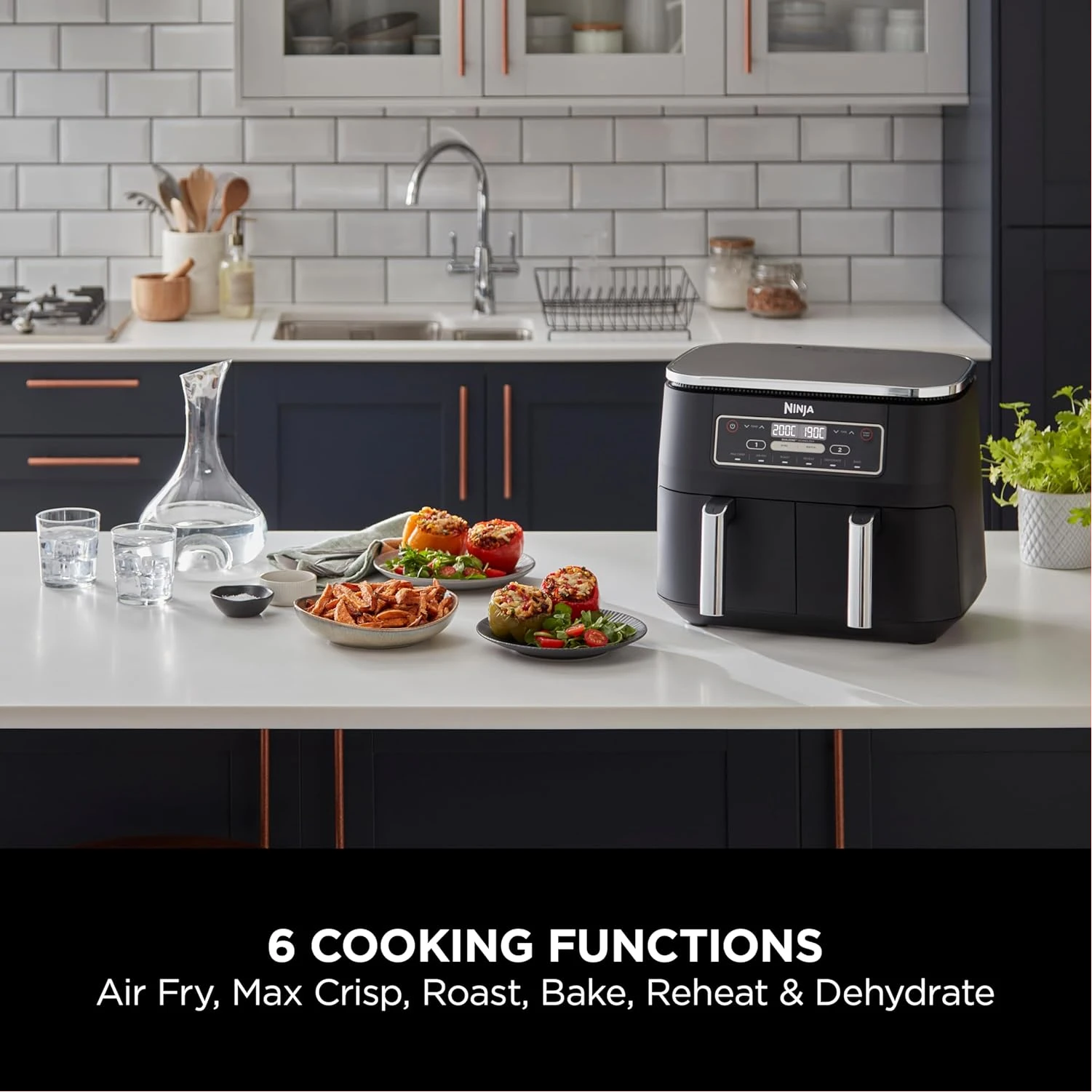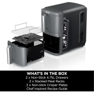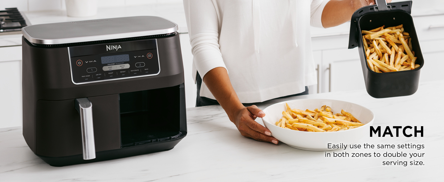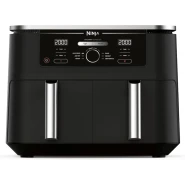 Key Features: Ninja Foodi 7.6L Dual Zone Digital Air Fryer, 2 Drawers, 6-in-1, Air Fry, Max Crisp, Roast, Bake, Dehydrate, Cooks 4-6 Portions, Non-Stick, Dishwasher Safe Baskets, Black, AF300ME, 2 Years Warranty. ENERGY-SAVING: Save up to 75% on your oven energy bill* (*testing and calculations based on recommended cook time for sausages, using air fry function versus conventional ovens). 2 INDEPENDENT COOKING ZONES: Cook 2 foods, 2 ways, both ready at the same time. Use different functions, times and temps in each drawer to create complete meals in one appliance, or cater to 2 tastes. 6 COOKING FUNCTIONS: Max Crisp, Air Fry, Roast, Bake, Reheat, Dehydrate. Cook from frozen to crispy. Up to 75% less fat* using the Air Fry function (*Tested against deep fried, hand-cut French fries). LARGE CAPACITY: Cook 4-6 portions. Each drawer fits up to 1kg of fries or a 1.6kg chicken. Cook up to 75% faster than fan ovens* (*Tested against fish fingers and sausages, including preheat). INCLUDES: Ninja Air Fryer, 2x Non-stick, dishwasher-safe 3.8L Drawers (7.6L total capacity) & Crisper Plates. Chef-Created Recipe Guide. Weight: 8.2kg. Colour: Black. DIMENSIONS: H31.5cm x W38cm x D26.5cm. 2-year guarantee upon registration with Ninja .