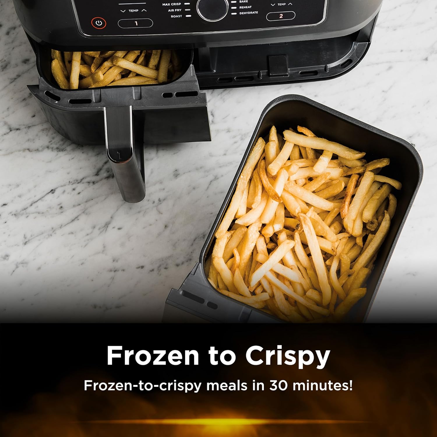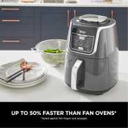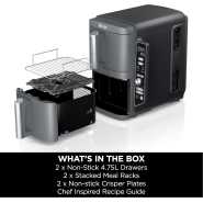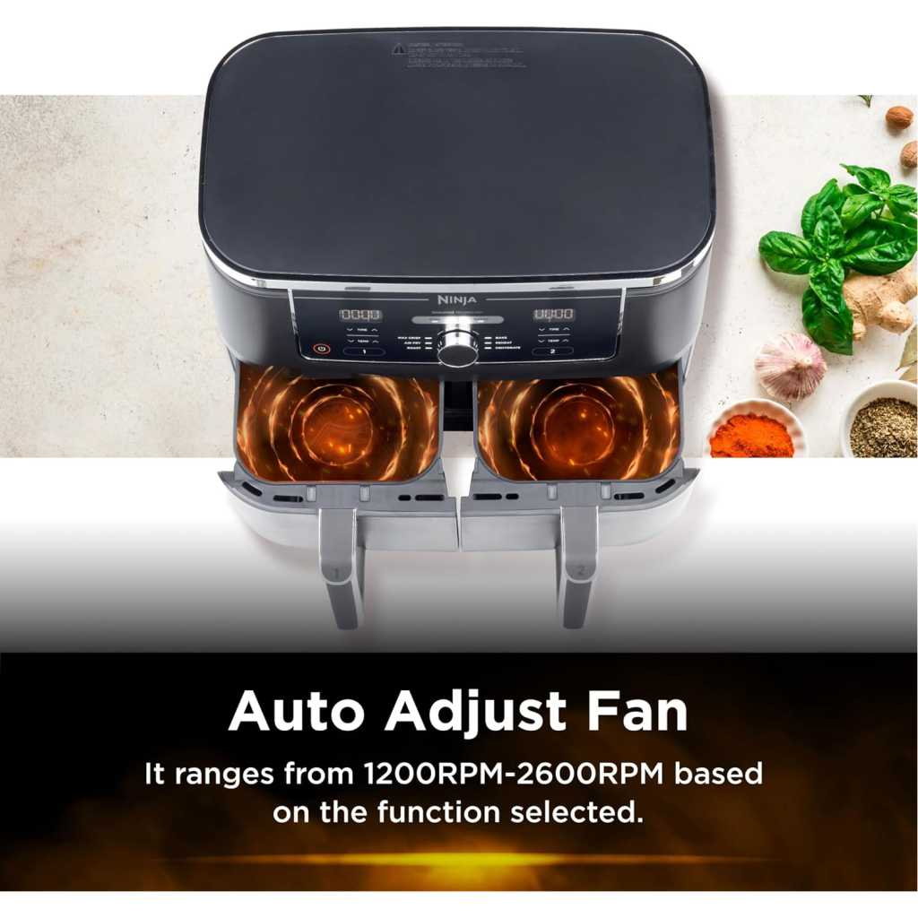 Key Features: Ninja Foodi MAX 9.5L Dual Zone Digital Air Fryer, 2 Drawers, 6-In-1, Uses No Oil, Air Fry, Max Crisp, Roast, Bake, Reheat, Dehydrate, Cook 8 Portions, Non-Stick Dishwasher Safe Baskets, B 9.5 L 2470 W AF400ME – Black. ENERGY-SAVING: Save up to 65% on your oven energy bill* (*testing and calculations based on recommended cook time for sausages, using air fry function versus conventional ovens). 2 INDEPENDENT COOKING ZONES: Cook 2 foods, 2 ways, both ready at the same time. Use different functions, times and temps in each drawer to create complete meals in one appliance, or cater to 2 tastes. 6 COOKING FUNCTIONS: Max Crisp, Air Fry, Roast, Bake, Reheat, Dehydrate. Cook from frozen to crispy. Up to 75% less fat* using the Air Fry function (*Tested against deep fried, hand-cut French fries). EXTRA-LARGE CAPACITY: Cook up to 8 portions. Each drawer fits up to 1.4kg fries or a 2kg chicken. Cook up to 75% faster than fan ovens* (*Tested against fish fingers and sausages, including preheat). INCLUDES: Ninja Dual Drawer Air Fryer, 2x non-stick dishwasher-safe 4.75L Drawers (9.5L total capacity) & Crisper Plates. Chef-created Recipe Guide. Weight: 8.9kg. Colour: Black. DIMENSIONS: H32.5cm x W41.5cm x D27cm. 2-year guarantee upon registration with Ninja .
