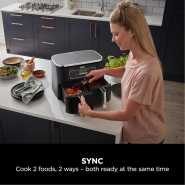 Ninja Foodi MAX 9.5L Dual Zone Digital Air Fryer, 2 Drawers, 6-In-1, Uses No Oil, Air Fry, Max Crisp, Roast, Bake, Reheat, Dehydrate, Cook 8 Portions, Non-Stick Dishwasher Safe Baskets, B 9.5 L 2470 W AF400ME – Black. Save up to 65% on your oven energy bill. Take mealtimes to the MAX with the large capacity air fryer that cooks 2 foods, 2 ways, and finishes at the same time. More than an air fryer. 6 ways to cook – Max Crisp, Roast, Bake, Reheat, Dehydrate and Air Fry. Introducing the ultimate mealtime solution, perfect for feeding the whole household. With a large capacity and 2 independent cooking zones, the Ninja Foodi MAX Dual Zone 9.5L Air Fryer does the thinking and timing for you. Mix and match cooking programs, times and temperatures across both drawers to create delicious meals in moments! SYNC to cook different foods in each drawer – both ready to serve at exactly the same time! MATCH settings across both drawers to double your serving size. Cook up to 25% more – easily fit a 2kg chicken in each drawer! Up to 75% faster than fan ovens. Up to 75% less fat than traditional frying methods. (Testing and calculations based on recommended cook time for sausages, using air fry function versus conventional ovens Compared to AF300ME, 7.6L Tested against fish fingers and sausages, including pre-heat. Tested against deep fried, hand-cut French fries.)
