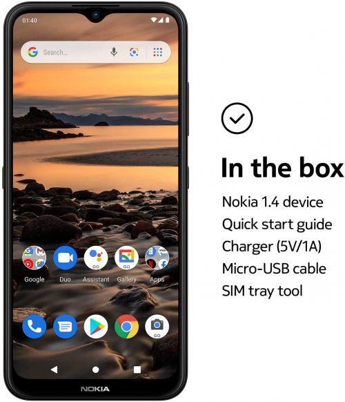 Nokia 1.4 smartphone was launched on 3rd February 2021. The phone comes with a 6.52-inch touchscreen display with a resolution of 720×1600 pixels and an aspect ratio of 20:9.Nokia 1.4 comes with 2GB of RAM. The Nokia 1.4 runs Android 10 (Go edition) and is powered by a 4000mAh non-removable battery. As far as the cameras are concerned, the Nokia 1.4 on the rear packs an 8-megapixel primary camera, and a 2-megapixel camera. The rear camera setup has autofocus. It sports a 5-megapixel camera on the front for selfies. Nokia 1.4 is based on Android 10 (Go edition) and packs 32GB of inbuilt storage that can be expanded via microSD card (up to 128GB). The Nokia 1.4 is a dual-SIM (GSM and GSM) smartphone that accepts Nano-SIM and Nano-SIM cards. The Nokia 1.4 measures 166.42 x 76.72 x 0.00mm (height x width x thickness) and weighs 178.00 grams. It was launched in Charcoal, Dusk, and Fjord colours. Connectivity options on the Nokia 1.4 include Wi-Fi 802.11 b/g/n, GPS, Bluetooth v4.20, Micro-USB, FM radio, 3G, and 4G (with support for Band 40 used by some LTE networks in India). Sensors on the phone include accelerometer, proximity sensor, and fingerprint sensor.