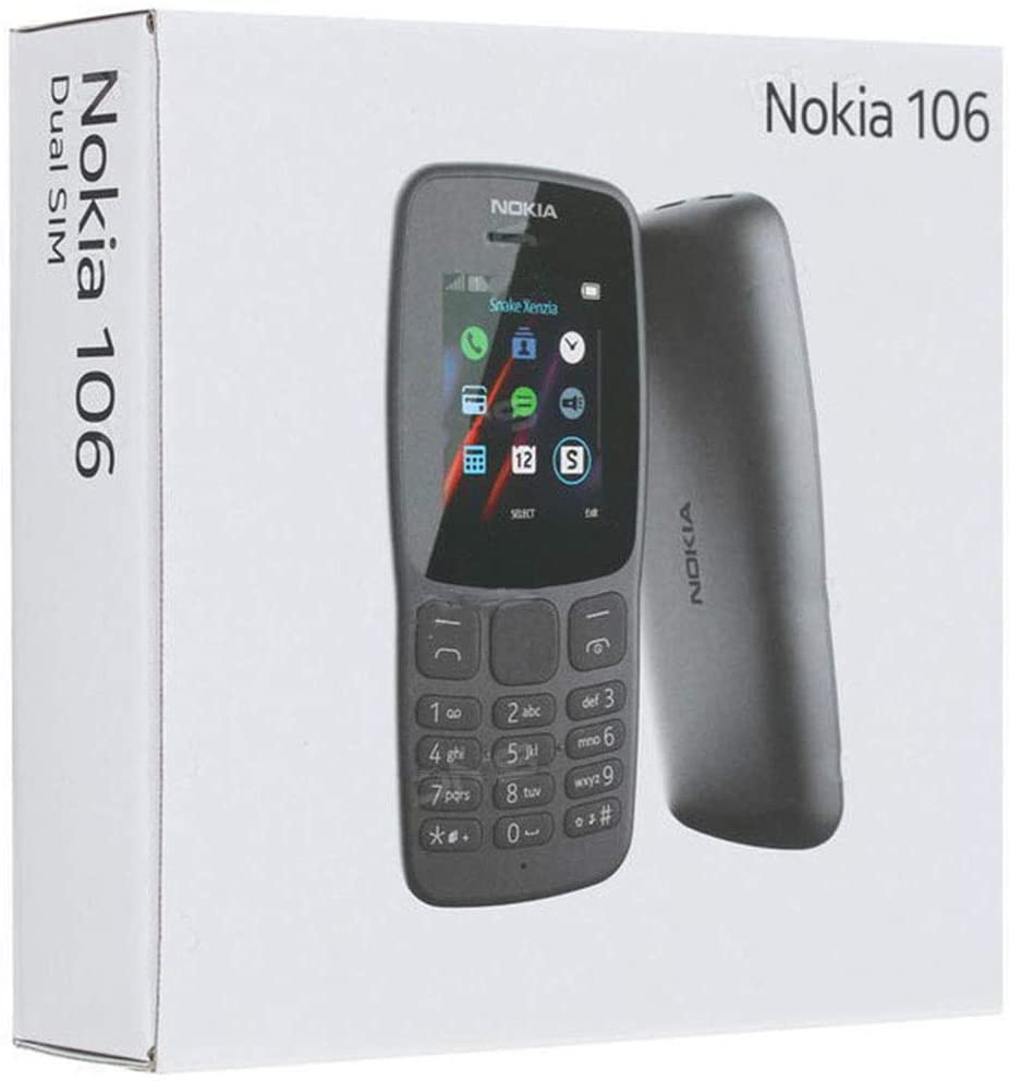 Nokia 106 Simply essential nokia_106-product_page-hardware-mobile.png Talk from sunrise to sunset Nokia 106 doesn’t let you down: its battery lasts weeks between charges and you can talk over fifteen hours on a single charge1. You can also use a standard USB charger to power up. nokia_106-product_page-hardware-icon-standby_time.svg ≈ 21 days of standby time1 nokia_106-product_page-hardware-icon-talk_time.svg ≈ 15 hours of talk time1 Design Tough enough Made from tough polycarbonate, Nokia 106 is built to last. Its inherent coloring means the color runs through the material, which makes scratches less detectable. Thanks to the contoured design, Nokia 106 fits perfectly in your hand. nokia_106-product_page-design-desktop.jpg 1.8″ display Inherent coloring For work and fun Play the classic Snake Xenzia and preloaded try-and-buy games like Nitro Racing, Danger Dash, Tetris and more. Nokia 106 also holds up to 2000 contacts and 500 text messages, so you can easily keep in touch with your business network, friends and family. 500 SMS 2000 contacts nokia_106-product_page-games-mobile.png The details Nokia 106 Outside 1.8’’ display Island keymat Inherent color Contoured design nokia_106-black.png Inside Dual SIM MTK 6261D processor 4 MB RAM Removable 800 mAh² battery Full specifications What’s in the box nokia_106-product_page-buy-desktop.jpg Nokia 106 Colors: Pricing may vary between different retailers and depending on product specifications such as memory amount. As an Amazon Associate, HMD Global earns from qualifying purchases. Key Features: 1.8-inch (4.57 cm) display 15 hours talk time, 21 days standby time on a single charge Durable design with tough polycarbonate body Store up to 2,000 contacts and 500 messages One-year manufacturer warranty for device.The box does not include earphones