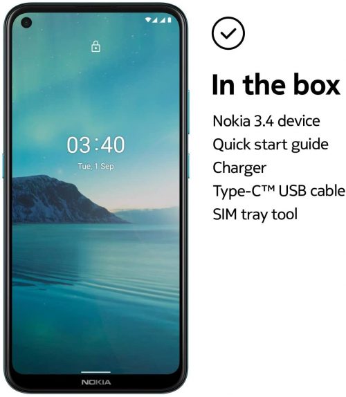 Upgrade to more phone and more power with Nokia 3.4. Maximize your streaming, binging and work on a 6.39 inch HD+ screen – with punch hole display that gives you even more screen real estate. Don’t sweat running out of juice with 2-day battery life. Get the perfect shot with powerful triple camera AI imaging – and take photos to the next level with Portrait mode, Night mode, and an ultrawide camera. Nokia 3.4 gives you style and durability all in one, plus easy access with fingerprint unlock. Plus, you can enjoy the latest Android features and security with 3 years of monthly security updates and 2 years of software upgrades. Which means you’ll get more out of your phone, for longer. Key Features: Enjoy all your favourite entertainment in 6.39 inch immersive HD+ with punch hole display for maximized screen real estate Charge less. Get up to 2 days on a single charge with the Adaptive Battery Capture the perfect shot with triple camera AI imaging, Portrait mode, Night mode and the ultrawide lens Google Assistant Button: Ask questions, see your schedule or even dim the lights with the Google Assistant Button Take in a truly timeless design that’s built to last, with a durable 3D Nano-textured rear cover and stunning finish in living colors Get up to 70% better performance compared to previous generations, thanks to the newest Qualcomm Snapdragon 460 mobile platform