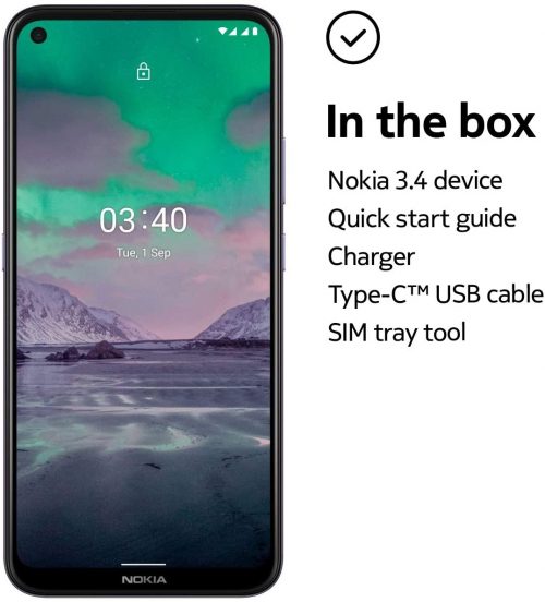 Upgrade to more phone and more power with Nokia 3.4. Maximize your streaming, binging and work on a 6.39 inch HD+ screen – with punch hole display that gives you even more screen real estate. Don’t sweat running out of juice with 2-day battery life. Get the perfect shot with powerful triple camera AI imaging – and take photos to the next level with Portrait mode, Night mode, and an ultrawide camera. Nokia 3.4 gives you style and durability all in one, plus easy access with fingerprint unlock. Plus, you can enjoy the latest Android features and security with 3 years of monthly security updates and 2 years of software upgrades. Which means you’ll get more out of your phone, for longer. Key Features: Enjoy all your favourite entertainment in 6.39 inch immersive HD+ with punch hole display for maximized screen real estate Charge less. Get up to 2 days on a single charge with the Adaptive Battery Capture the perfect shot with triple camera AI imaging, Portrait mode, Night mode and the ultrawide lens Google Assistant Button: Ask questions, see your schedule or even dim the lights with the Google Assistant Button Take in a truly timeless design that’s built to last, with a durable 3D Nano-textured rear cover and stunning finish in living colors Get up to 70% better performance compared to previous generations, thanks to the newest Qualcomm Snapdragon 460 mobile platform