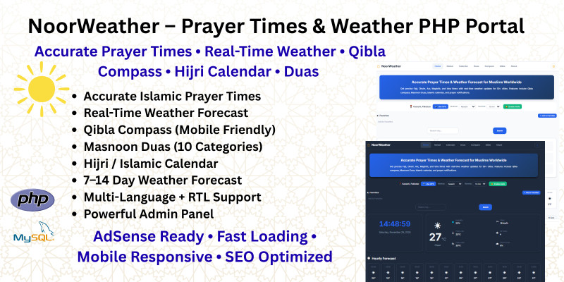 NoorWeather – Prayer Times And Weather Portal . Accurate Islamic prayer times, Qibla, Hijri calendar, Duas, and global weather with AQI. Fast, SEO-ready PHP portal with full admi