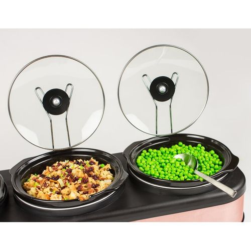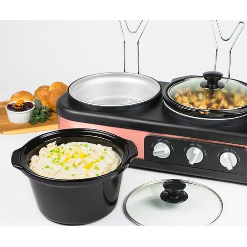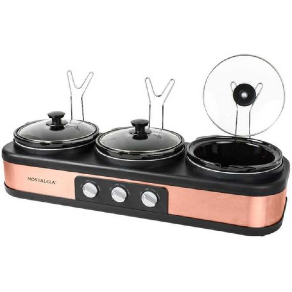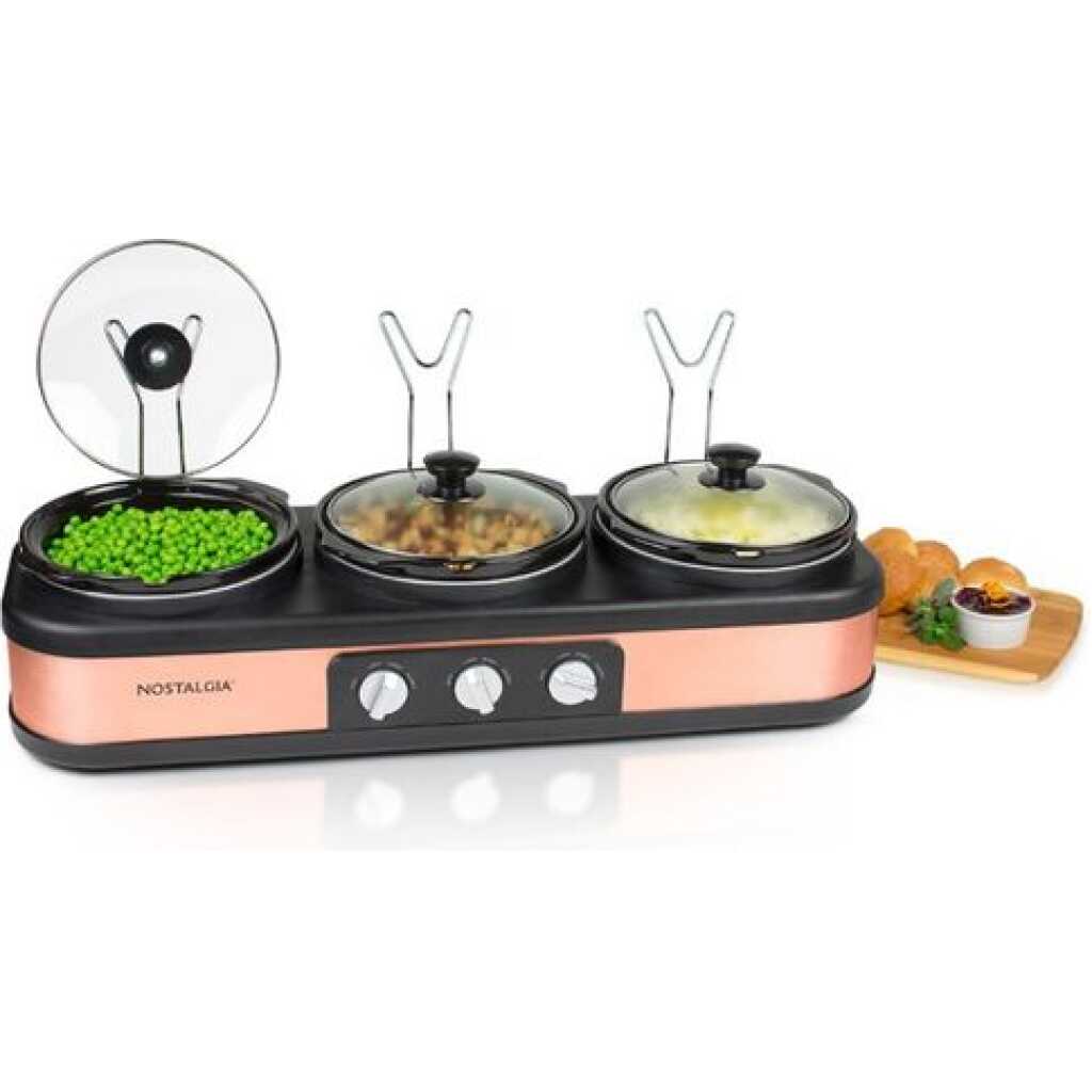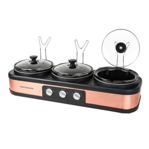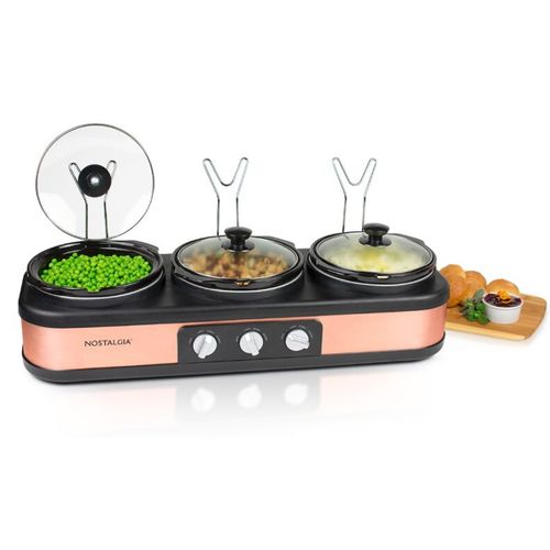 Nostalgia 3 Station Slow Cooker, Hot Plate, Buffet Pots & Food Warmers. Make entertaining effortless! Simultaneously slow cook and serve a delicious side dish, entree, and dessert in each of the 3 ceramic cooking pots to deliver a complete meal. Each ceramic pot has its own adjustable thermostat and the clear tempered glass lids allow for easy viewing. The built-in lid rest keeps countertops clear and cool-touch knobs and handles make it easy to transport.