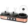 Key Features: Nostalgia 3 Station Slow Cooker, Hot Plate, Buffet Pots & Food Warmers. Individual thermostats for each cooking pot. Clear tempered glass lids. Cool-touch knobs and handles. Cooking pots remove from the base for easy cleaning. Contemporary black and stainless steel design.