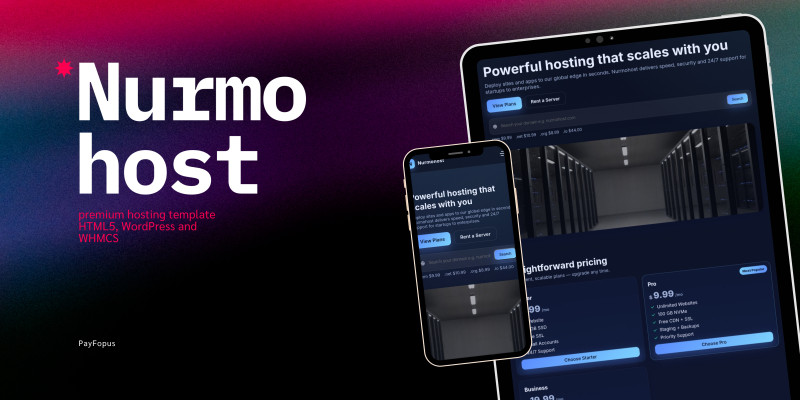Nurmohost – Hosting HTML5 WordPress Theme. Modern, responsive hosting template pack with HTML5, WordPress, and WHMCS versions. Fast, clean, and easy to customize.