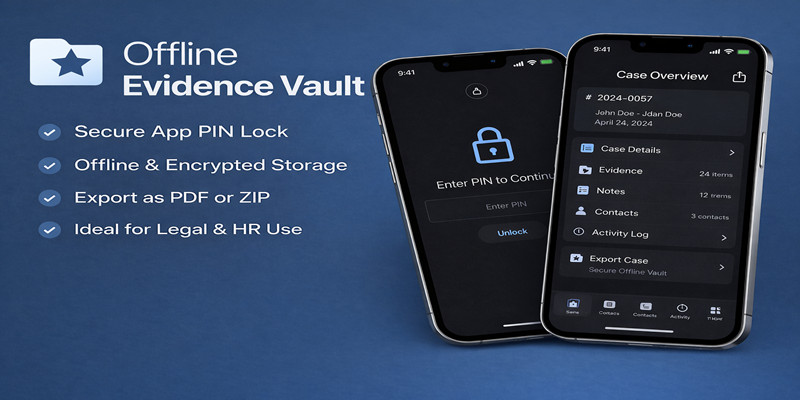 Offline Evidence Vault Pro - Secure Case Manager. Offline-first Flutter app to securely manage cases, store evidence, and export professional PDF or ZIP reports.
