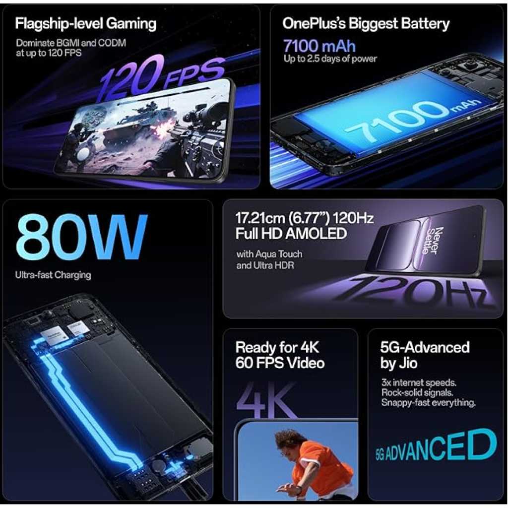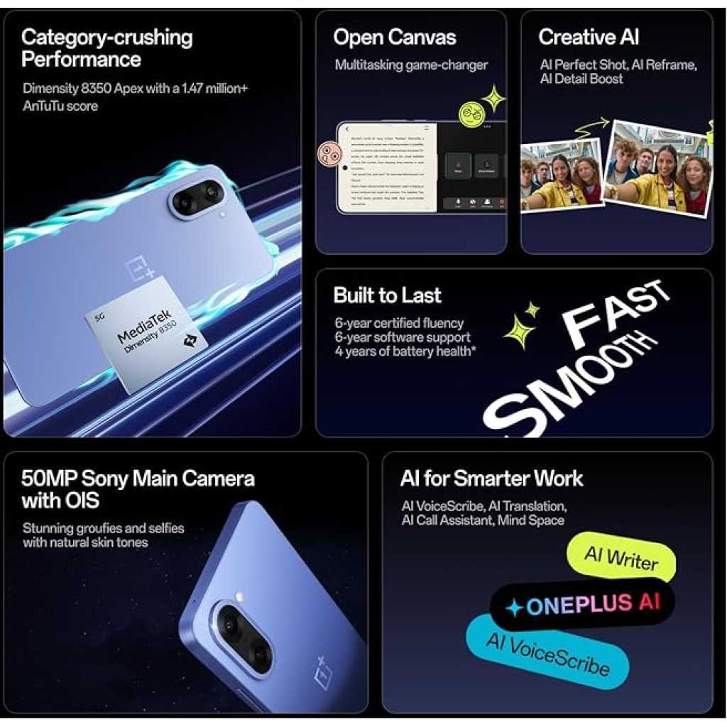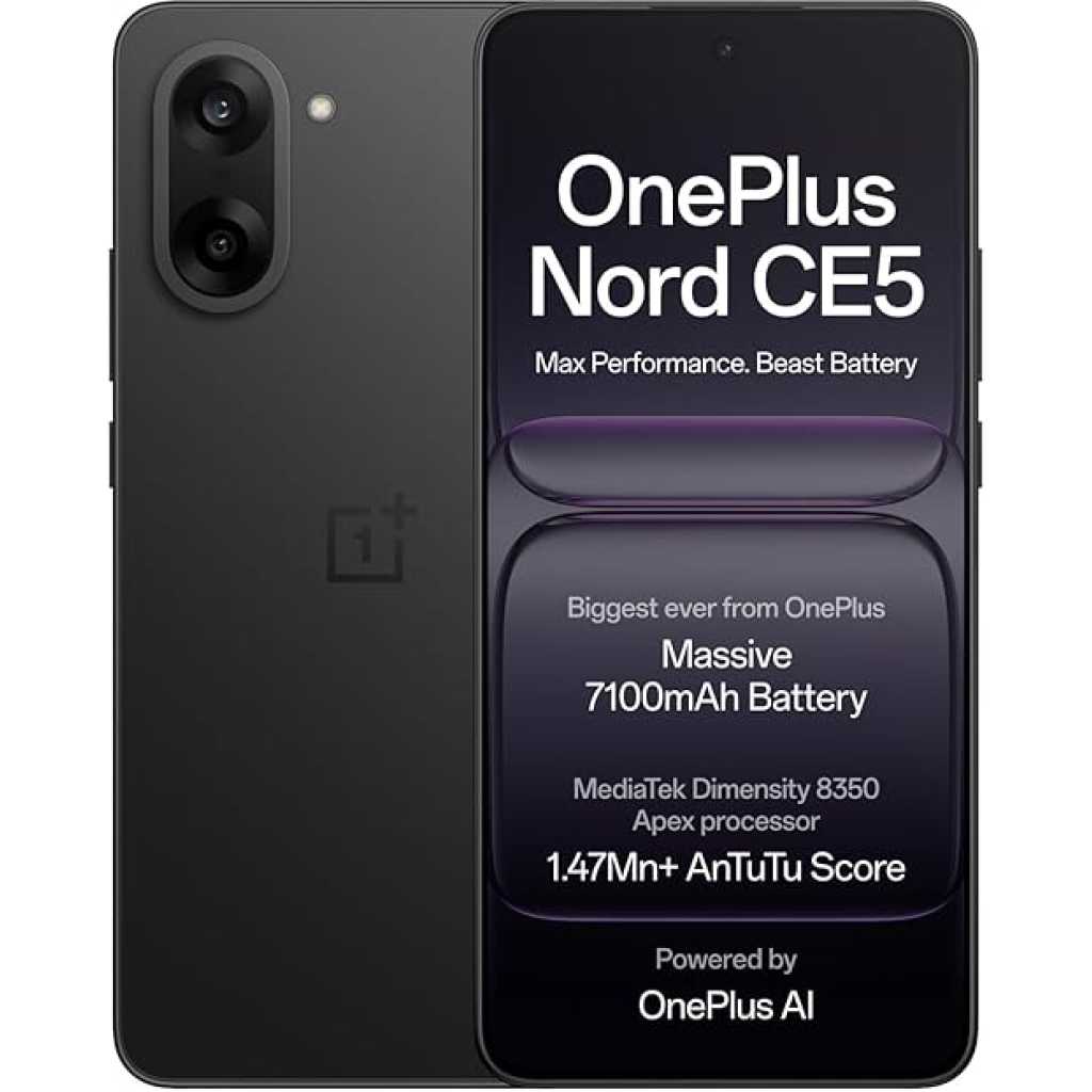 Key Features: OnePlus Nord CE5 8GB 128GB, Massive 7100mAh Battery, MediaTek Dimensity 8350 Apex, Powered by OnePlus AI, Black Infinity Flagship-class Performance with MediaTek Dimensity 8350 Apex: Benchmark-breaking 1.47 million+ AnTuTu score and up to 12GB of LPDDR5X RAM deliver ultra-smooth multitasking and snappy app responsiveness. 7100mAh – OnePlus’s Biggest Battery Ever with Bypass Charging: Up to 2.5 days of everyday use on a single charge – more streaming, scrolling, and gaming without interruption. Say goodbye to battery anxiety. Just 10 minutes of charging gives you 6+ hours of YouTube. And Bypass Charging powers the phone directly to reduce battery stress and extend gaming sessions. Dominate BGMI and CODM at up to 120 FPS: Ultra-fluid, lag-free gaming with high touch response rates gives you that split-second edge in every battle. 50MP Sony Main Camera with OIS: Shoot stunning 4K 60 FPS videos for Reels or Shorts and vibrant stills with OnePlus’s flagship RAW HDR algorithm. Vivid colors and natural skin tones mean every selfie and groufie looks crisp, clear and true to life. Dream Screen: 6.77” 120Hz AMOLED Display with Ultra HDR. Aqua Touch lets you confidently swipe even with wet or oily fingers. Enhance Photos with AI: Instantly turn good photos great and make your photo gallery Instagram-ready. With AI Best Face (fixes blinks/blurs), AI Eraser (removes photobombers), AI Detail Boost (for crisper shots), and more. Work Smarter with AI: Spend less time organizing and more time doing. With AI Mind Space (your searchable knowledge vault), AI Voice Scribe (instantly transcribes meetings/YouTube ), AI Call Assistant (translates/summarizes calls), and more.