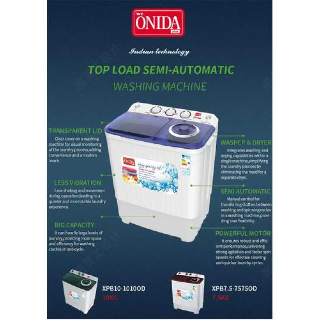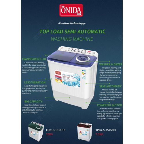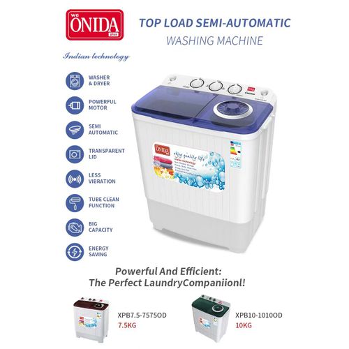 Onida Plus 5Kg Top Loading washing machine – Twin Tub Buy the super-efficient Onida Plus Washing Machine on TilyExpress.The unique technology that knows how to take care of your clothes while giving you the perfect wash. Super larger capacity, control, different wash cycles. Adjustable wash and spin time. Non-corrosive plastic body. This machine ensures your clothes stay as fresh and new for much longer than ever before. You can effortlessly and efficiently wash large loads of laundry in the Onida Top-loading Washing Machine. Built with a high-performance air dryer, this washing machine thoroughly removes excess water as well as moisture from your clothes, eliminating the need to dry them on the clothesline for a long time. And, regardless of the water level and laundry load, the magic lint filter in this washing machine traps lint and hard dirt, offering spotlessly clean clothes Highlights: Capacity Rainy days will not be a hassle, as the Onida Plus Top load washing machine comes with an adequate load. As a result, you can effortlessly wash your daily laundry and heavy clothes. Wash capacity 5kg Spin capacity 2.5kg Air Dryer Get rid of moisture in your clothes, as this washing machine is equipped with an Air Dryer that helps to remove excess water, thus keeping your clothes almost dried. Specifications 2 Sections: Electric Washer Drum & Electric Drain Drum Timer for washing process Timer for drying process Brand: Onida Plus Twin Tub 5Kg Capacity Semi Automatic Top Load Classic Design Drain Pump WHAT’S IN THE BOX Washing Machine User Manual Key Features: 2 Sections: Electric Washer Drum & Electric Drain Drum Timer for washing process Timer for drying process Brand: Onida Plus Twin Tub 5Kg Capacity Semi Automatic Top Load Classic Design Drain Pump