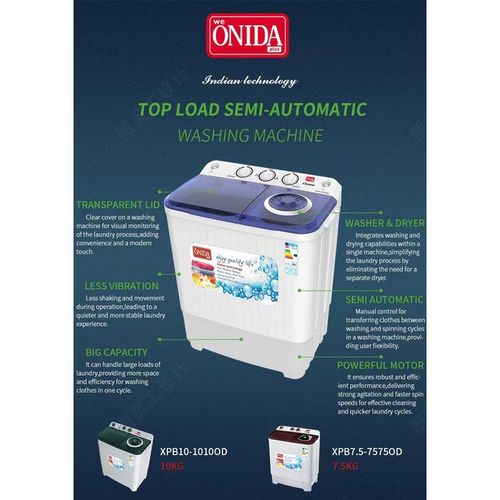 Key Features: 2 Sections: Electric Washer Drum & Electric Drain Drum Timer for washing process Timer for drying proces Brand: Onida Plus Twin Tub 6.5Kg Capacity Semi Automatic Top Load Classic Design Drain Pump