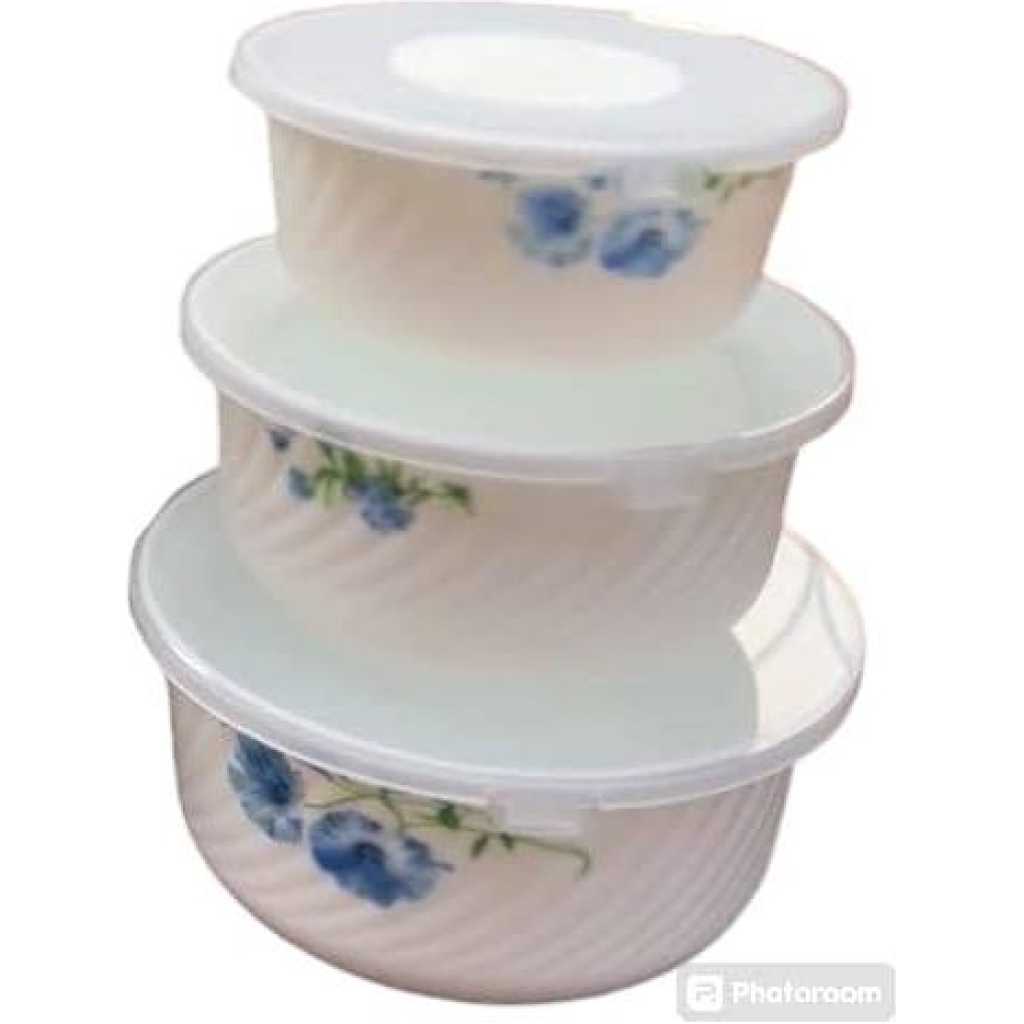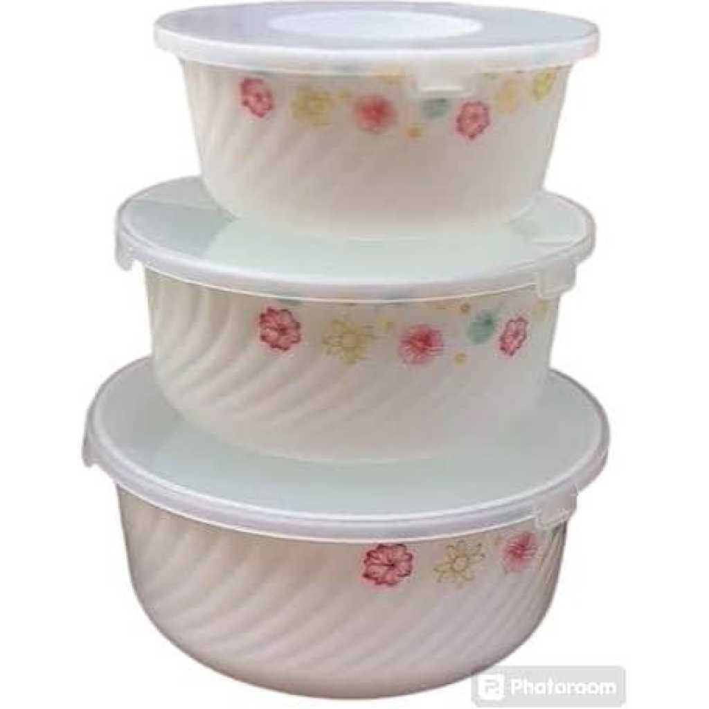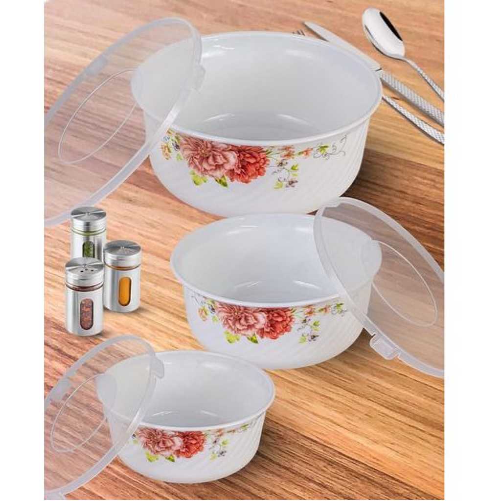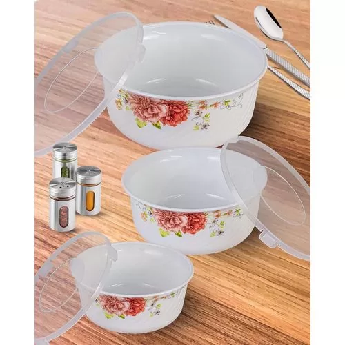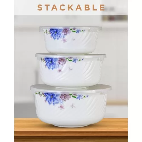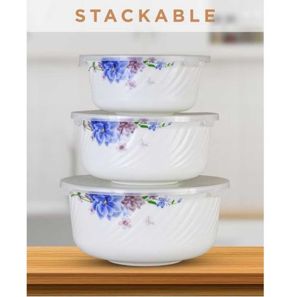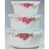 Opal 3 Piece Floral Serving Bowl Mixiing Bowl Set (1500ml, 1000ml, 500ml), Microwave Safe, Heat and Break Resistant with Plastic Lids- Multicolor