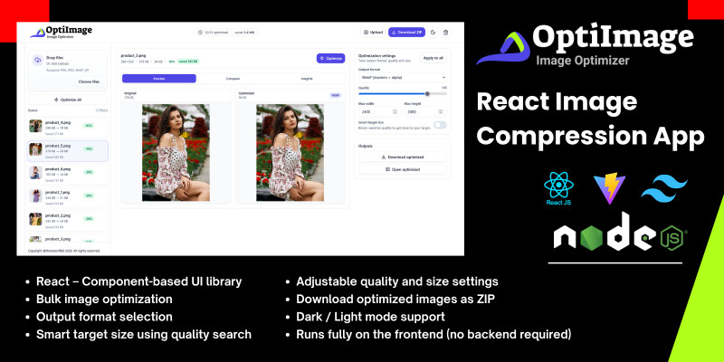 OptiImage – React Image Compression App. Powerful React image compression tool with smart target size, quality control, and ZIP download.