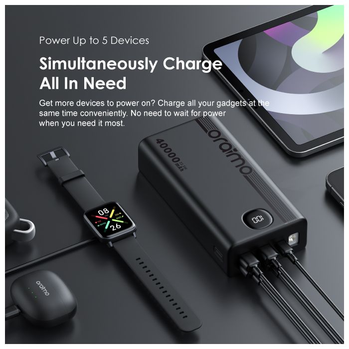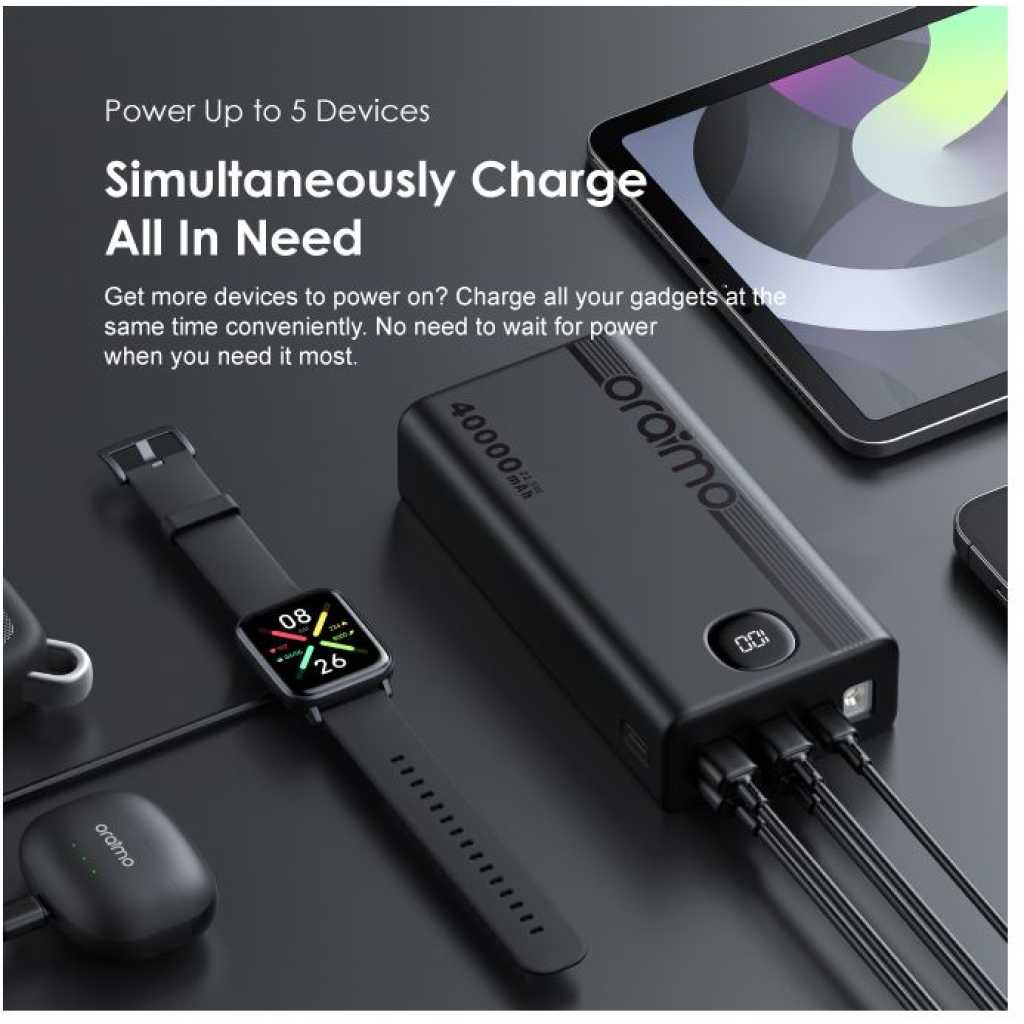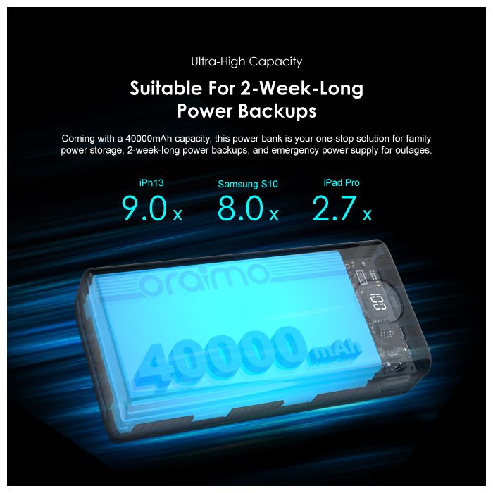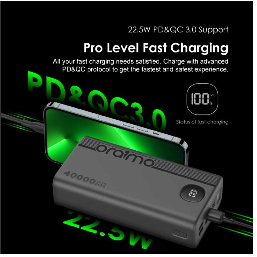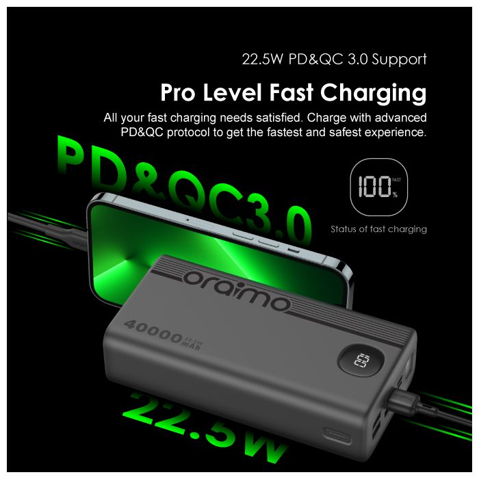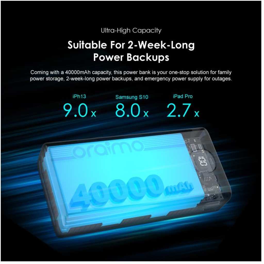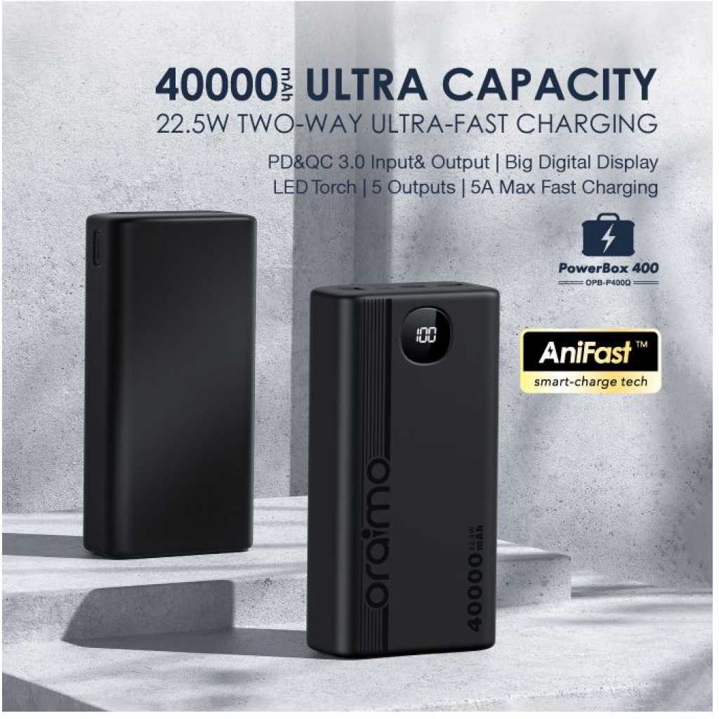 Oraimo 40000mAh Power Bank PowerBox 400 22.5W PD QC 3.0 Ultra-high Capacity 40000mAh Power Bank. Product Parameters: Capacity: 40000mAh (148Wh) Input 1(Type-C): 5V 3A,9V 2A Input 2(Micro-USB): 5V 2A,9V 2A Output 5(Type-C): 5V 3A,9V 2.2A,12V 1.5A Output 1 (USB-A): 5V 3A,5V 4.5A,4.5V 5A,9V 2A,12V 1.5A Output 2 (USB-A): 5V 3A,5V 4.5A,4.5V 5A,9V 2A,12V 1.5A Output 3 (USB-A): 5V 3A Output 4 (USB-A): 5V 3A Product Features: 22.5W PD&QC 3.0 Support – Pro Level Fast Charging All your fast charging needs are satisfied. Charge with advanced PD&QC protocol to get the fastest and safest experience. Ultra-High Capacity – Suitable For 2-Week-Long Power Backups Coming with a 40000mAh capacity, this power bank is your one-stop solution for family power storage, 2-week-long power backups, and emergency power supply for outages. Big Digital Display – Know Your Power Status In A Glance An accurate remaining power display always gives you the exact percentage of power left in the cell. Built-in Bright LED Torch-Break Through the Darkness for You Built-in bright LED light can be used as a torch, or as emergency lighting in darkness. Double-click the power button to turn the flashlight on or off. Type-C & Micro-USB Dual Input – High-speed Recharging The 2A Micro-USB input design enables you to fully recharge this power bank quickly. Type-C port supports both power input and power output. 5 Outputs – Simultaneously Charge All In Need (4 USB-A,1 Type-C) Get more devices to power on? Charge all your gadgets at the same time conveniently. No need to wait for power when you need it most. AniFast™ Technology – Safer, Faster, and More Compatible The built-in AniFast™ chip intelligently detects the optimal charging protocol to use to deliver the fastest charge for all kinds of devices. It’s also more robust in voltage surges and high temperature. Key Features: Oraimo 40000mAh Power Bank PowerBox 400 22.5W PD QC 3.0 Ultra-high Capacity 40000mAh Power Bank. ✔22.5W PD&QC3.0 ✔Ultra-high Capacity ✔Big Digital Display ✔5- Outputs ✔5A Output Max ✔LED Torch ✔Improved Durability ✔Fast-charging Notification