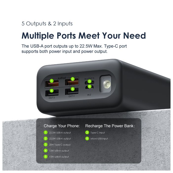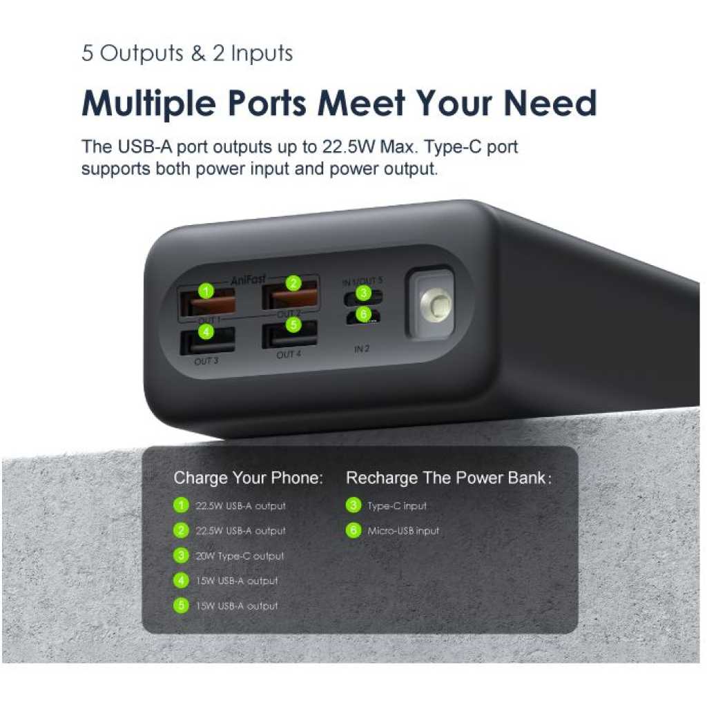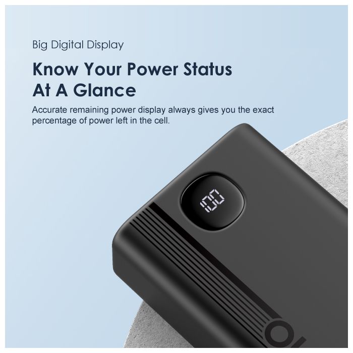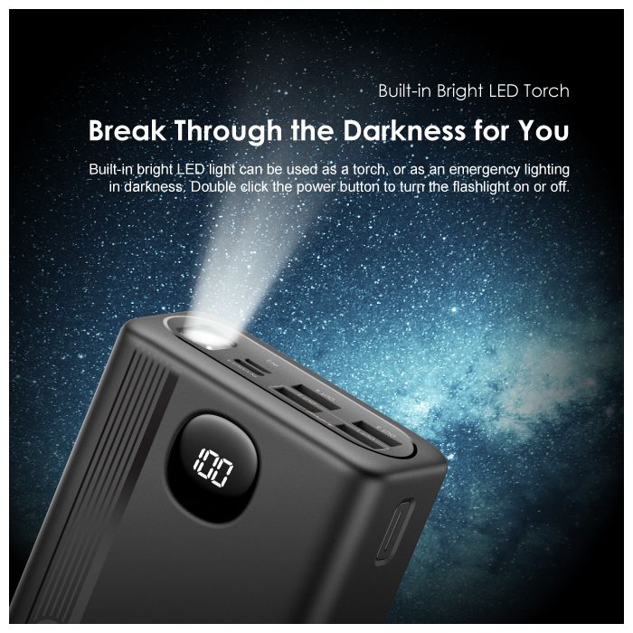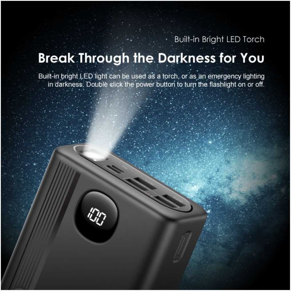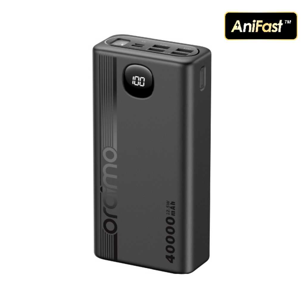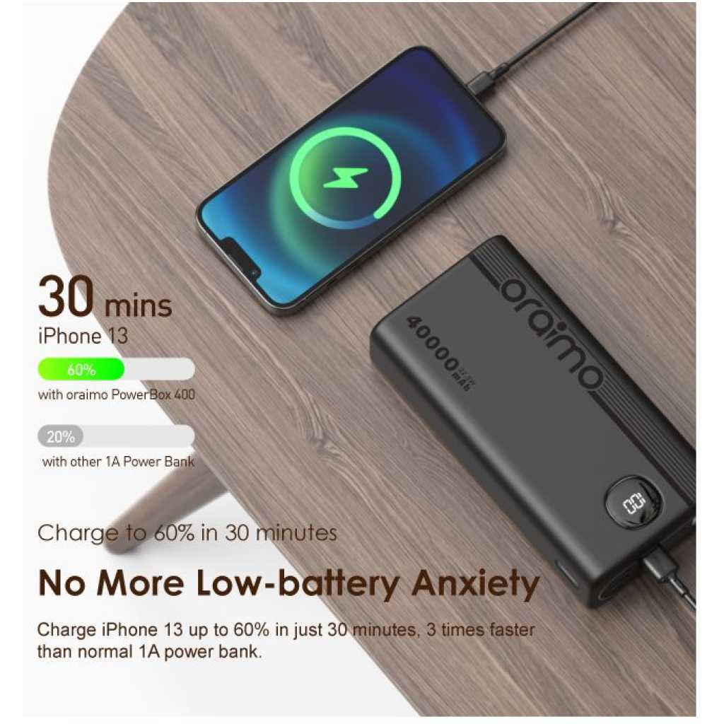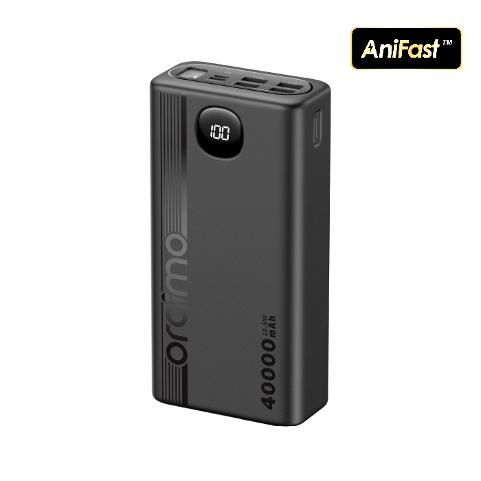 Oraimo 40000mAh Power Bank PowerBox 400 22.5W PD QC 3.0 Ultra-high Capacity 40000mAh Power Bank. Product Parameters: Capacity: 40000mAh (148Wh) Input 1(Type-C): 5V 3A,9V 2A Input 2(Micro-USB): 5V 2A,9V 2A Output 5(Type-C): 5V 3A,9V 2.2A,12V 1.5A Output 1 (USB-A): 5V 3A,5V 4.5A,4.5V 5A,9V 2A,12V 1.5A Output 2 (USB-A): 5V 3A,5V 4.5A,4.5V 5A,9V 2A,12V 1.5A Output 3 (USB-A): 5V 3A Output 4 (USB-A): 5V 3A Product Features: 22.5W PD&QC 3.0 Support – Pro Level Fast Charging All your fast charging needs are satisfied. Charge with advanced PD&QC protocol to get the fastest and safest experience. Ultra-High Capacity – Suitable For 2-Week-Long Power Backups Coming with a 40000mAh capacity, this power bank is your one-stop solution for family power storage, 2-week-long power backups, and emergency power supply for outages. Big Digital Display – Know Your Power Status In A Glance An accurate remaining power display always gives you the exact percentage of power left in the cell. Built-in Bright LED Torch-Break Through the Darkness for You Built-in bright LED light can be used as a torch, or as emergency lighting in darkness. Double-click the power button to turn the flashlight on or off. Type-C & Micro-USB Dual Input – High-speed Recharging The 2A Micro-USB input design enables you to fully recharge this power bank quickly. Type-C port supports both power input and power output. 5 Outputs – Simultaneously Charge All In Need (4 USB-A,1 Type-C) Get more devices to power on? Charge all your gadgets at the same time conveniently. No need to wait for power when you need it most. AniFast™ Technology – Safer, Faster, and More Compatible The built-in AniFast™ chip intelligently detects the optimal charging protocol to use to deliver the fastest charge for all kinds of devices. It’s also more robust in voltage surges and high temperature. Key Features: Oraimo 40000mAh Power Bank PowerBox 400 22.5W PD QC 3.0 Ultra-high Capacity 40000mAh Power Bank. ✔22.5W PD&QC3.0 ✔Ultra-high Capacity ✔Big Digital Display ✔5- Outputs ✔5A Output Max ✔LED Torch ✔Improved Durability ✔Fast-charging Notification