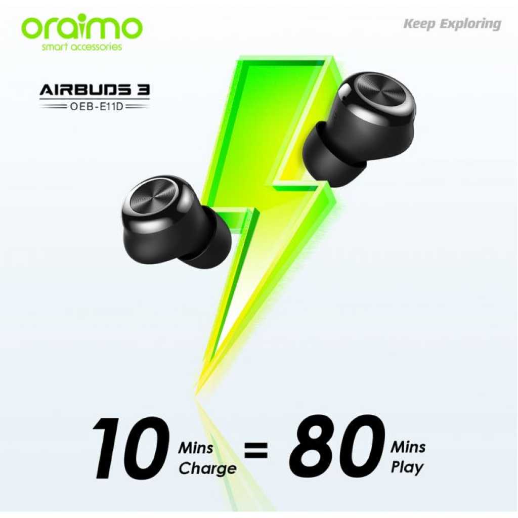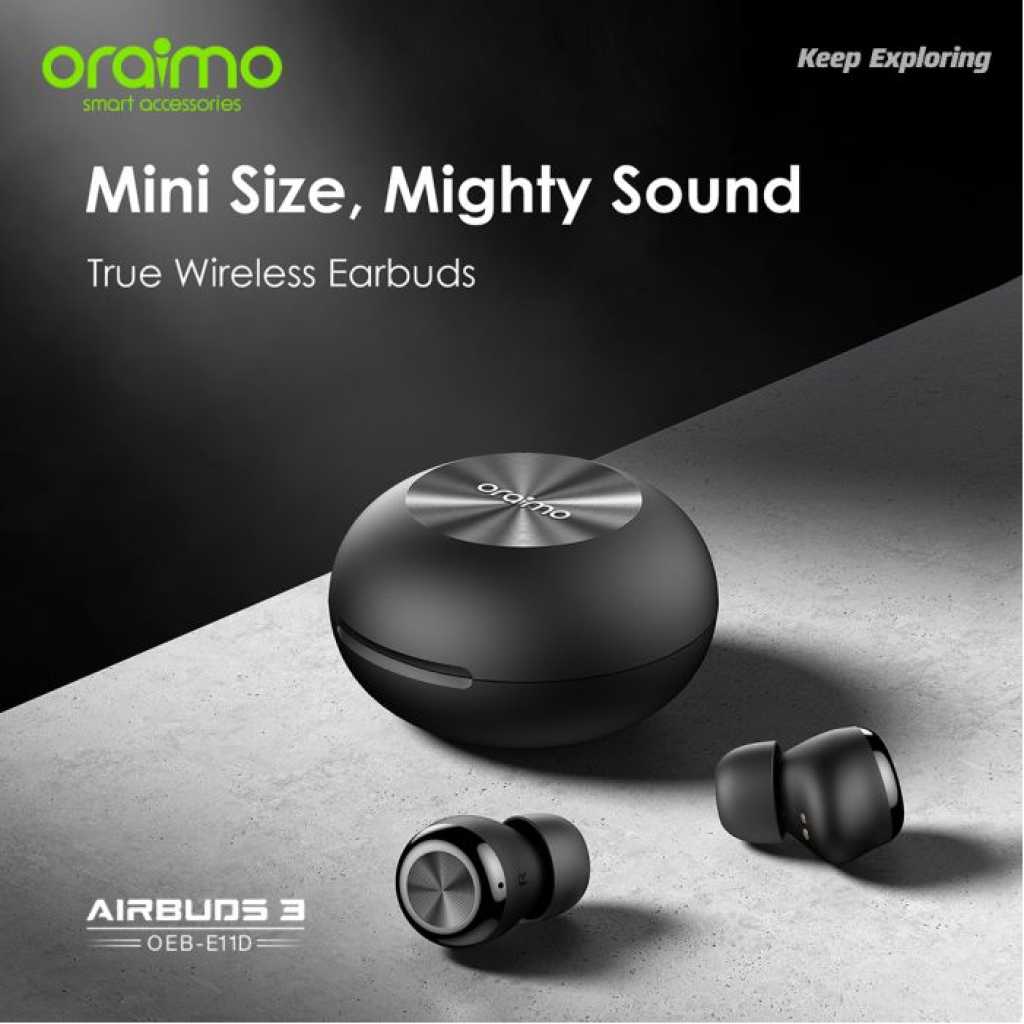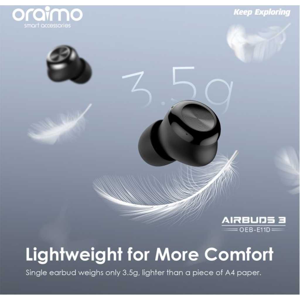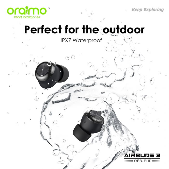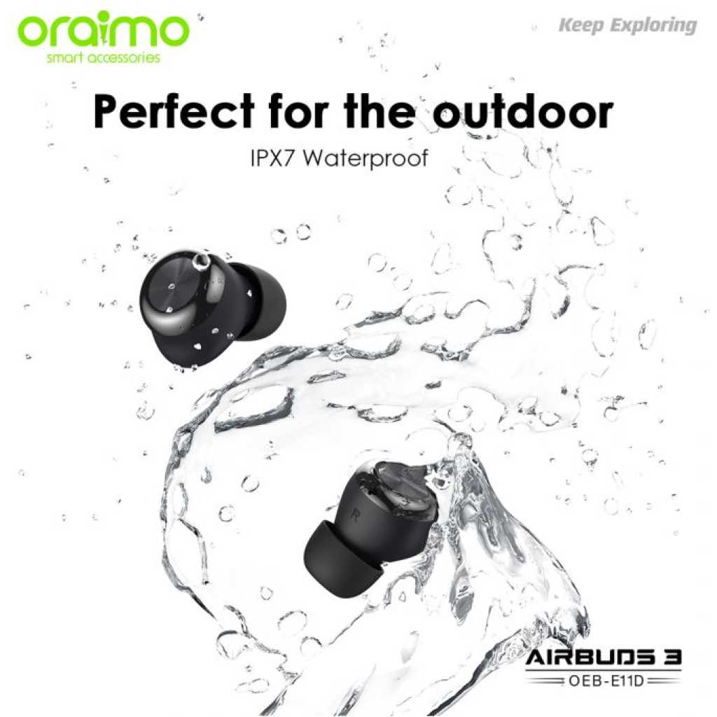 Key Features: Oraimo AirBuds 3 Powerful Bass IPX7 Waterproof TWS True Wireless Earbuds, Headsets OEB-E11D – Black. ✔IPX7 Waterproof ✔Powerful Bass ✔ Noise-Reducing Microphones ✔Compact and Comfortable ✔20-hour Playtime ✔Low-latency Game Mode