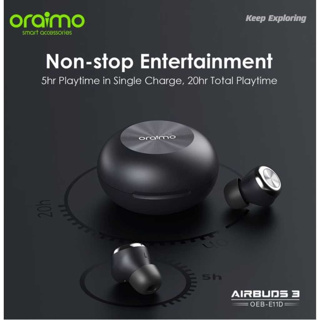 Oraimo AirBuds 3 Powerful Bass IPX7 Waterproof TWS True Wireless Earbuds, Headsets OEB-E11D – Black. Product Parameters: BT Version: V5.2 Range: 10m Battery Playtime: 5 hrs on single charge; case provides additional 15 hrs Charge Input: Type-C * Lab test result. Product Features: IPX7 Waterproof-Perfect for the Outdoor Rains and sweat won’t stop you-oraimo AirBuds 3 is designed with an IPX7 water resistance rating, so that you can still enjoy music during a workout or outdoor activity, never fear of anything. Standard of IPX7 Waterproof: The product can be used normally if it is placed in 1 meter of water and soaked for 30 minutes. Powerful Bass-Incredible Audio Experience Thanks to specially designed 6mm drivers with premium composite diagram , they reproduce clear vocal in mid and high range frequencies as well as punchy bass for truly dynamic sound. oraimo bass boost EQ makes the bass to another incredible level. ENC 2-mic Algorithm -Ensure Clear Calls AI microphone noise reducing algorithm will effectively shield your calls from environmental noise, making your voice can be heard in the calls clearly even you are on a noisy bus. Compact and Comfortable- Ergonomic Design for a Better Fit 4g super lightweight of single earbud, combining an ergonomic shape that matches the ear cavity perfectly, oraimo AirBuds 3 fit in your ears for long-time comfort. There’s even no problem if you wear L&R earbuds backward. BT 5.2- Low-latency Game Mode By long pressing one earbud you can turn on Game Mode to enjoy seamless and lag-free gaming on Bluetooth devices. 20-hr Playtime-Non-stop Entertainment 5-hour playtime on a single charge, and the portable charging case provides extra 15-hour playtime. Now you can enjoy a full-day listening.