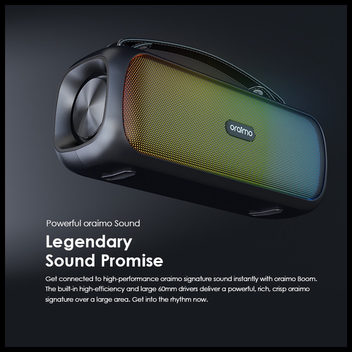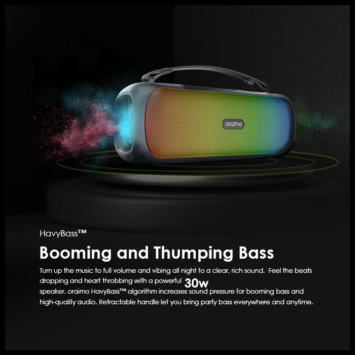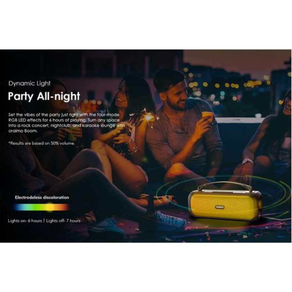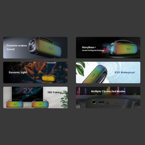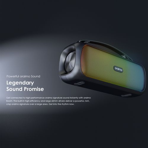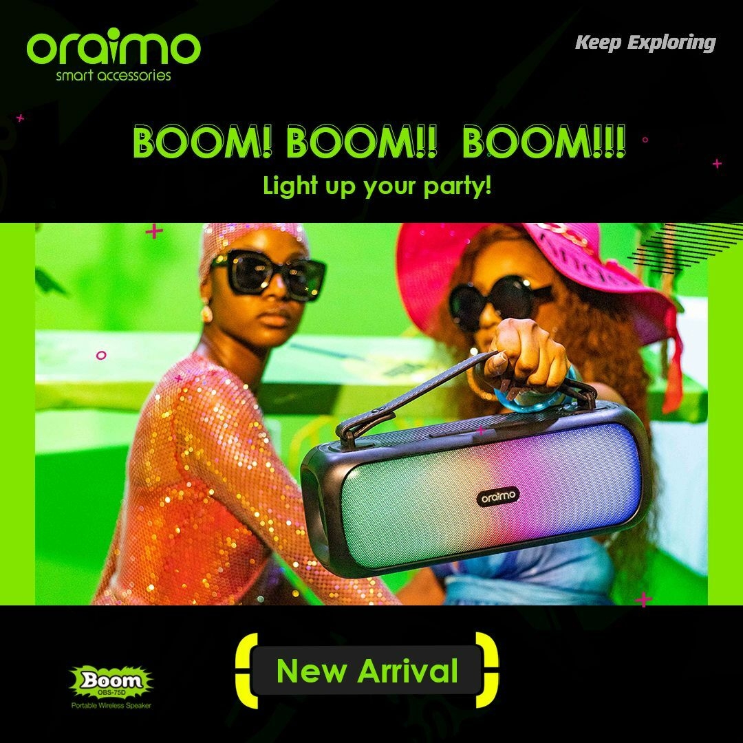 Oraimo Boom Powerful Sound Portable Wireless Speaker OBS-75D. Features: HavyBass- Heavy-duty and Thumping Bass Turn up the music to full volume and vibing all night to a clear, rich sound. Feel the beats dropping and heart throbbing with a powerful 30W speaker. oraimo HavyBass™ algorithm increases sound pressure for booming bass and high-quality audio. Retractable handle let you bring party bass everywhere and anytime. Dynamic Light Effects- Party All-night Set the vibes of the party just right with the four-mode RGB LED effects for 6 hours of playing. Turn any space into a rock concert, nightclub, and karaoke lounge with oraimo Boom. IPX5 Waterproof- True Party Music Freedom From the park to the beach, IPX5 Splash Resistant of oraimo Boom got you all covered. TWS Pairing- Wider Stereo Sound You can connect two speakers wirelessly for wider stereo sound. Multiple Connected Modes- Easy Pairing, Various Playing Indulge in music like never before with multiple connectivity modes- FM, Bluetooth, AUX, USB, built-in mic and line-in mic. Specifications: Size: 360*132*133mm BT Version: V5.0 BT Range: 10m Frequency Response: 85Hz-16KHz Battery Capacity: 3600mAh Play Time: 6 hours(Lights On); 7 hours (Lights Off) Speaker Output: 30W Model: OBS-75D Key Features: Oraimo Boom Powerful Sound Portable Wireless Speaker OBS-75D. HavyBass- Heavy-duty and Thumping Bass Dynamic Light Effects- Party All-night IPX5 Waterproof- True Party Music Freedom TWS Pairing- Wider Stereo Sound Multiple Connected Modes- Easy Pairing, Various Playing