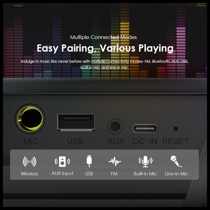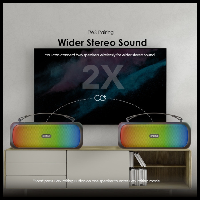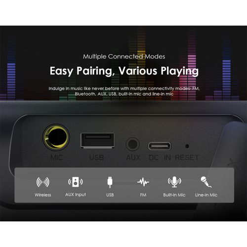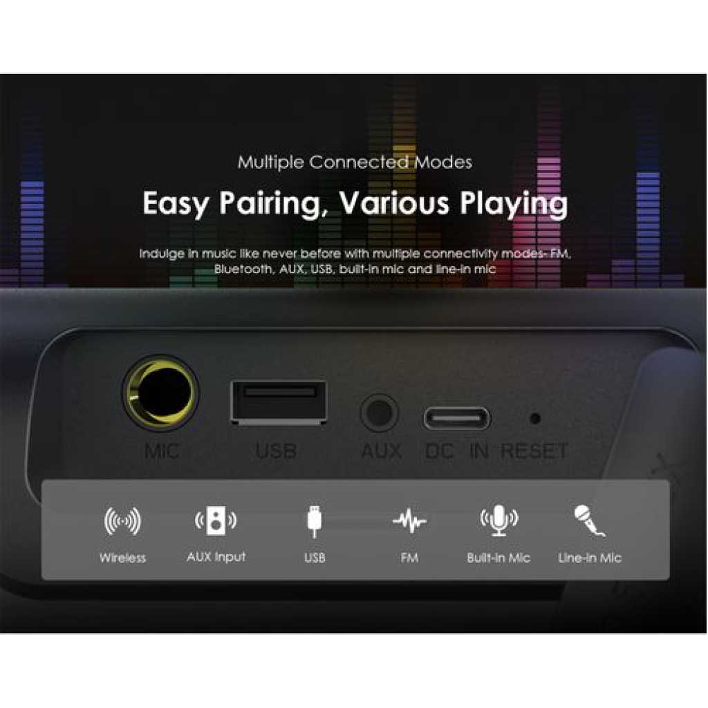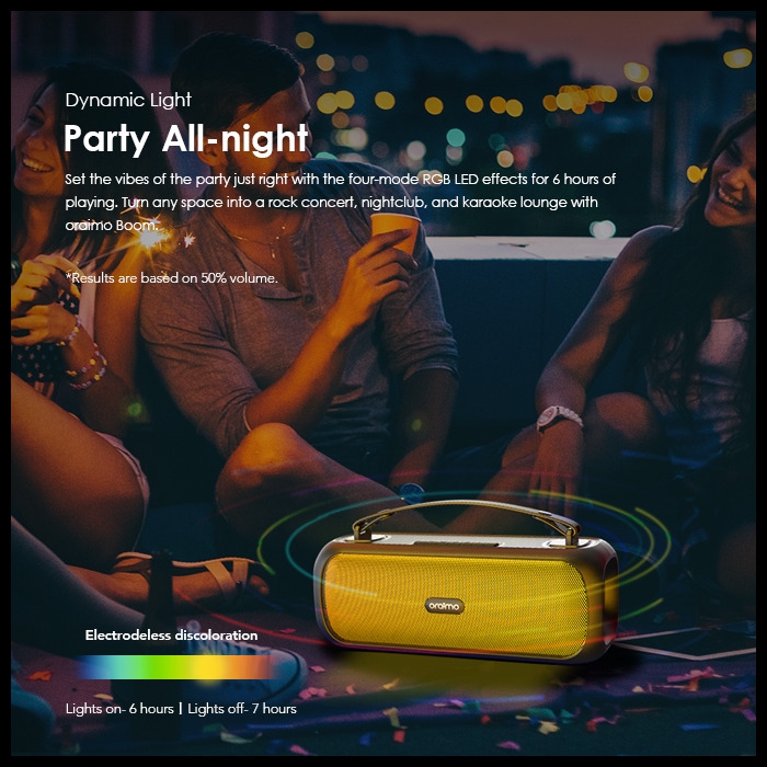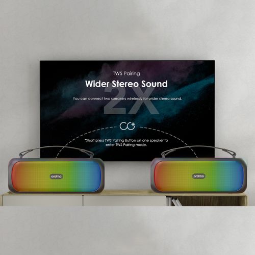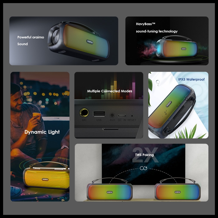 Oraimo Boom Powerful Sound Portable Wireless Speaker OBS-75D. Features: HavyBass- Heavy-duty and Thumping Bass Turn up the music to full volume and vibing all night to a clear, rich sound. Feel the beats dropping and heart throbbing with a powerful 30W speaker. oraimo HavyBass™ algorithm increases sound pressure for booming bass and high-quality audio. Retractable handle let you bring party bass everywhere and anytime. Dynamic Light Effects- Party All-night Set the vibes of the party just right with the four-mode RGB LED effects for 6 hours of playing. Turn any space into a rock concert, nightclub, and karaoke lounge with oraimo Boom. IPX5 Waterproof- True Party Music Freedom From the park to the beach, IPX5 Splash Resistant of oraimo Boom got you all covered. TWS Pairing- Wider Stereo Sound You can connect two speakers wirelessly for wider stereo sound. Multiple Connected Modes- Easy Pairing, Various Playing Indulge in music like never before with multiple connectivity modes- FM, Bluetooth, AUX, USB, built-in mic and line-in mic. Specifications: Size: 360*132*133mm BT Version: V5.0 BT Range: 10m Frequency Response: 85Hz-16KHz Battery Capacity: 3600mAh Play Time: 6 hours(Lights On); 7 hours (Lights Off) Speaker Output: 30W Model: OBS-75D Key Features: Oraimo Boom Powerful Sound Portable Wireless Speaker OBS-75D. HavyBass- Heavy-duty and Thumping Bass Dynamic Light Effects- Party All-night IPX5 Waterproof- True Party Music Freedom TWS Pairing- Wider Stereo Sound Multiple Connected Modes- Easy Pairing, Various Playing