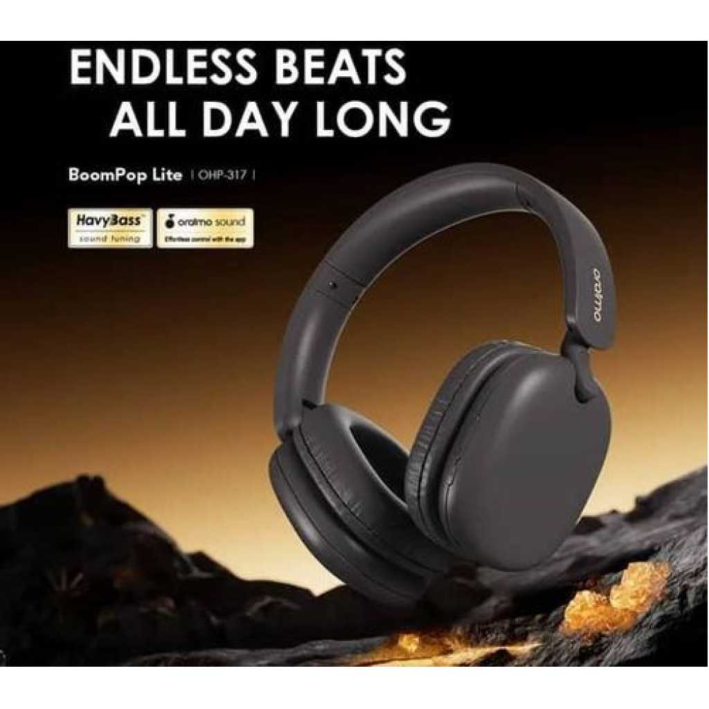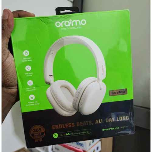 Key Features: Powerful Bass Dual-Device Connectivity Game Mode ENC Technology Ani Fast Charging Oraimo BoomPop Lite ENC Over-Ear Wireless Headphones OHP-317 Specifications Battery Life: Up to 65 hours in Bluetooth mode. Quick Charging: Charge for 10 minutes and enjoy up to 600 minutes of playback. Connectivity: Bluetooth 5.3 and a 3.5mm AUX cable. Bluetooth Range: ≥10 meters. Speaker Diameter: 40mm. Charging Port: Type-C USB port. Dual Device Connectivity: Allows pairing with two devices simultaneously, enabling seamless switching between calls and gaming sessions. Low-Latency Game Mode: Enhances gaming experience with instant audio-video synchronization by activating low-latency mode via the M button