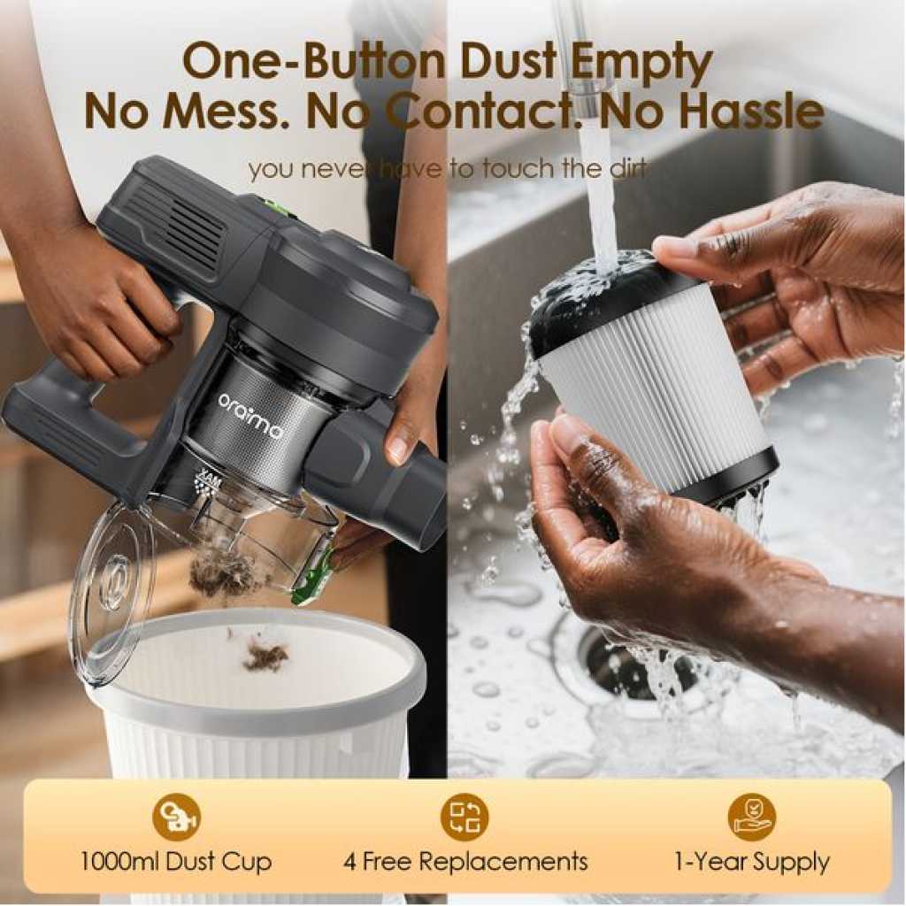 Key Features: High-Efficiency Suction: Strong motor power delivers deep cleaning on carpets and hard floors. 5-Stage Sealed Filtration: Includes HEPA, foam, metal, and post-motor filters to trap fine dust and allergens. One-Button Dust Empty: Hygienic disposal without touching dirt. Adjustable Telescopic Rod: Customizable length for comfortable cleaning. Self-Standing Design: Stands upright without wall support for easy storage. Detachable Battery: Swap batteries for extended cleaning sessions. 6-in-1 Versatility: Suitable for multiple surfaces and cleaning needs.