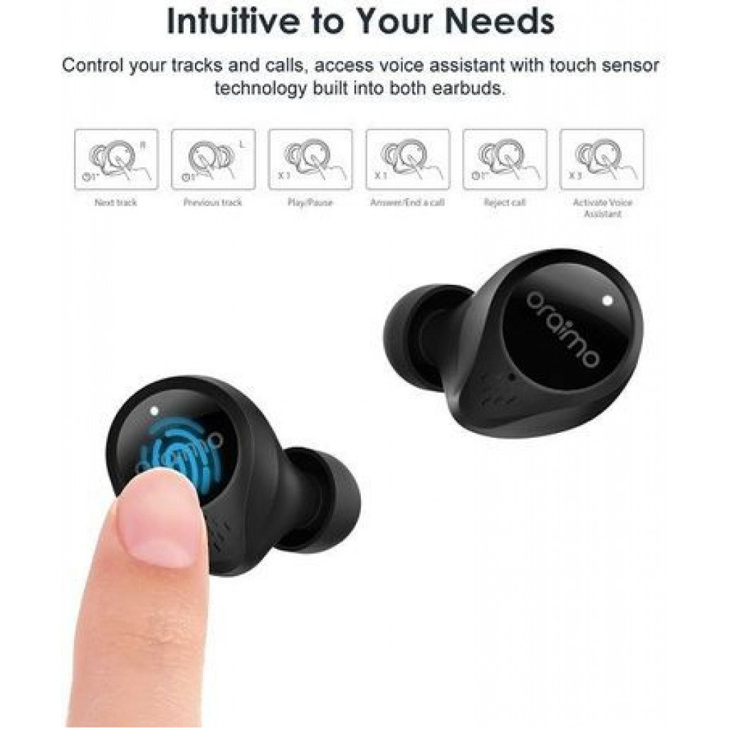 Oraimo Earbuds-2 Super Bass Wireless Stereo Earbuds – Black Product Feature : BT Version: V5.0Range: 10mBattery Capacity: 40mAh(earbud), 400mAh(case)Battery Life: Up to 48 hours standby time / 5 hours playtime / 4 hours talk time / Case provides up to 3 full charges Case Input: Type-C Wire-Free, Hassle-Free No wires, no problem – just industry-leading BT5.0 technology in a minimalist design with smart features. Engineered for Ultimate Comfort Ergonomically designed earbud understands every contour of your ear, and fits in snugly for unmatched comfort and hours of listening pleasure. Intuitive to Your Needs Control your volume, music and calls, access voice assistant with force sensor technology built into both earbuds. Unrivaled Stereo Sound From classical to contemporary, every music genre is enhanced by the bespoke 13mm dynamic drivers of the earbud thanks to its deep bass, natural mids, and clear, detailed treble. Simultaneous, Low Latency Rather than relaying sound from one ear to the other, the newly developed BT chip transmits sound to the left and right ears simultaneously for an exceptional listening experience. Charge As You Go No need to worry about battery life, just place your earbuds in the carry case to charge on the go. 3.5-hour battery life is extended to up to 24.5 hours with the case. Always Connected One-Step Pairing ensures that after the initial setup, the earbuds will automatically connect to your device once removed from the charging case.