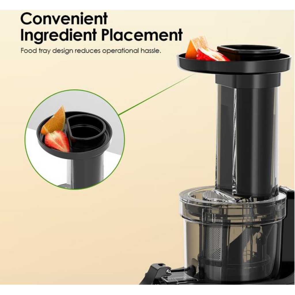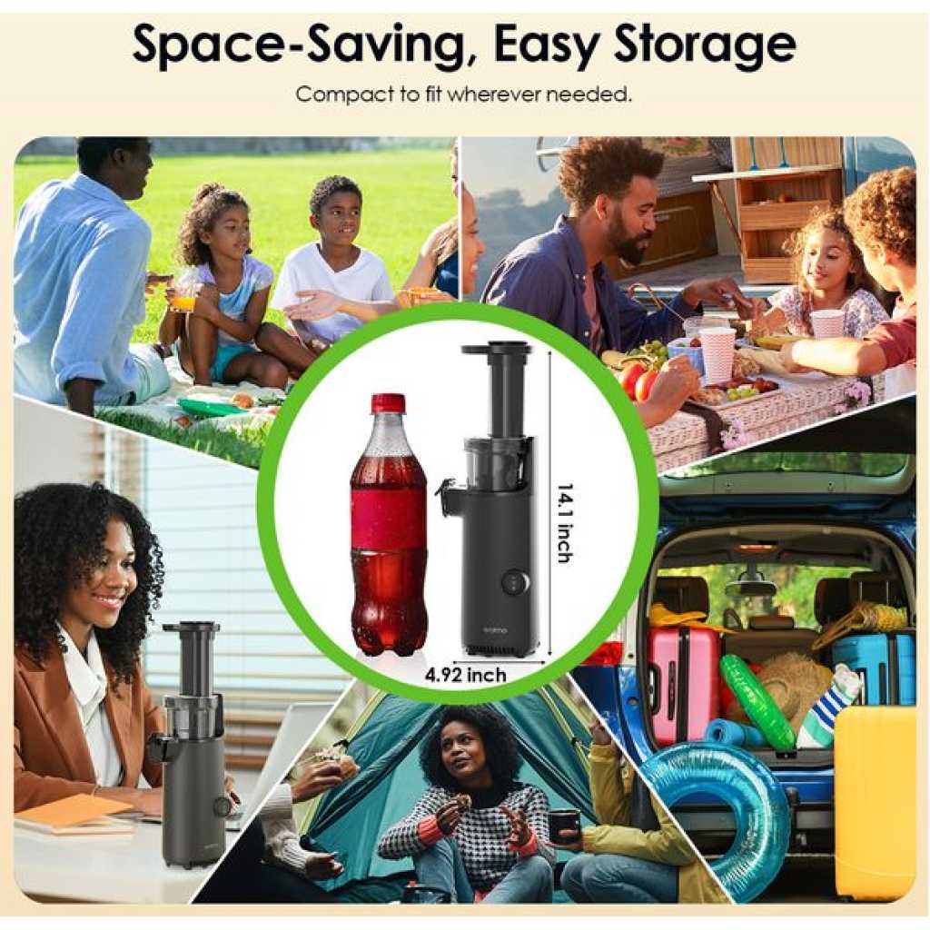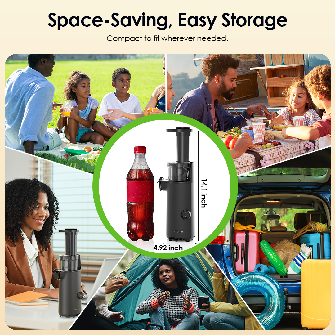 Key Features: Compact & Space-Saving: Slim, bottle-sized design fits easily on countertops or in storage. High Juice Yield: Extracts pure juice without adding water, preserving natural nutrients. Automatic Separation: Effortlessly separates pulp from juice for smooth results. Efficient Low-Oxidation Juicing: Non-metallic blade head minimizes oxidation for fresher juice. Reverse Function: Clears clogs instantly to keep juicing smooth. Quick Setup: Installs in seconds with simple 3-step assembly. Easy Cleaning: Three detachable parts rinse clean in about a minute. Quiet Operation: Works at less than 70 dB for comfortable use.