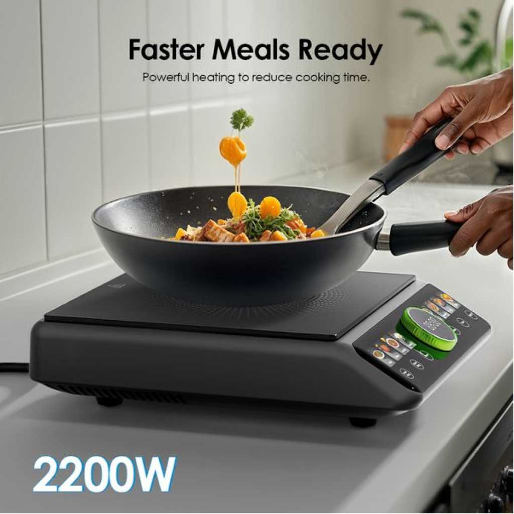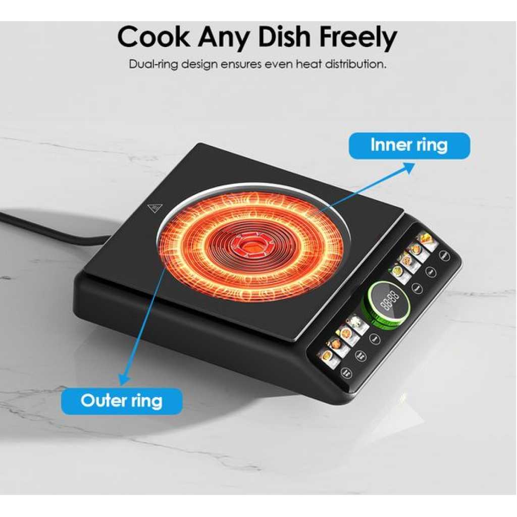 Key Features: Dual-Ring Even Heat Distribution: Inner and outer rings adjust to cookware size for perfectly even cooking. 2200W Powerful Heating: Rapid cooking that saves time for busy days. Universal Cookware Compatibility: Works with stainless steel, cast iron, aluminum, ceramic, and glass cookware. Smart Safety System: Stops heating automatically if no pot is detected and includes low liquid level protection. Explosion-Proof & Durable Panel: Heat-resistant ceramic design ensures long-term safety.