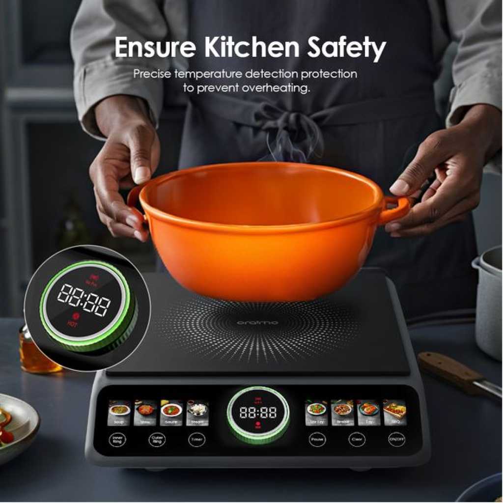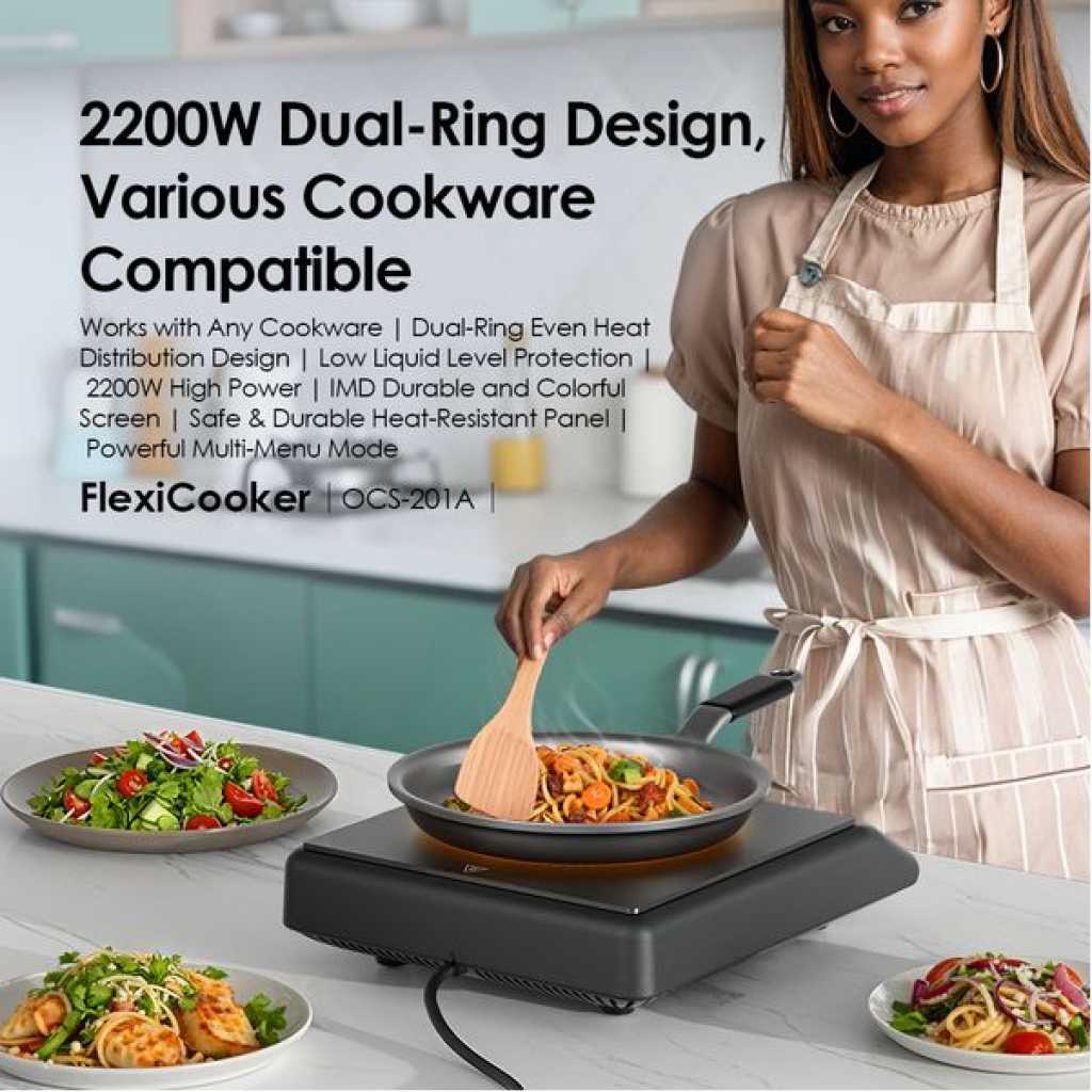 Product Material: PET+Glass-Fiber Prouduct Type: Electric Ceramic Hot Plate Rating Voltage: ~220V-240V 50/60Hz Rating Power: 2200W *oraimo Lab test results. Product Features: Unlimited Cooking Possibilities FlexiCooker works with all types of cookware Universal Compatibility, Limitless Cooking Optionsoraimo FlexiCooker supports stainless steel, cast iron, aluminum, ceramic, and glass cookware. Cook Any Dish Freely Dual-ring design ensures even heat distribution Flexible Heat Zones for Every DishAdjust between inner and outer rings to perfectly fit your cookware size. Ensure Kitchen Safety Low liquid level protection reduces fire risk Smart Safety FeatureAutomatically stops heating when no pot is detected, ensuring safe cooking. Faster Meals Ready Powerful heating to reduce cooking time Powerful Heating for Faster Meals2200W rapid heating reduces cooking time, perfect for busy days. Cook with Confidence Explosion-proof & durability panel for worry-free cooking Explosion-proof and heat-resistant Panel ensures long-term safety. Better Visual Experience Stylish interface, clear menu at a glance Stylish Design Meets Easy Operation Clear and vibrant display for seamless menu navigation. Effortless Cooking Variety 8 menu modes for various cooking tasks One Touch, Endless Meal OptionsPre-set programs simplify cooking for every occasion. What in the Box? FlexiCooker x 1 Welcome Guide x 1