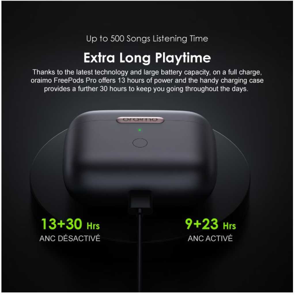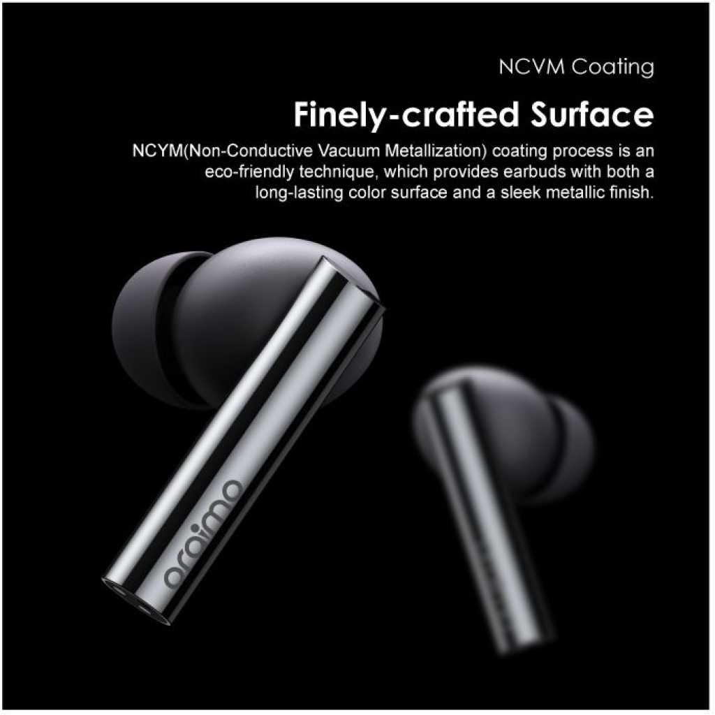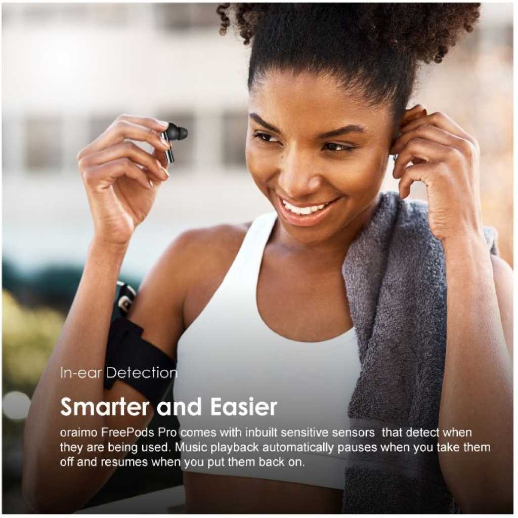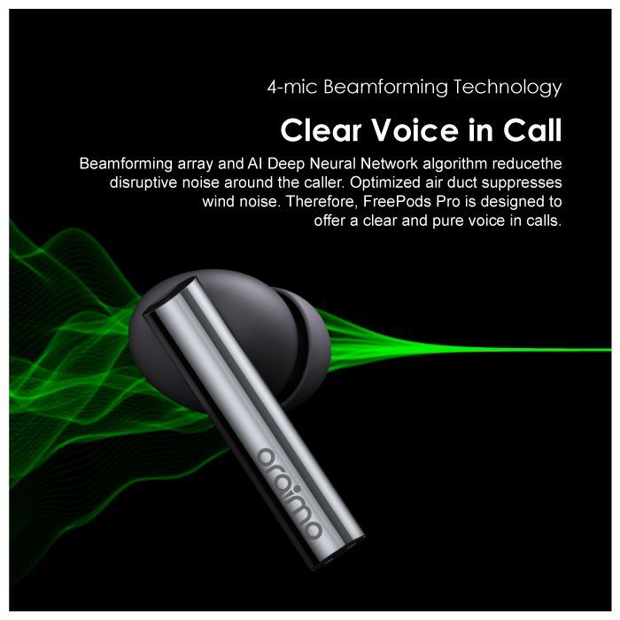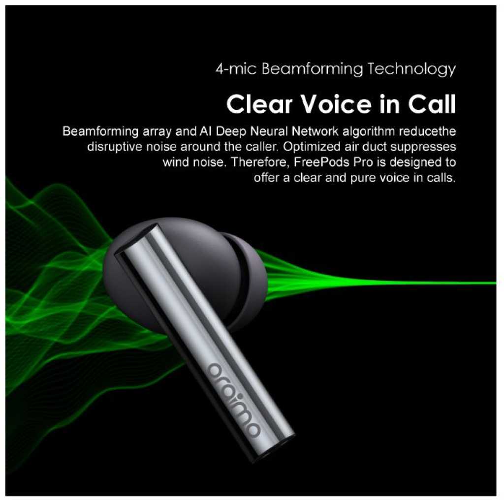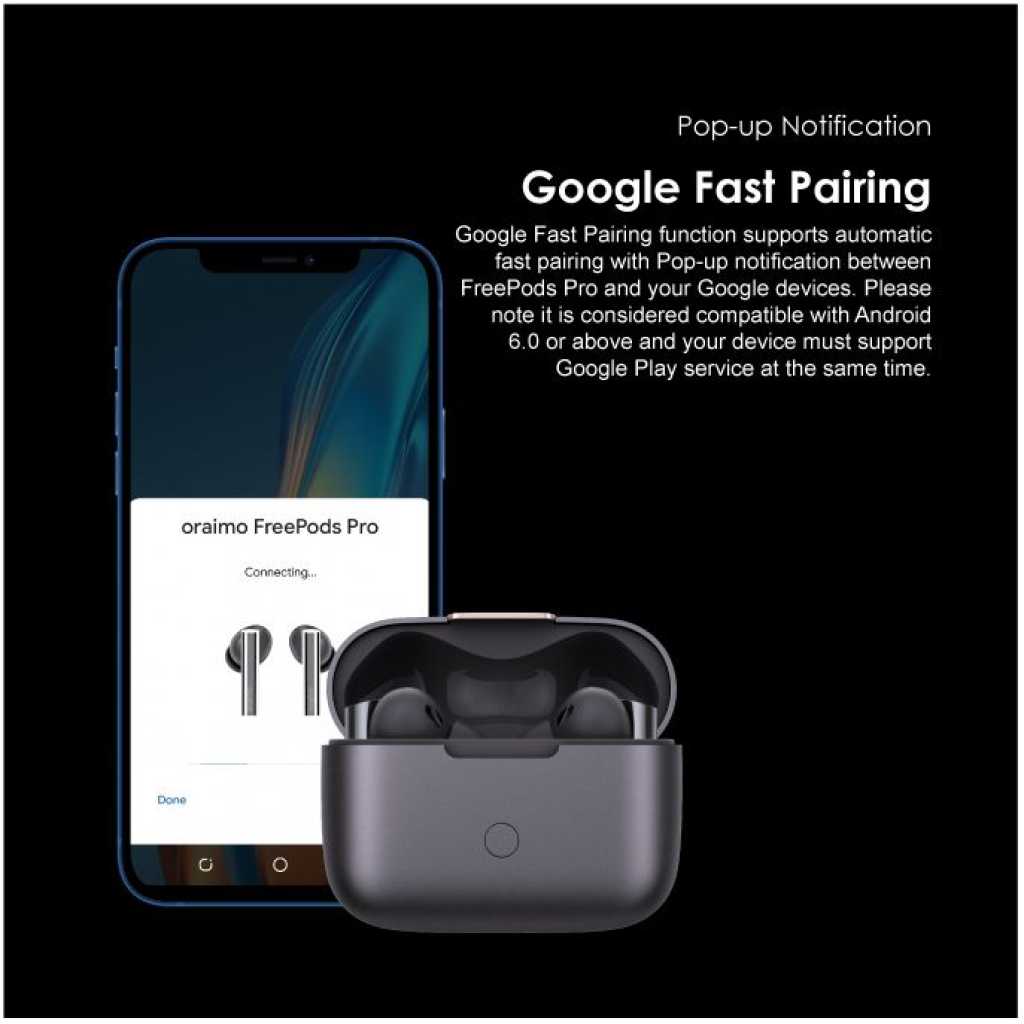 Oraimo FreePods Pro ANC Active Noise Cancellation TWS True Wireless Earbuds Headsets OEB-E108D – Black. BT Version: V5.2 Range: 10m Battery Capacity: 70mAh(earbud), 510mAh(case) Music Playtime: Up to 13 hours; Case provides additional 30 hours (ANC OFF) Up to 9 hours; Case provides additional 23 hours (ANC ON) Case Input: Type-C Product Features: Pro Hybrid Noise Cancellation Technology-Pure Listening Freedom oraimo designed Pro Hybrid Active Noise Cancellation Technology can get rid of up to 35dB noise for a quiet listening experience. oraimo FreePods Pro is your perfect companion for flying, riding trains, and buses. Start from now, embracing hour upon hour of pure listening freedom in this noisy world. Transparency for Ambient Awareness-Catch on What’s happening around You The Smart Transparency Mode lets ambient sound in while wearing earbuds. People can stay aware of what is going on around them, or carry out a short conversation without removing earbuds. HavyBass Dual EQ-Premium oraimo Sound You can switch between HavyBass Mode and Normal Mode to find the suitable sound effect you need in regards to different rhythms and beats. High-efficiency 8mm drivers made with composite diaphragm provide pristine and beautiful signature sound that can only be heard in oraimo FreePods Pro. 4-mic Beamforming Technology-Clear Voice in Call Beamforming array and AI Deep Neural Network algorithm reduce the disruptive noise around the caller. Optimized air duct suppresses wind noise. Therefore, FreePods Pro is designed to offer a clear and pure voice in calls. Up to 13+30 hrs Playing-Extra Long Playtime Thanks to the latest technology and large battery capacity, on a full charge, oraimo FreePods Pro offers 13 hours of power and the handy charging case provides a further 30 hours to keep you going throughout the days. In-ear Detection- Smarter and Easier oraimo FreePods Pro comes with inbuilt sensitive sensors that detect when they are being used. Music playback automatically pauses when you take them off and resumes when you put them back on. Pop-up Notification- Google Fast Pairing Google Fast Pairing function supports automatic fast pairing with Pop-up notification between FreePods Pro and your Google devices. It is considered compatible with Android 6.0 or above. Your device must also support Google Play services. Bluetooth 5.2- Low-latency Game Mode Supported by Bluetooth 5.2 transmission technology, low audio latency makes for enjoyable viewing and gaming experience, the sound is always stable. NCVM Coating- Finely-crafted Surface NCYM(Non-Conductive Vacuum Metallization) coating process is an eco-friendly technique, which provides earbuds with both a long-lasting color surface and a sleek metallic finish. Key Features: Oraimo FreePods Pro ANC Active Noise Cancellation TWS True Wireless Earbuds Headsets OEB-E108D – Black. Bluetooth Version: V5.2 Bluetooth Range: 10m Battery Capacity: 70mAh(earbud), 510mAh(case) Music Playtime: Up to 13 hours; Case provides additional 30 hours (ANC OFF) Up to 9 hours; Case provides additional 23 hours (ANC ON) Case Input: Type-C