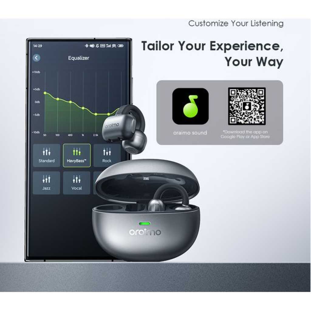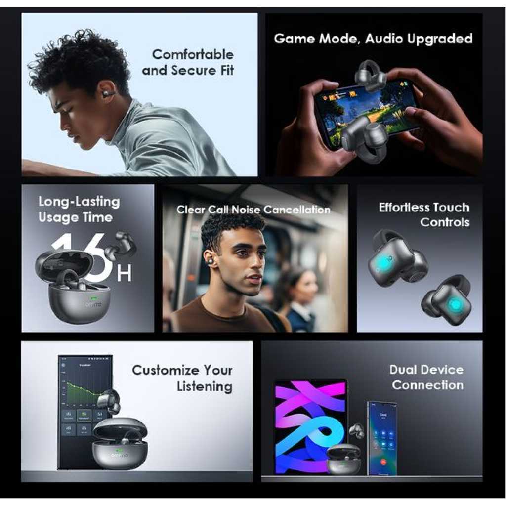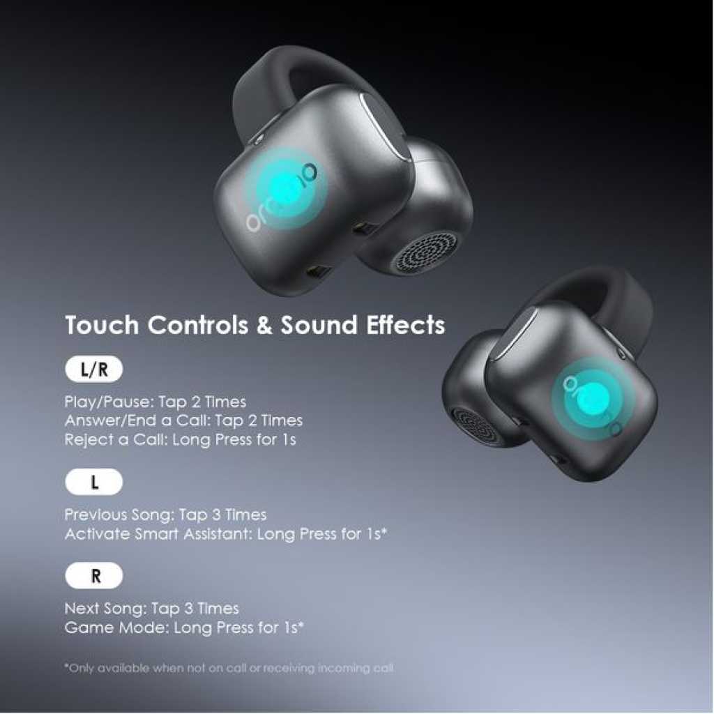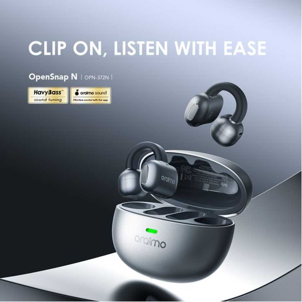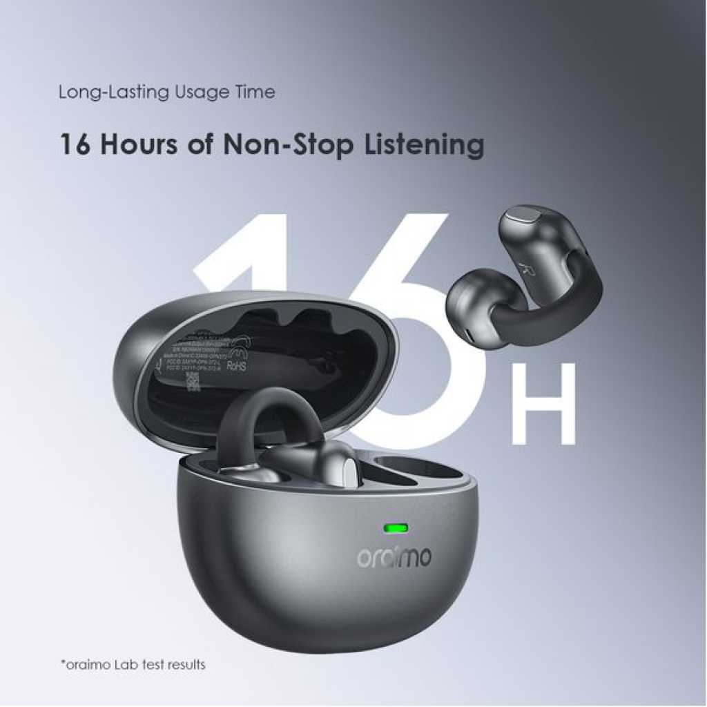 Bluetooth Version:V5.4 Range:10m Playtime:Up to 4 hours; the case provides an additional 12 hours Battery Capacity: 30 mAh(each earbud) Charging Time: Approx.1.5hours Charging Case Battery Capacity:300mAh Charging Time: Approx.2hours *If the charging case is fully recharged,it can charge the earbuds about 3 times. *oraimo Lab test results Product Features: Comfortable and Secure Fit All-Day Comfort, Zero Worries OpenSnap N’s clip-on design ensures a secure fit that won’t slip, no matter how you move. At just 4.7g, its ø0.4mm memory steel wire and soft silicone ensure all-day comfort. Game Mode, Audio Upgraded Audio and Video Sync in Moment Powered by Bluetooth 5.4 transmission technology, low audio latency and game mode EQ create an enjoyable viewing and gaming experience while the sound is seamlessly stable. Customize Your Listening Tailor Your Experience, Your Way Customize touch controls and sound via the app for a personalized experience.Boost bass, clear vocals, and adjust controls to fit your style. Enjoy music your way, anytime. Clear Call Noise Cancellation Crystal-Clear Calls, Anywhere Advanced noise cancellation technology ensures your voice is heard loud and clear, even in noisy environments. Long-Lasting Battery Life 16 Hours of Non-Stop Listening Enjoy up to 4 hours of continuous playback on a single charge, with an additional 12 hours from the charging case—perfect for all-day use. *oraimo Lab test results Touch Controls & Sound Effects *Only available when not on call Dual Device Connection Enjoy Seamless Transitions The dual-device connection feature can be enabled via the oraimo sound app. Automatically prioritize calls,you can connect and switch between two Bluetooth devices for a smoother, uninterrupted listening experience. Key Features: Lightweight clip‑on design for secure, slip‑free fit Ultra‑light 4.7g earbuds for all‑day comfort Bluetooth 5.4 for stable connection and low latency Game mode for synchronized audio and video App customization for sound tuning and touch controls Clear call noise cancellation for crisp voice calls Dual‑device connection for seamless switching Touch controls for music and function access Up to 16 hours total listening time with charging case