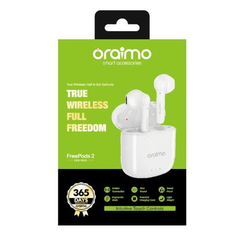 Oraimo FreePods-2 TWS True Wireless Stereo Earbud with Mic Product Feature:BT Version: V5.0Talk Range: 10mBattery Capacity: 37mAh(earbud), 500mAh (case)Battery Life: Up to 82 hours standby time / 3.5 hours playtime / 3 hours talk time / Case provides up to 6 full charges Rich Sound A 13mm dynamic driver produces sound with flawless accuracy and treble that sparkles full of detail. Comfortable Fit Earbuds are ergonomically designed to conform to the shape of your ear canal. A single earbud weighs only 3g, making it easier and more comfortable to wear. Stay Charged A handy and compact charging case allows you to extend 3.5 hours of music playtime to 24.5, so you can enjoy all-day use. Touch ControlsA force sensor on both earbuds allows you to effortlessly answer calls and adjust music with a simple touch. Instant ConnectionAfter the initial setup, the earbuds automatically connect to your paired device when removed from the case and disconnect when returned. Key Features: BT Version: V5.0 Talk Range: 10m Battery Capacity: 37mAh(earbud), 500mAh (case) Battery Life: Up to 82 hours standby time / 3.5 hours playtime 3 hours talk time Case provides up to 6 full charges