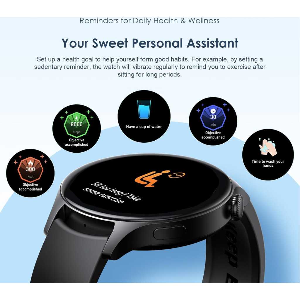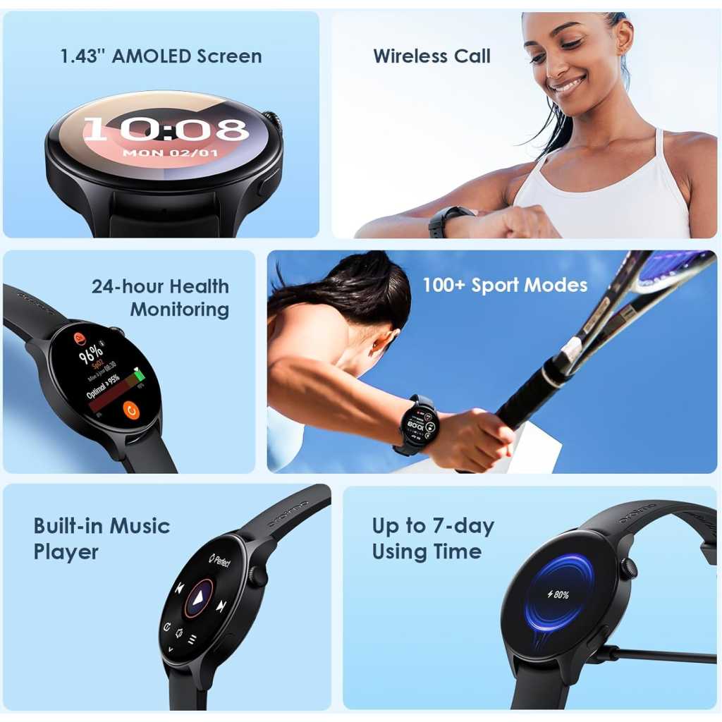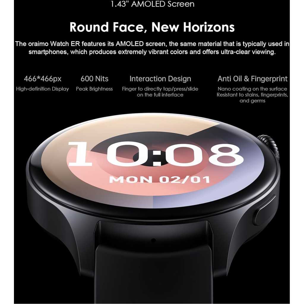 Key Features: Screen: 1.43″ AMOLED 466*466, COF Material: PC+ABS Battery Capacity:300mAh,4.35V Major Function : meter step、Bluetooth call、Heartrate、Blood Oxygen Waterproof:IP68