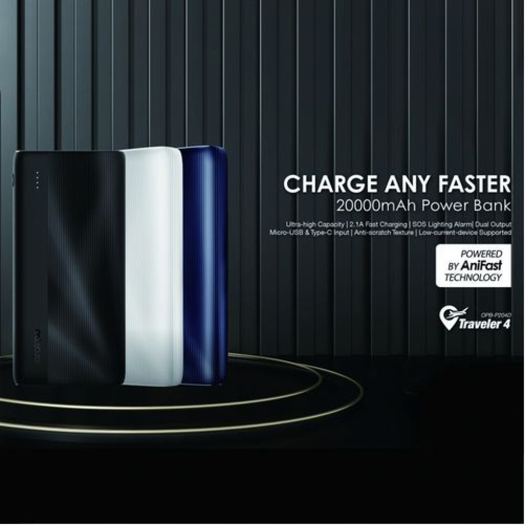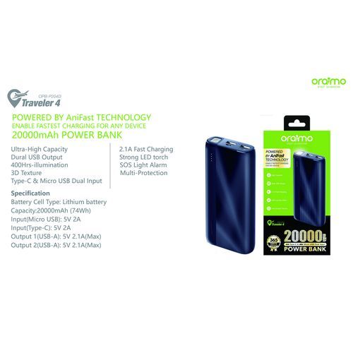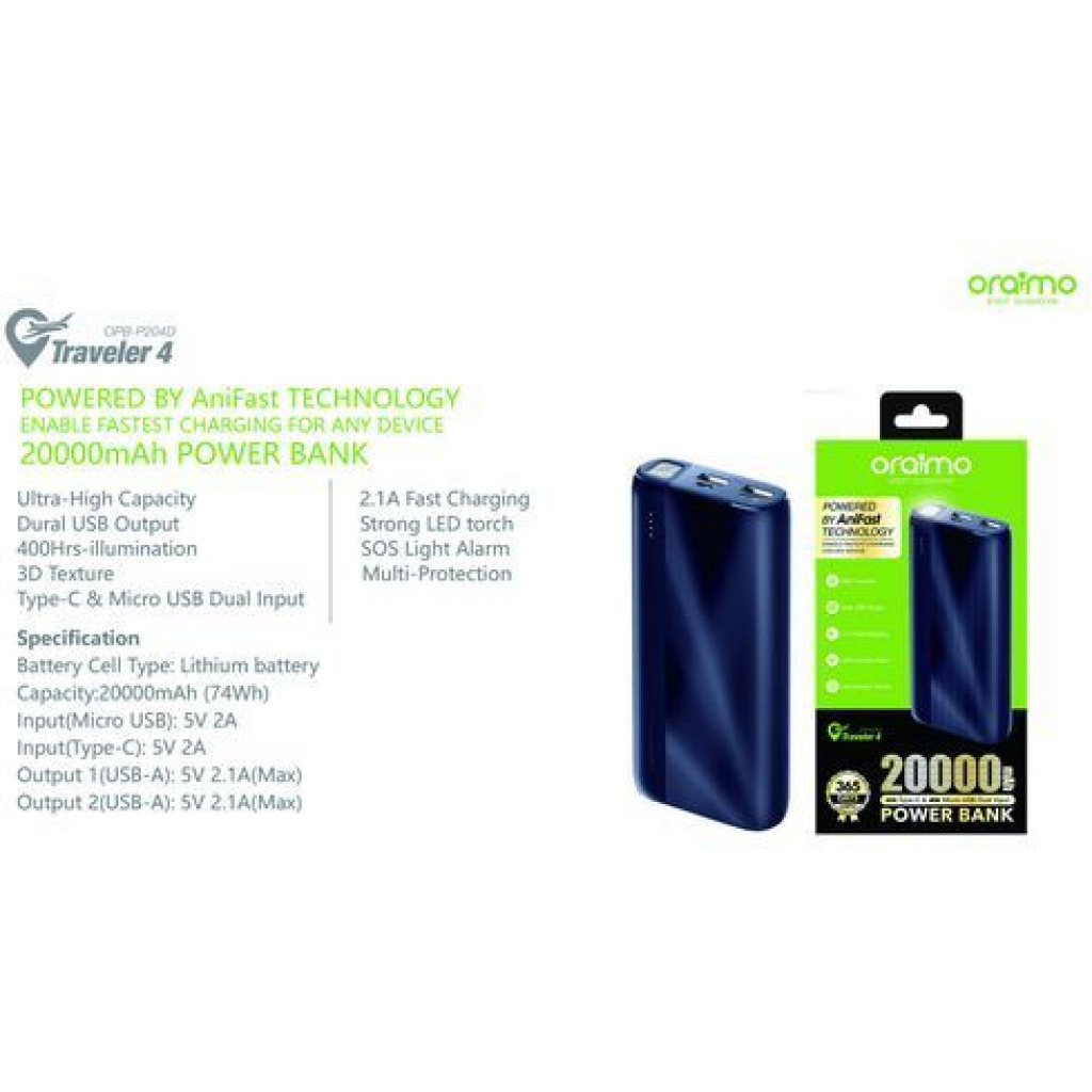 Oraimo Power Bank 20000mAh High Capacity Dual USB Output OPB-P204D – Black Features: You can easily slips it into any of your pockets or bags. Built-in safeguards protect your devices against excessive current, overheating, and overcharging. Suitable for charge most of digital devices, such as smartphones, tablets and other USB-powered devices. Dual charging port with oraimo Fast-Charging technology charges two devices at the same time – without sacrificing charging speed. Surge protection, short circuit prevention and more advanced safety features keep you and your devices safe. Specification: Battery Cell Type: Lithium battery Capacity:20000mAh (74Wh) Input(Micro USB): 5V 2A Input(Type-C): 5V 2A Output 1(USB-A): 5V 2.1A(Max) Output 2(USB-A): 5V 2.1A(Max) Packing List: 1 * Portable Source