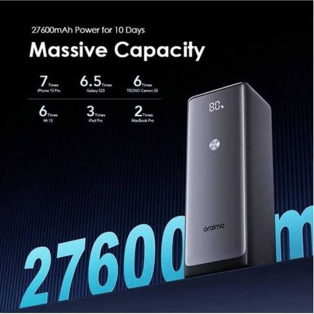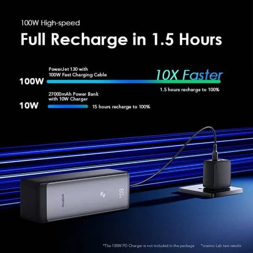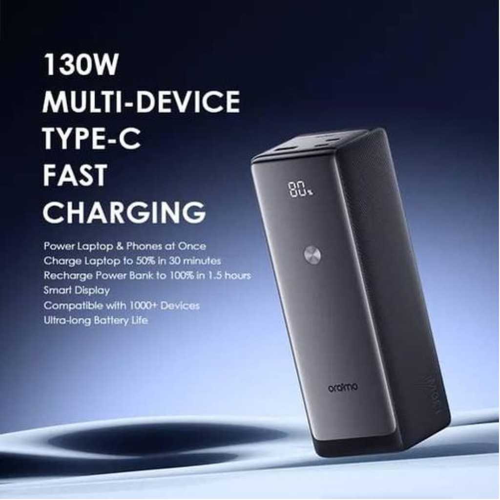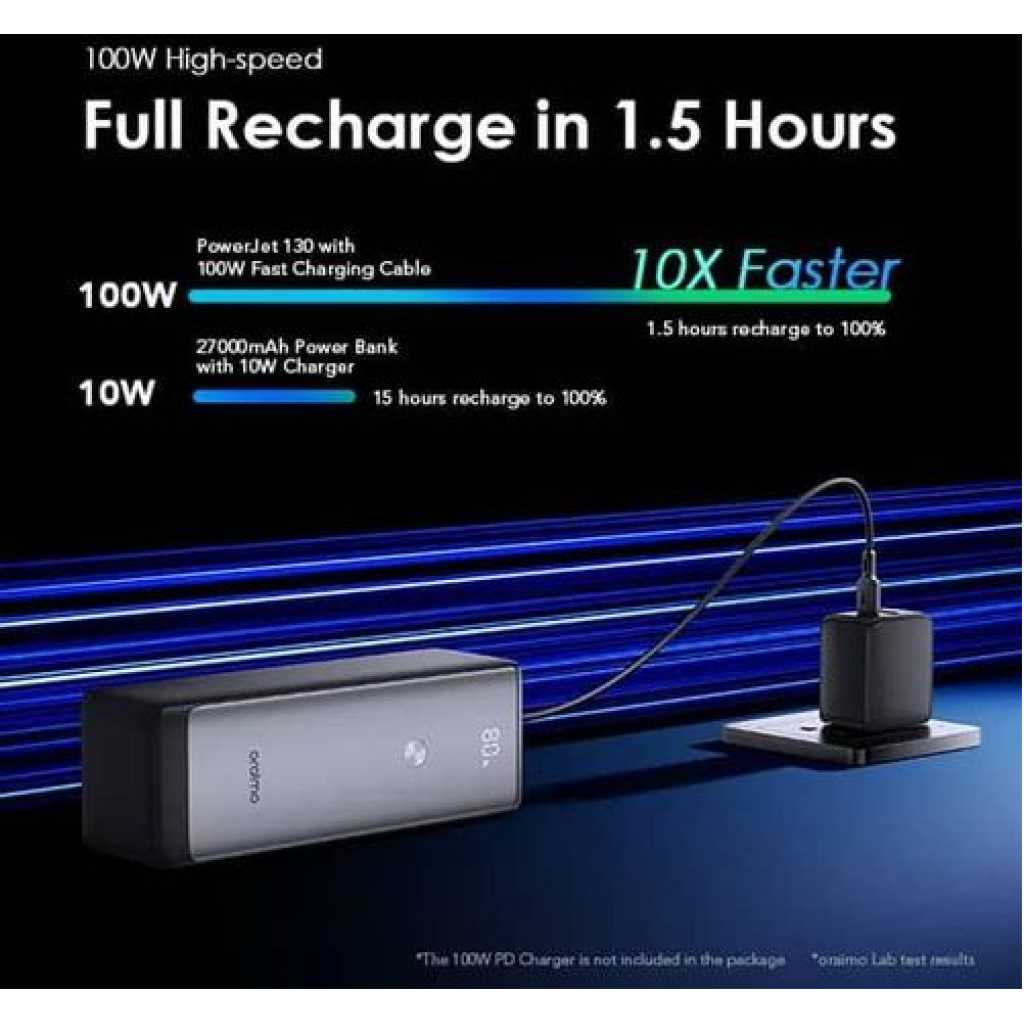 Oraimo 27600mAh PowerJet 130 Power Bank {OPB-727SQ} -130W fast charging for multiple devices including Apple, Samsung, TECNO, Infinix, HP, Dell, Lenovo, and more, offering you reliable power assurance Key Features: 100W High-Speed Recharging – Quick Return to Full Charge With 100W Type-C to Type-C fast charging cable in the package, you only need 1.5 hours to fully recharge the power bank. package. Smart LED Display – Stay Informed of Your Power Status Smart LED display allows you to check the power level, current charging mode, and charging efficiency. Power Up 1000+ Digital Devices – Universal Compatibility The power bank supports multiple fast charging protocols such as PD3.0, PPS, QC3.0, AFC, FCP, SCP, and more. It is compatible with multiple digital devices such as laptops, phones, tablets, and more. 3 Outputs & 1 Input – Charge 3 Devices at Once Low-current Mode: Safe On Small Devices oraimo PowerJet 130 can also work with low-current devices. Just press the Power Button twice to activate the low-current mode to charge your smartwatch, earphones, and headset.