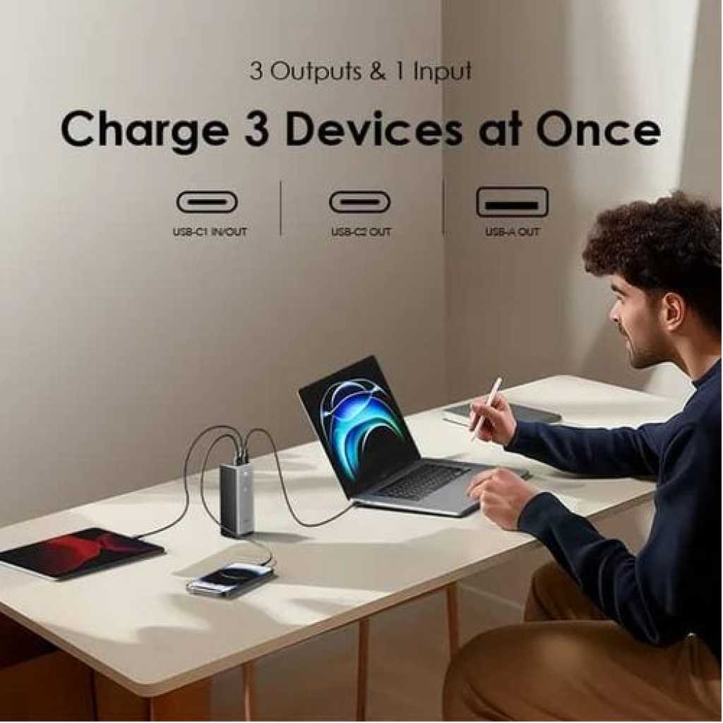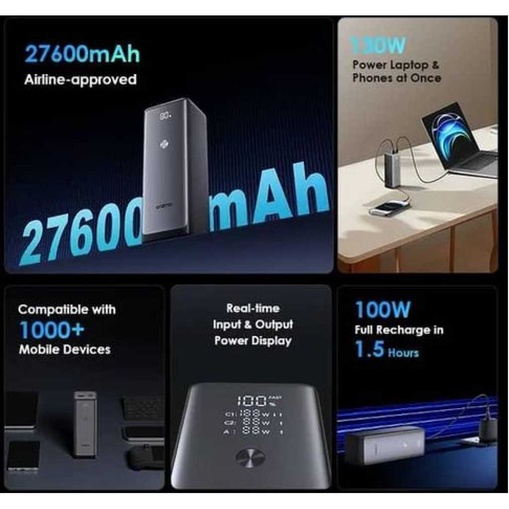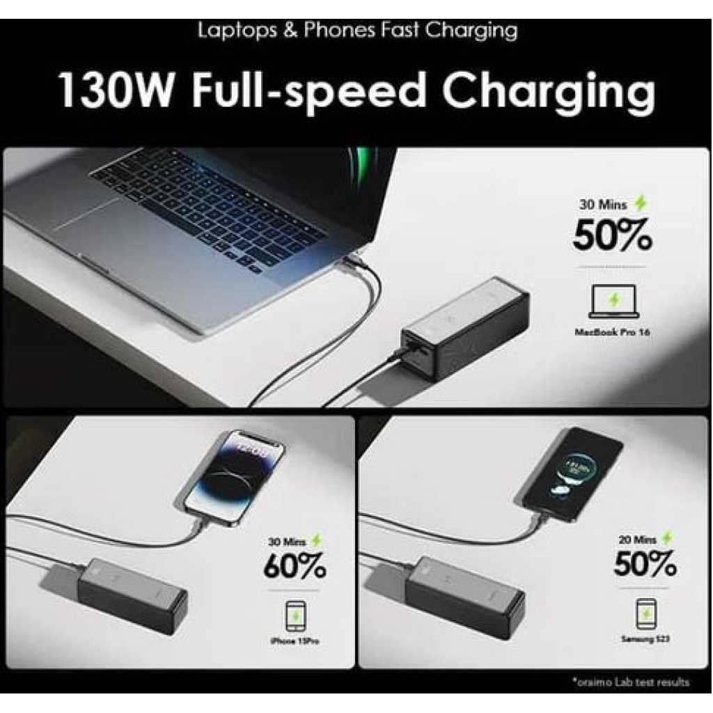 Oraimo 27600mAh PowerJet 130 Power Bank {OPB-727SQ} -130W fast charging for multiple devices including Apple, Samsung, TECNO, Infinix, HP, Dell, Lenovo, and more, offering you reliable power assurance Key Features: 100W High-Speed Recharging – Quick Return to Full Charge With 100W Type-C to Type-C fast charging cable in the package, you only need 1.5 hours to fully recharge the power bank. package. Smart LED Display – Stay Informed of Your Power Status Smart LED display allows you to check the power level, current charging mode, and charging efficiency. Power Up 1000+ Digital Devices – Universal Compatibility The power bank supports multiple fast charging protocols such as PD3.0, PPS, QC3.0, AFC, FCP, SCP, and more. It is compatible with multiple digital devices such as laptops, phones, tablets, and more. 3 Outputs & 1 Input – Charge 3 Devices at Once Low-current Mode: Safe On Small Devices oraimo PowerJet 130 can also work with low-current devices. Just press the Power Button twice to activate the low-current mode to charge your smartwatch, earphones, and headset.