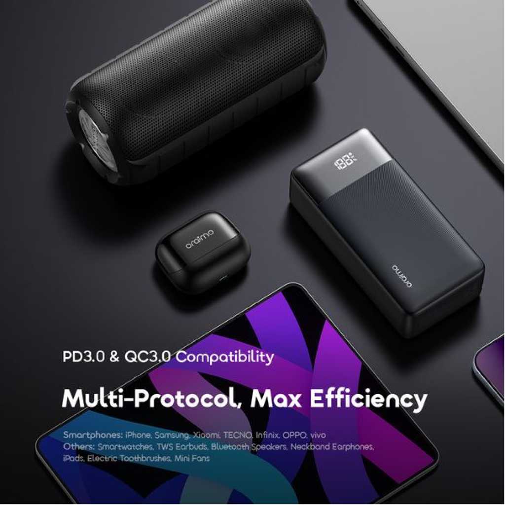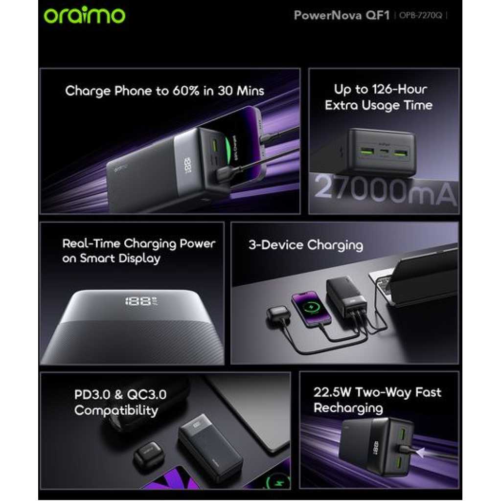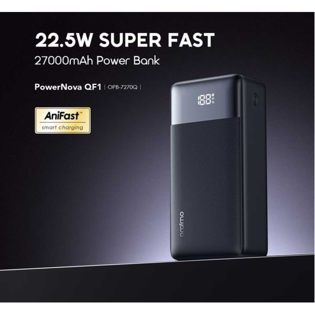 Oraimo PowerNova QF1 27000mAh 22.5W Power Bank Stay powered anywhere with the PowerNova QF1 high-capacity power bank, engineered for speed, endurance, and reliability. With massive 27,000mAh capacity, ultra-fast charging technology, and smart safety protection, it keeps your devices running through travel, workdays, and long adventures. Its intelligent display, multi-device support, and durable design make it the ultimate everyday power companion. Key Features 27000mAh Mega Capacity: Provides extended usage for phones, tablets, and more. Fast Charging Power: Charge compatible phones up to 60% in just 30 minutes. Triple Device Charging: Power up to 3 devices simultaneously. PD3.0 & QC3.0 Support: Fast, stable charging across multiple device brands. Smart Digital Display: Shows real-time battery status instantly. 15-Layer Protection: Advanced safety system for secure charging. 200% Faster Recharge: Quick Type-C input with longer battery lifespan. Technical Specifications Capacity: 27000mAh (99.9Wh) Input (Type-C): 5V/3A; 9V/2.22A; 12V/1.67A Outputs (USB-A ×2): 5V/3A; 9V/2.22A; 12V/1.67A; 10V/2.25A Output (Type-C): 5V/3A; 9V/2.22A; 12V/1.67A; 10V/2.25A Total Output: 5V/3A Max Key Features: 27000mAh Mega Capacity: Provides extended usage for phones, tablets, and more. Fast Charging Power: Charge compatible phones up to 60% in just 30 minutes. Triple Device Charging: Power up to 3 devices simultaneously. PD3.0 & QC3.0 Support: Fast, stable charging across multiple device brands. Smart Digital Display: Shows real-time battery status instantly. 15-Layer Protection: Advanced safety system for secure charging. 200% Faster Recharge: Quick Type-C input with longer battery lifespan.