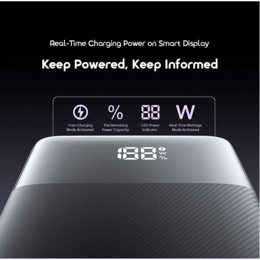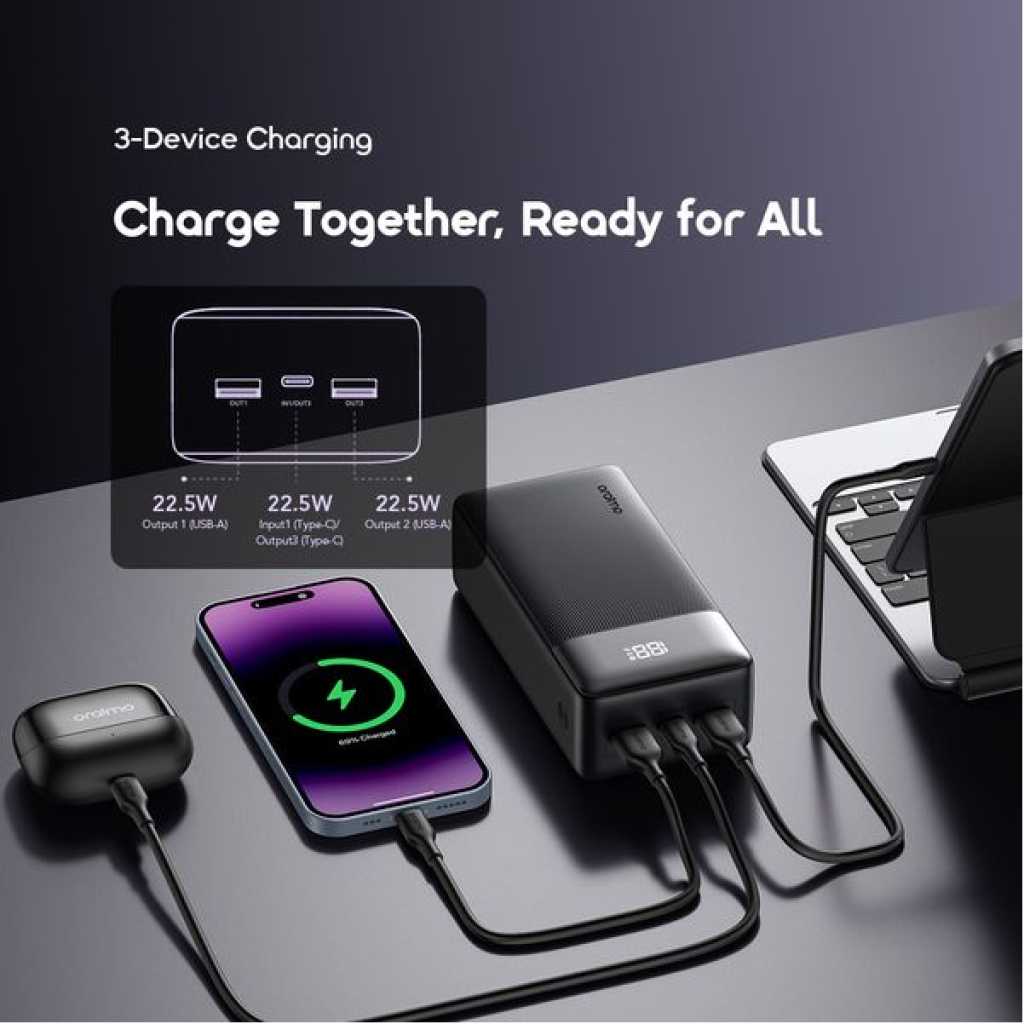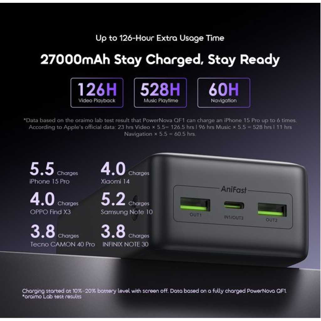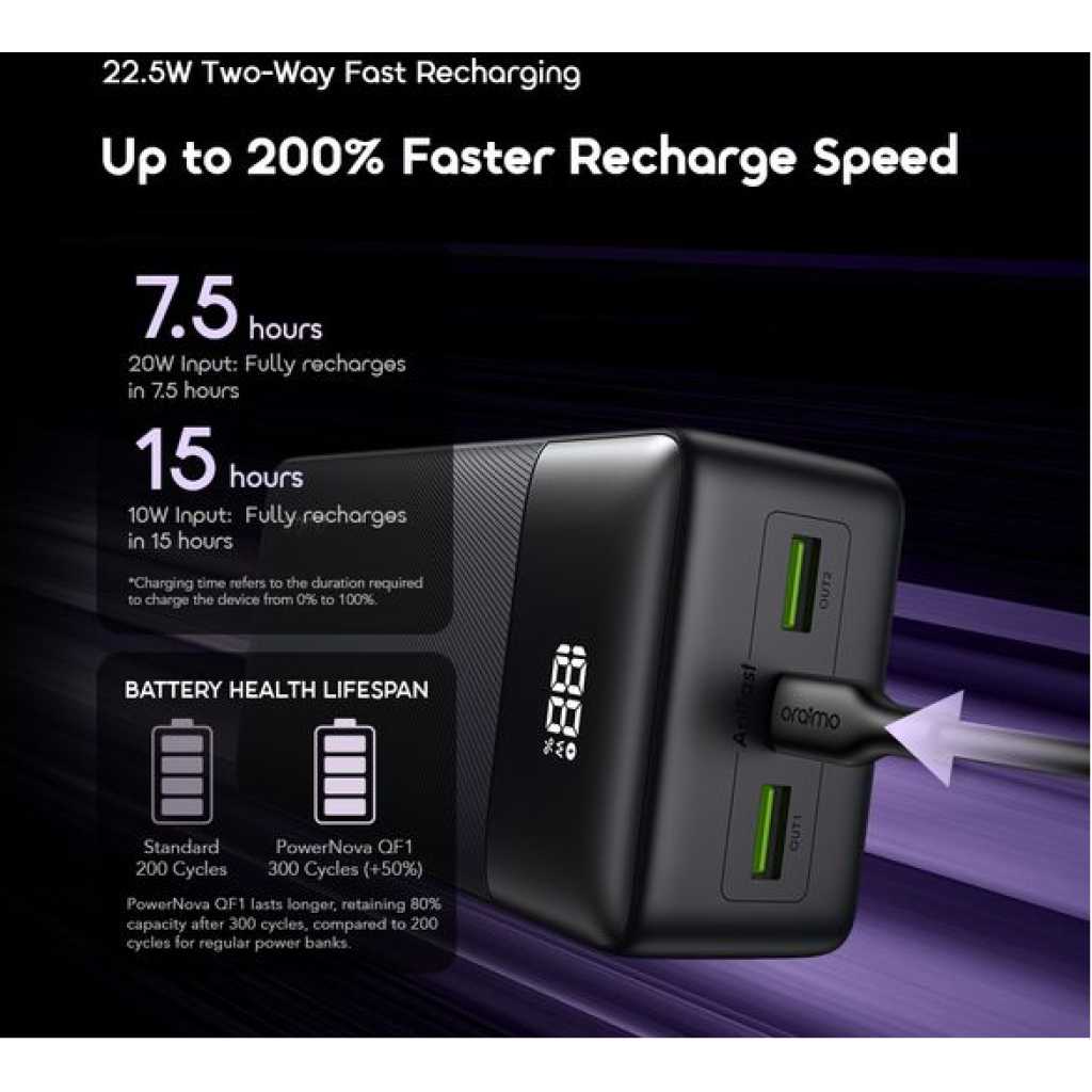 Oraimo PowerNova QF1 27000mAh 22.5W Power Bank Stay powered anywhere with the PowerNova QF1 high-capacity power bank, engineered for speed, endurance, and reliability. With massive 27,000mAh capacity, ultra-fast charging technology, and smart safety protection, it keeps your devices running through travel, workdays, and long adventures. Its intelligent display, multi-device support, and durable design make it the ultimate everyday power companion. Key Features 27000mAh Mega Capacity: Provides extended usage for phones, tablets, and more. Fast Charging Power: Charge compatible phones up to 60% in just 30 minutes. Triple Device Charging: Power up to 3 devices simultaneously. PD3.0 & QC3.0 Support: Fast, stable charging across multiple device brands. Smart Digital Display: Shows real-time battery status instantly. 15-Layer Protection: Advanced safety system for secure charging. 200% Faster Recharge: Quick Type-C input with longer battery lifespan. Technical Specifications Capacity: 27000mAh (99.9Wh) Input (Type-C): 5V/3A; 9V/2.22A; 12V/1.67A Outputs (USB-A ×2): 5V/3A; 9V/2.22A; 12V/1.67A; 10V/2.25A Output (Type-C): 5V/3A; 9V/2.22A; 12V/1.67A; 10V/2.25A Total Output: 5V/3A Max Key Features: 27000mAh Mega Capacity: Provides extended usage for phones, tablets, and more. Fast Charging Power: Charge compatible phones up to 60% in just 30 minutes. Triple Device Charging: Power up to 3 devices simultaneously. PD3.0 & QC3.0 Support: Fast, stable charging across multiple device brands. Smart Digital Display: Shows real-time battery status instantly. 15-Layer Protection: Advanced safety system for secure charging. 200% Faster Recharge: Quick Type-C input with longer battery lifespan.
