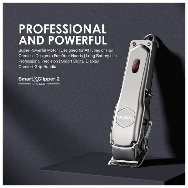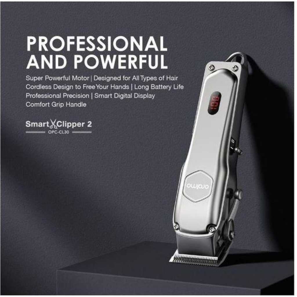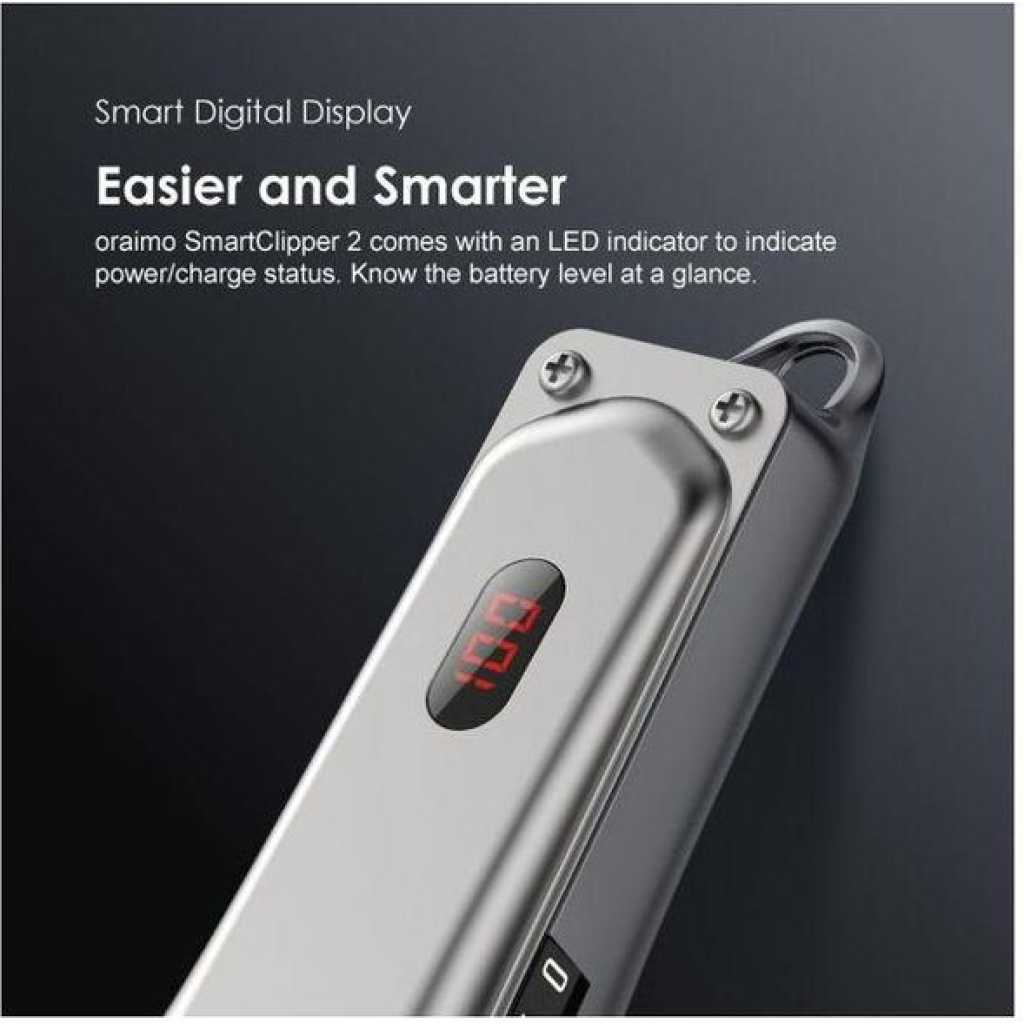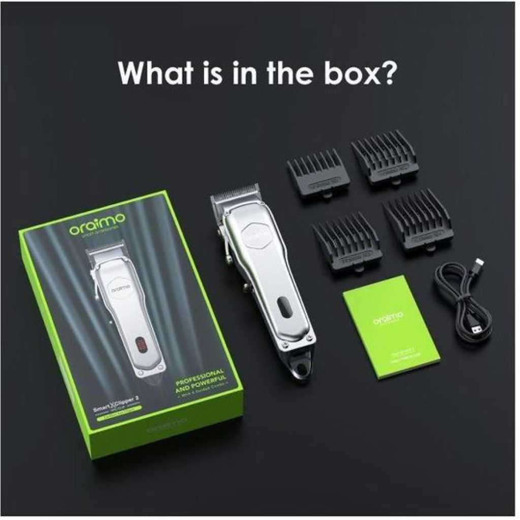 Size: 195*54*42.5mm Product Material: ABS+PC Rated Voltage: 5V Rated Power: 5W Blade Material:Stainless Steel Charging Time: 3 hour Full Working time: Up to 2.5 hours Model:OPC-CL30 Product Features: Super Powerful Motor – One is Enough Equipped with the strong vibrating electromagnetic motor, this clipper has a extra powerful blade speed. Also, this motor is energy efficient which is an added advantage. Long Working Time- No Battery Anxiety 2000mAh battery with 150 min runtime. Don’t ever have to worry about running out of frequently. High-precision Blades and 4 Guided Combs- Designed for All Types of Hair With its high precision blades and different guided combs, this clipper is the ideal choice and works great on all hair types.The taper lever on the clipper allows you to change the closeness of your cut between guide comb lengths. This is particularly useful for fading and blending as you can be more precise with your cutting lengths. Smart Digital Display- Easier and Smarter oraimo SmartClipper 2 comes with an LED indicator to indicate power/charge. Know the battery level at a glance. * What is in the box