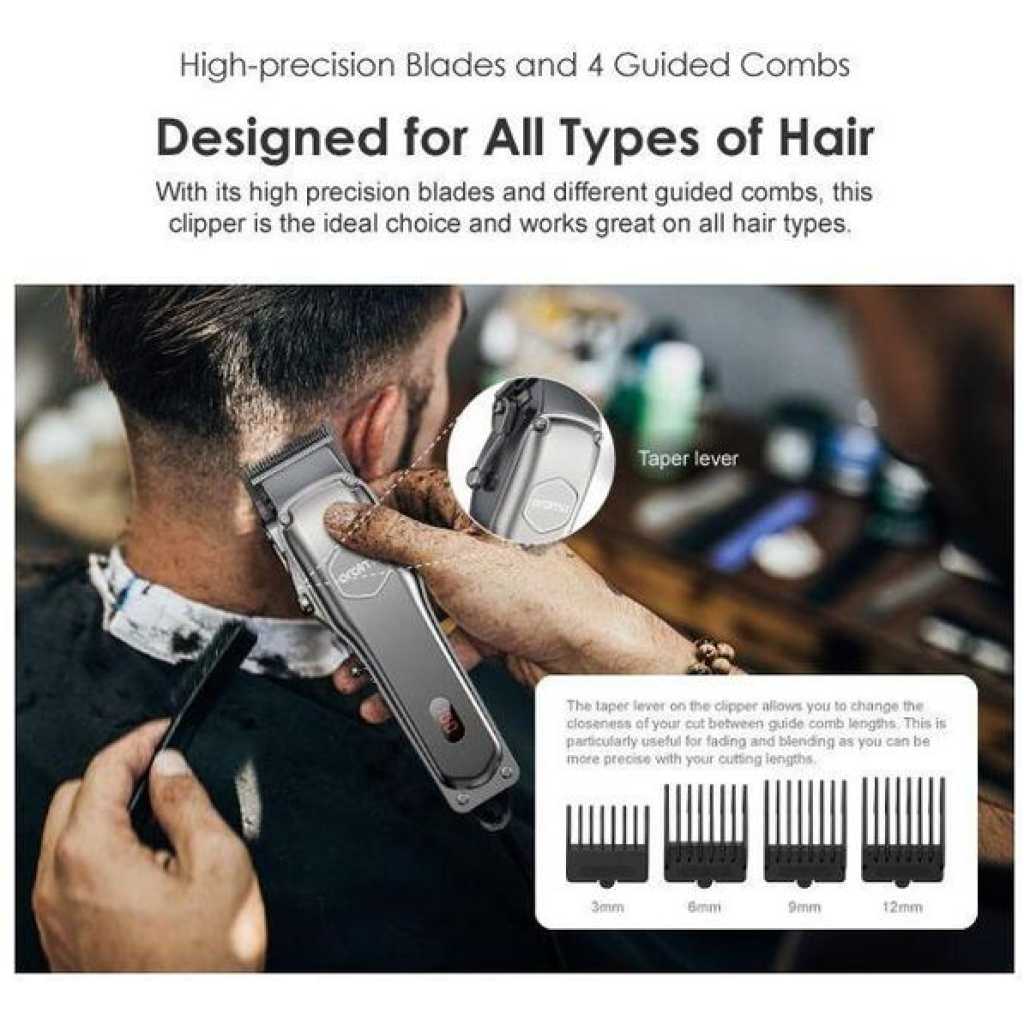 Key Features: Super Powerful Motor: High-speed electromagnetic motor provides strong, consistent cutting performance. Up to 2.5 Hours Runtime: Long-lasting battery eliminates frequent charging worries. Precision Blades + 4 Guide Combs: Suitable for all hair types with adjustable cutting lengths. Taper Lever Control: Easily customize cut closeness for fades and blending. Smart LED Display: Clearly shows power and charging status. Energy-Efficient Design: Strong performance with optimized power usage.
