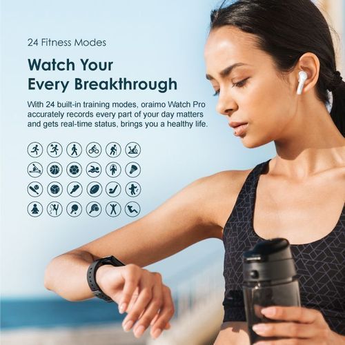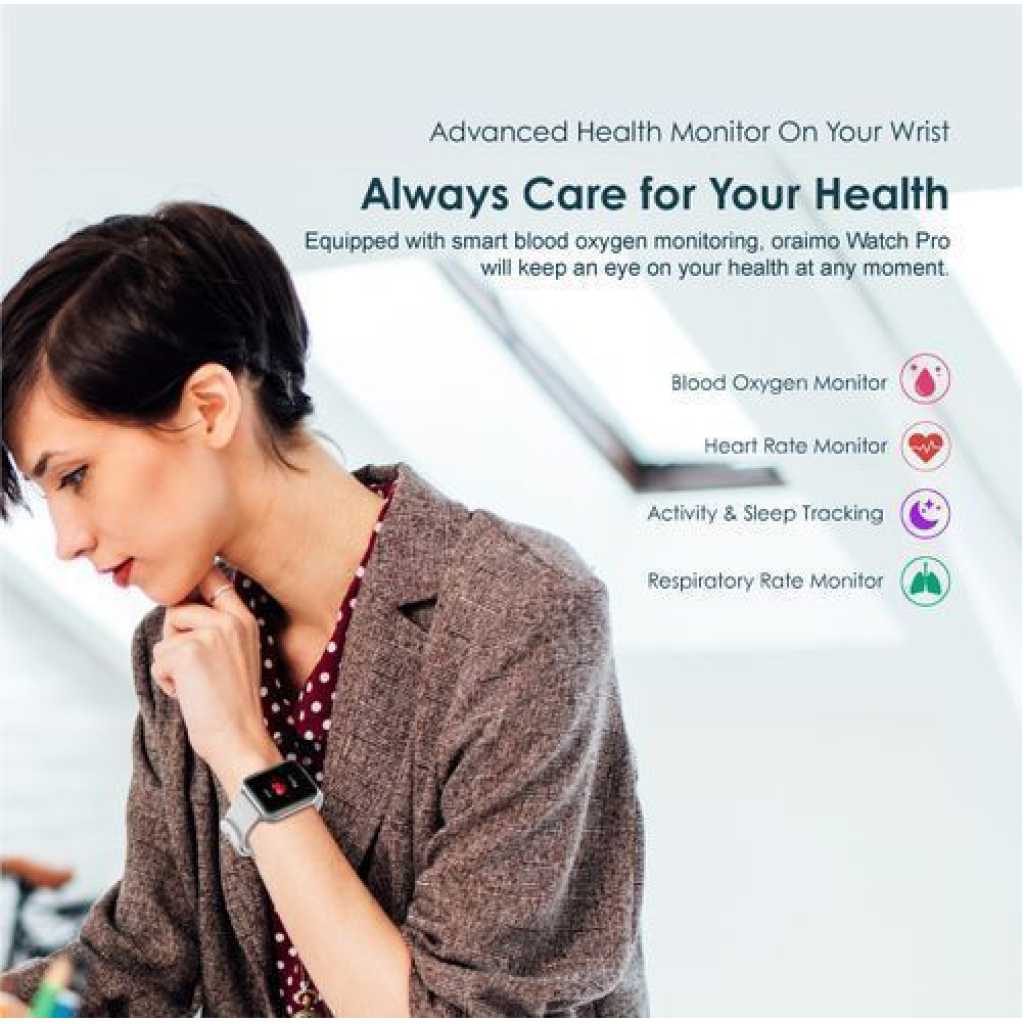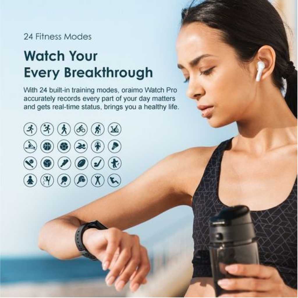 Oraimo Smart Watch Pro OSW-16P Gold Waterproof – Pink 80% Screen-to-body Ratio-Have Infinite Possibilities With bright colors and a sensitive touch, the 1.69” IPS screen is larger and clearer, allowing you to control the watch anytime and anywhere more easily. Advanced Health Monitor On Your Wrist-Always Care for Your Health Equipped with smart blood oxygen monitoring, Oraimo Watch Pro will keep an eye on your health at any moment. Get Notifications On-Time– Control At Any Time Check notifications for calls, texts, and apps easily and control everything from your wrist. 24 Fitness Modes-Watch Your Every Breakthrough With 24 built-in training modes, oraimo Watch Pro accurately records every part of your day matters and gets real-time stats, bring you a healthy life. 9.95mm Slim Body- More Comfortable to Wear The 9.95mm Slim body is designed to be worn for long periods, so you can focus on running, working, and even resting. A soft, skin-friendly TPU strap makes it comfortable to wear. Dress Up Your Clock Faces-Fashionable Every Day Choose from the newest faces ever, or customize them to match your fashion style — for a face that’s as unique as your own. Female Health Tracking-Give You Special Care Keep track of your body on a deeper level by using your watch with the app to follow your cycle, track your ovulation, get reminders, and more at any time. * This function only works after setting the gender to female, enabling notification and then syncing to your watch on Joywear 2 APP. BT 5.0-Stay Connected Every Moment Equipped with BT5.0, oraimo Watch works at a wider range up to 66ft, and transmits more data at once with a faster speed, while consuming lower power. Avoid Battery Anxiety-Up to 15 Days Battery Life Adopting the Power-Saving technology in the whole system, it stays by your side for up to 15 days* on a single charge. * Lab test result. Screen Size: 1.69″ IPS 240*280 BT Version: V5.0 Battery Capacity: 200mAh Battery Type: Lithium polymer battery Standby Time: Up to 15 days Screen Size: 33.23*28.57mm Watch Size: 43*35*9.95mm Weight: 165g Material: Al-Alloy/PC/TPU Waterproof Rating: IP68 Key Features: Oraimo Smart Watch Pro OSW-16P Gold Waterproof – Pink Screen Size: 1.69″ IPS 240*280 BT Version: V5.0 Battery Capacity: 200mAh Battery Type: Lithium polymer battery Standby Time: Up to 15 days Screen Size: 33.23*28.57mm Watch Size: 43*35*9.95mm Weight: 165g Material: Al-Alloy/PC/TPU Waterproof Rating: IP68