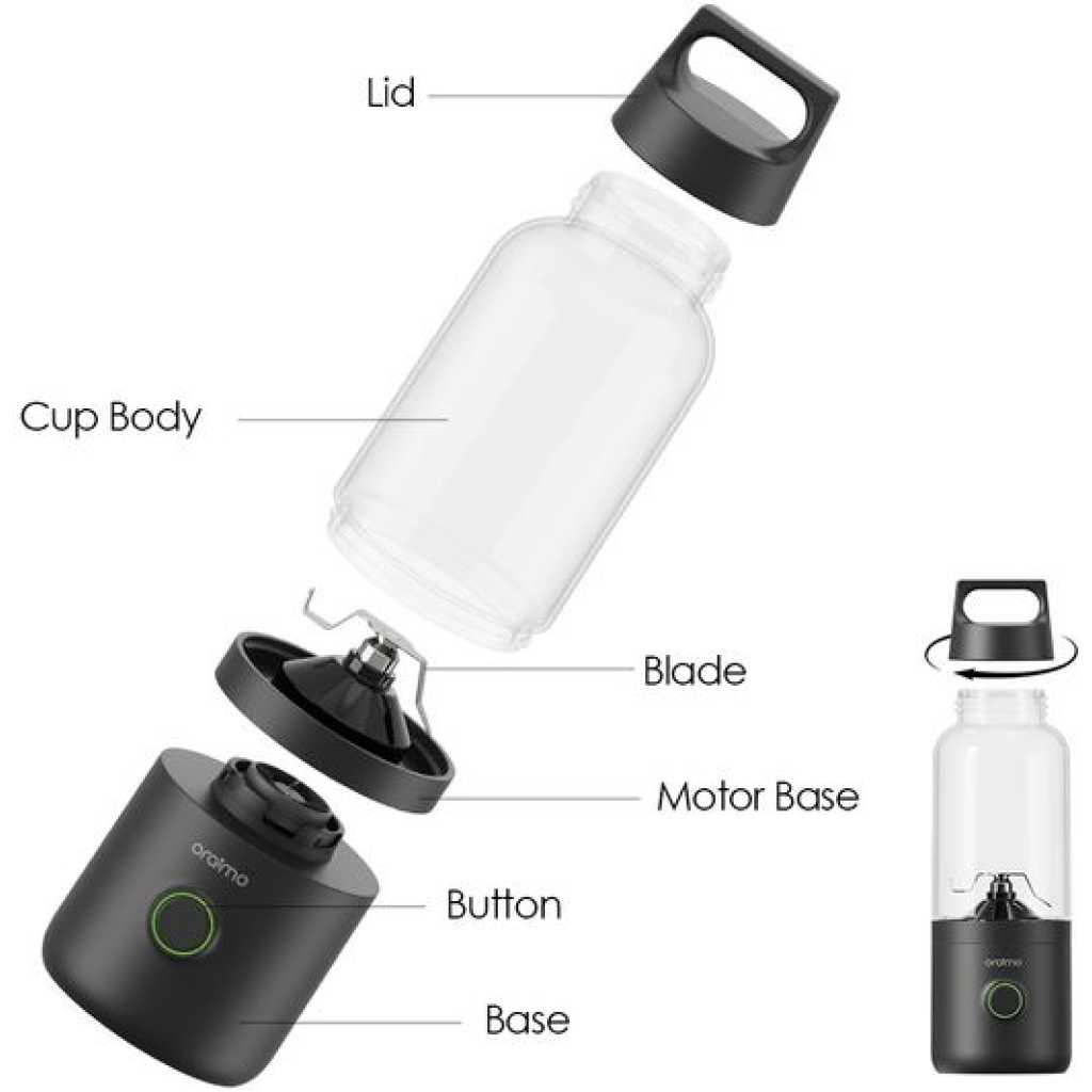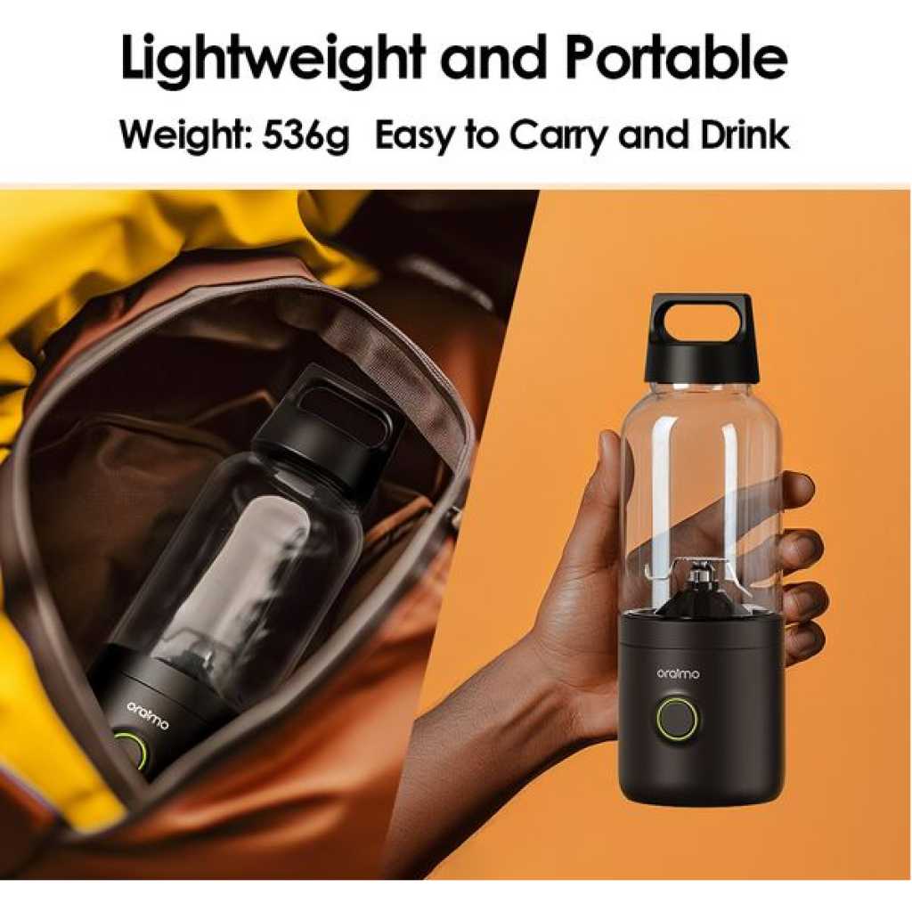 Capacity: 500ML Rated Power: 75W Weight: 536.6g Size: 81*84*253mm Cup Body Material: Tritan Blade Material: 304 stainless steel Waterproof Ring Material: Food-grade silicone Input Voltage/Current: 5V⎓2A Rated Voltage: 7.4V Battery Capacity: 2000mAh*2 *oraimo Lab test results Model: OH-PB1N Product Features: 500ml Large Capacity One Bottle for Your All-Day Vitamins SmartBlender Go’s 500ml Large Capacity keeps you fully fueled and refreshed all day. Eco-friendly Tritan Plastic Made from Tritan, SmartBlender Go is durable, odorless, BPA-free, and perfect for cool hydration on the go! Lightweight and Portable Designed for easy carry and drinking—enjoy fresh juice anytime, anywhere! Sharp Blades, Powerful Motors Experience effortless blending with SmartBlender Go’s sharp blades and powerful motors—perfectly smooth juices in seconds. Effortless Self-Cleaning Enjoy cleaning with SmartBlender Go—just add water, run, and let it self-clean with ease. Powerful Ice Crushing Ice Crushing with High Speed Rotary SmartBlender Go powers through ice with ease, bringing you cool, crushed refreshments in the heat. Dual 2000mAh batteries Dual 2000mAh batteries provide a multitude of juice options on a single charge.