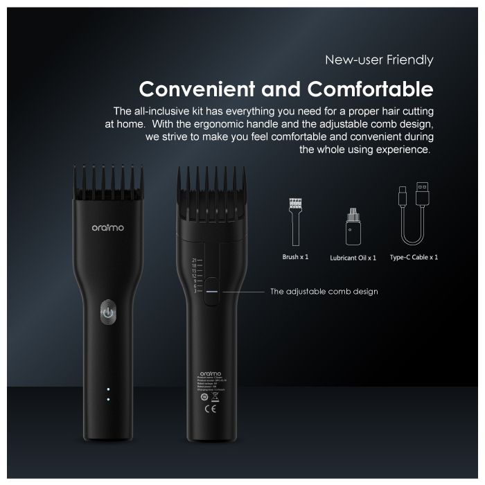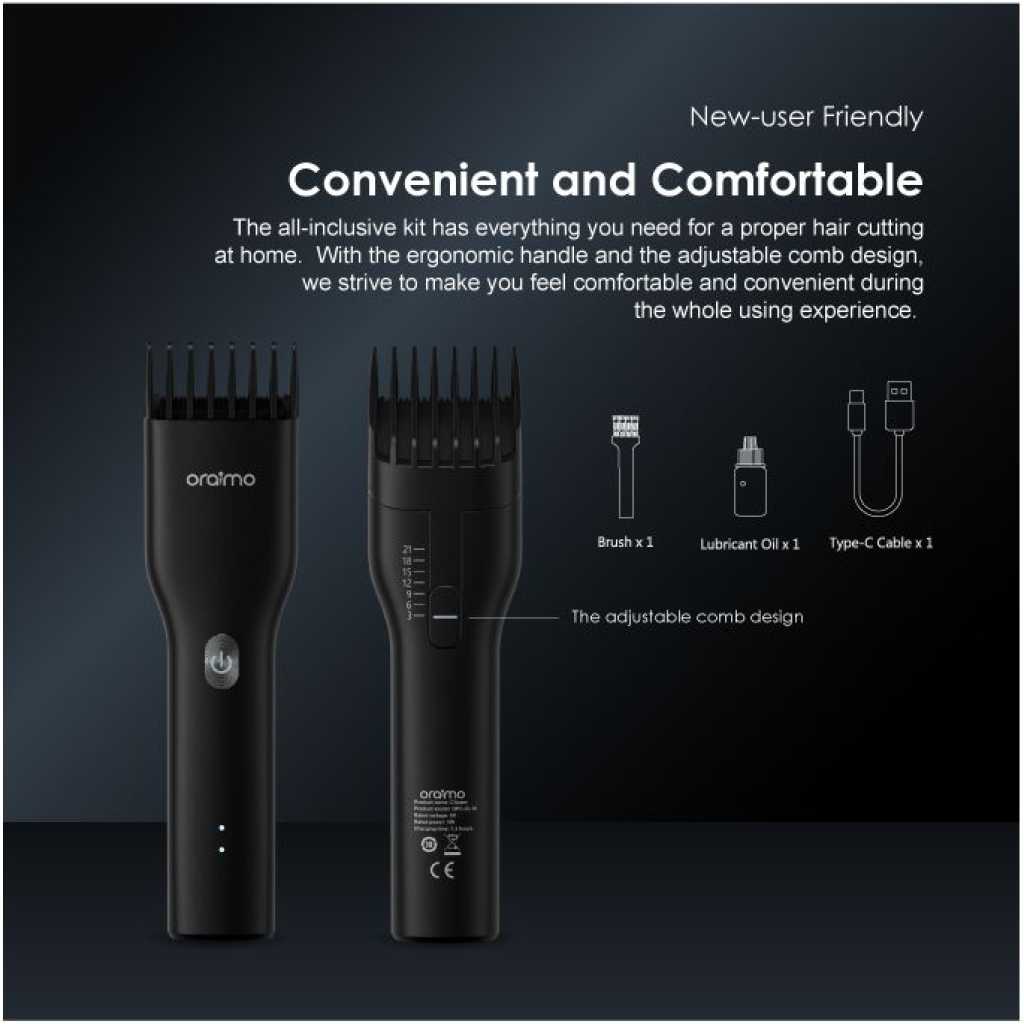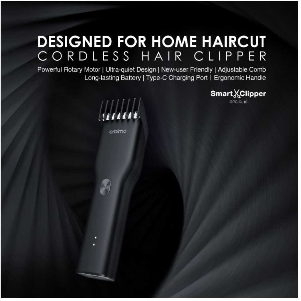 Oraimo SmartClipper Cordless Hair Clipper With 1 Guided Comb OPC-CL10 – Black. Product Parameters: Rated Voltage: 5V Rated Power: 5W Charging Time: 1 hour Product Features: High-performance Motor – One is Enough With sharp blades driven by extra performance motor, oraimo SmartClipper with guaranteed long-lasting sharpness is suitable for all family members. Ultra-quiet Design- Enjoy Carefree Haircut Designed to be gentle, this clipper will not give you the trouble of causing noise, so that you can enjoy a carefree haircut easily. New-user Friendly -Convenient and Comfortable The all-inclusive kit has everything you need for a proper hair cutting at home. With the ergonomic handle and the adjustable comb design, we strive to make you feel comfortable and convenient during the whole using experience. Type-C Quick Charge- Anywhere and Anytime Type-C charged convenience allows charging anywhere at any time. You can easily charge by computer and power bank.