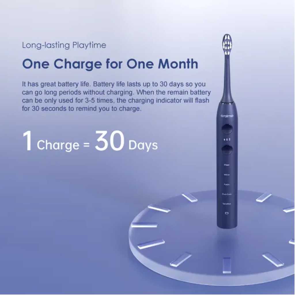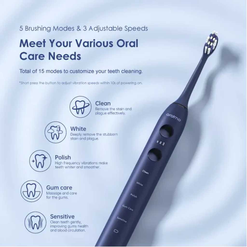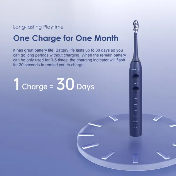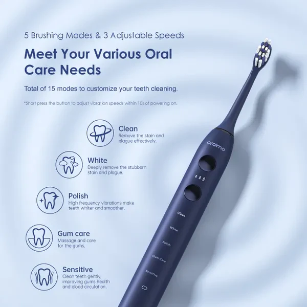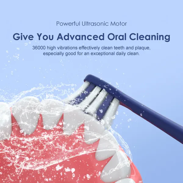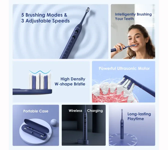 Key Features: • Powerful ultrasonic motor for efficient plaque removal • 5 brushing modes and 3 adjustable speeds for personalized care • Smart timer design encourages optimal brushing time • Wireless charging with included charging station • High-quality DuPont bristles for safe and effective cleaning • Up to 30 days of use on a single charge