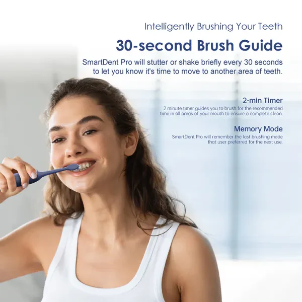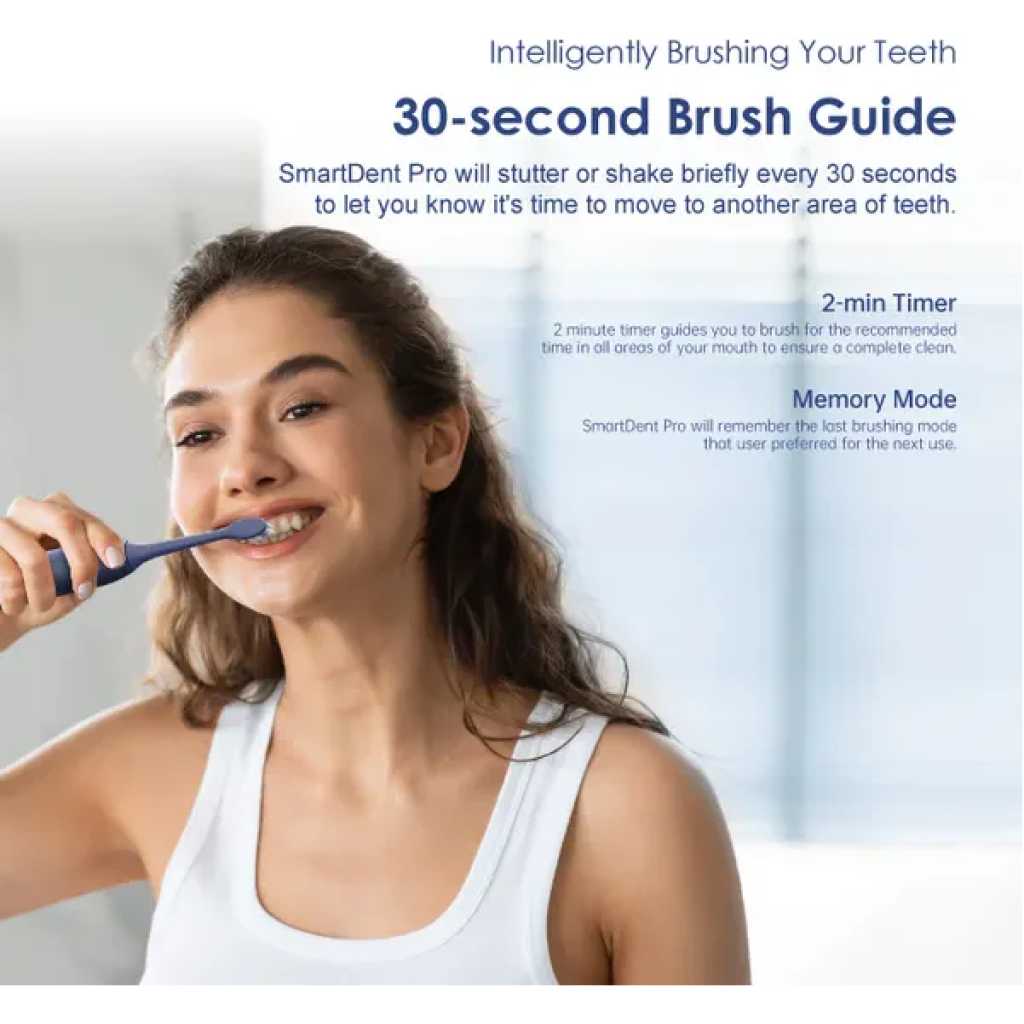 Product Highlights Powerful Ultrasonic Motor Smart Time Design Wireless Charging High Density W-shape Bristle Specifications Rated Input: 5V 1W Rated Voltage/Power: 3.7V= /3W Battery Capacity: 1200mAh Charging Time: 10 hours Working Time: 30 days Charging Type: Charging station Brush Head Material : DuPont Bristles Model: OPC-ET6 Powerful Ultrasonic Motor–Give You Advanced Oral Cleaning 36000 high vibrations effectively clean teeth and plaque, especially good for an exceptional daily clean. 5 Brushing Modes & 3 Adjustable Speeds–Meet Your Various Oral Care Needs Total of 15 modes to customize your teeth cleaning. Clean: Remove the stain and plague effectively. White: Deeply remove the stubborn stain and plague. Polish: High frequency vibrations make teeth whiter and smoother. Gum care: Massage and care for the gums. Sensitive: Clean teeth gently, improving gums health and blood circulation. *Short press the button to adjust vibration speeds within 10s of powering on. Smart Time Design–Intelligently Brushing Your Teeth 30-second Brush Guide: SmartDent Pro will stutter or shake briefly every 30 seconds to let you know it’s time to move to another area of teeth. 2-min Timer: 2 minute timer guides you to brush for the recommended time in all areas of your mouth to ensure a complete clean. Memory Mode: SmartDent Pro will remember the last brushing mode that user preferred for the next use. Wireless Charging–Set and Charge Upright charging keeps the brush head free from pollution, which is convenient and hygienic. Long-lasting Playtime–One Charge for One Month It has great battery life. Battery life lasts up to 30 days so you can go long periods without charging. When the remain battery can be only used for 3-5 times, the charging indicator will flash for 30 seconds to remind you to charge. High Density W-shape Bristle–Remove Plague Roughly The “W” shape fits the tooth shape and cleans the hard-to-reach areas thoroughly. Portable Case–Portable and Hygienic With attached case and extra replacement brush heads, you could take SmartDent Pro anywhere.