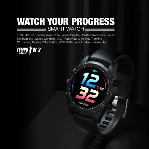 Oraimo Tempo-W2 IP67 Waterproof Smart Watch with 24 Training Modes & Up to 20 Hours Battery Life – Black. Product Features: Screen Size: 1.28″ G+F TFT Resolution 240*240 BT Version: V4.2 Battery Capacity: 180mAh Battery Type: Lithium polymer battery Standby Time: Up to 20 days Watch Size: 42*42*13mm Strap Size: 215mm Material: Zinc Alloy/PC/TPU Waterproof: IP67 Tempo-W2 Function: Full Touchscreen Pedometer Calorie Heart Rate Monitor Activity & Sleep Tracking Notifications Stopwatch Music Controls IP67 Waterproof 24 Training Modes Large & Full Touchscreen The big 1.28” screen allows you full access to control the watch smoothly with your fingertip. Real-Time Notifications Stay connected to what matters most with texts, calls, app alerts by simply raising your wrist. Activity & Sleep Tracking Monitors your heart rate, step, distance, calories, active minutes & time, and sleep quality to help understand your overall physical health. Boost Your Workouts Record accurate workout data in 24 different training modes and a stopwatch to measure the time. Premium Design HD color touchscreen, zinc alloy case, and a skin-friendly strap make the watch even more remarkable. IP67 Waterproof With IP67 waterproof, now you can wash hands, run in the rain and recover in the cold shower with this device on your wrist. Advanced Power-Saving Technology oraimo advanced Power-Saving technology enables you to see more using less power and enjoy an up to 3 weeks battery life. Key Features: Oraimo Tempo-W2 IP67 Waterproof Smart Watch with 24 Training Modes & Up to 20 Hours Battery Life – Black. 24/7 Heart Rate Tracking: With an all-new multipath sensor, the watch delivers 24/7 continuous heart rate tracking for exercise, sleep tracking and everything in between. Make Every Move Count: Every part of your day matters – track steps, distance, active minutes and calories burned. Choose from up to 24 training modes to get real-time stats, and a stop watch to count the time during your workouts. IP67 Waterproof: It is splash, water and dust resistant and was tested under controlled laboratory conditions with a rating of IP67. oraimo develops cool and creative smart accessory for young people around the world, enableing them to explore more excitement.