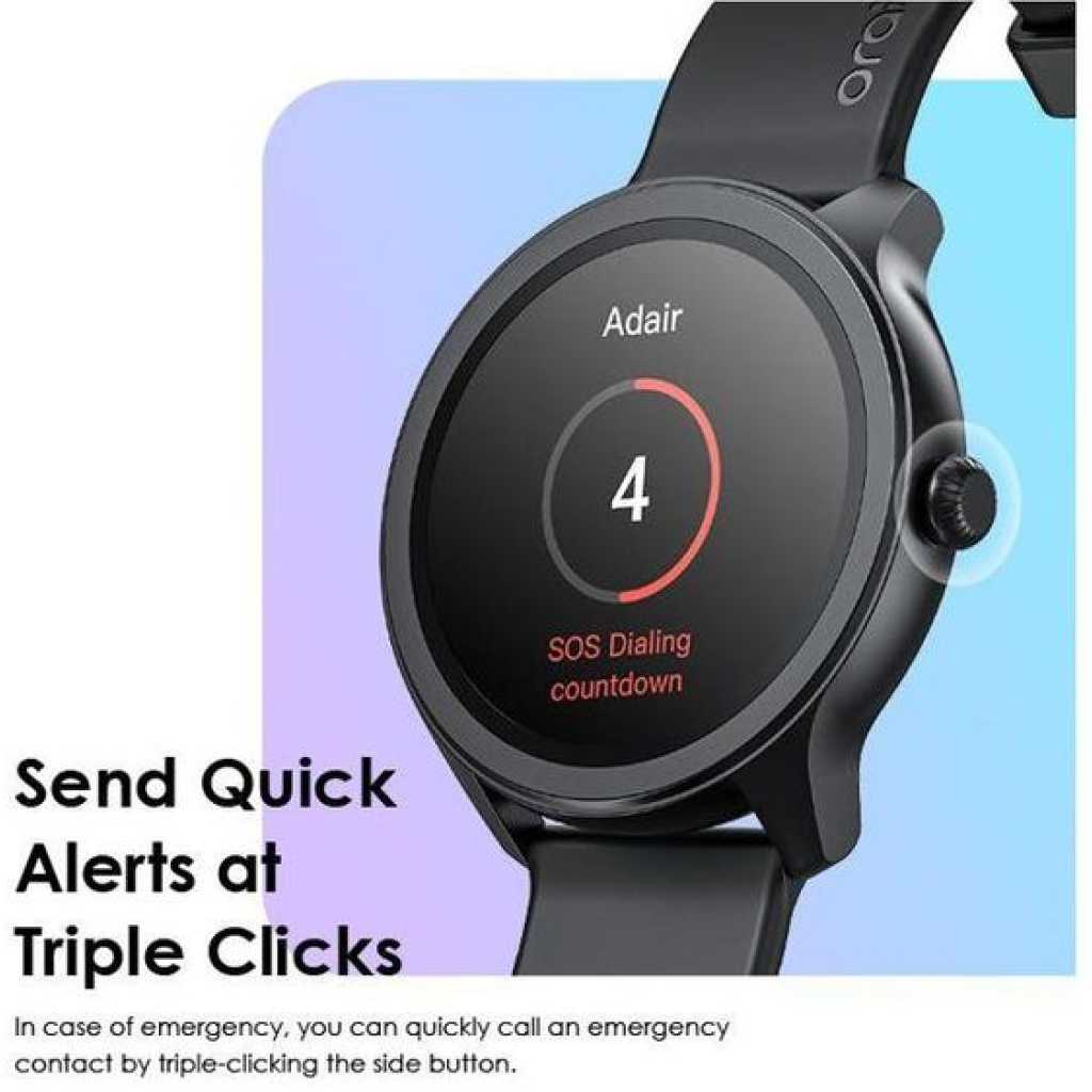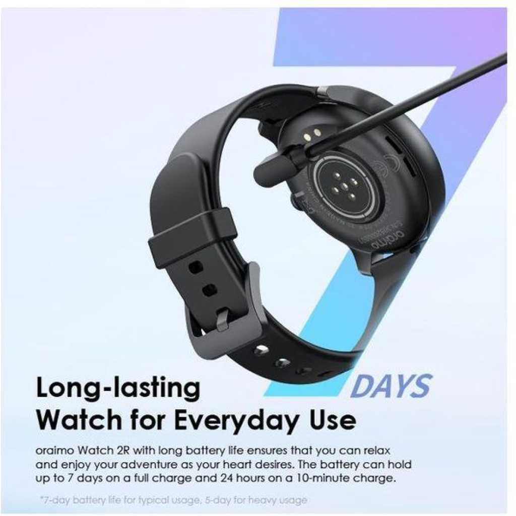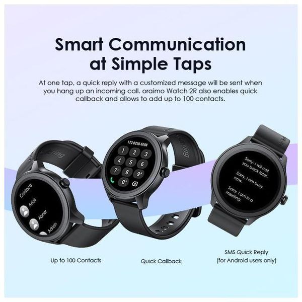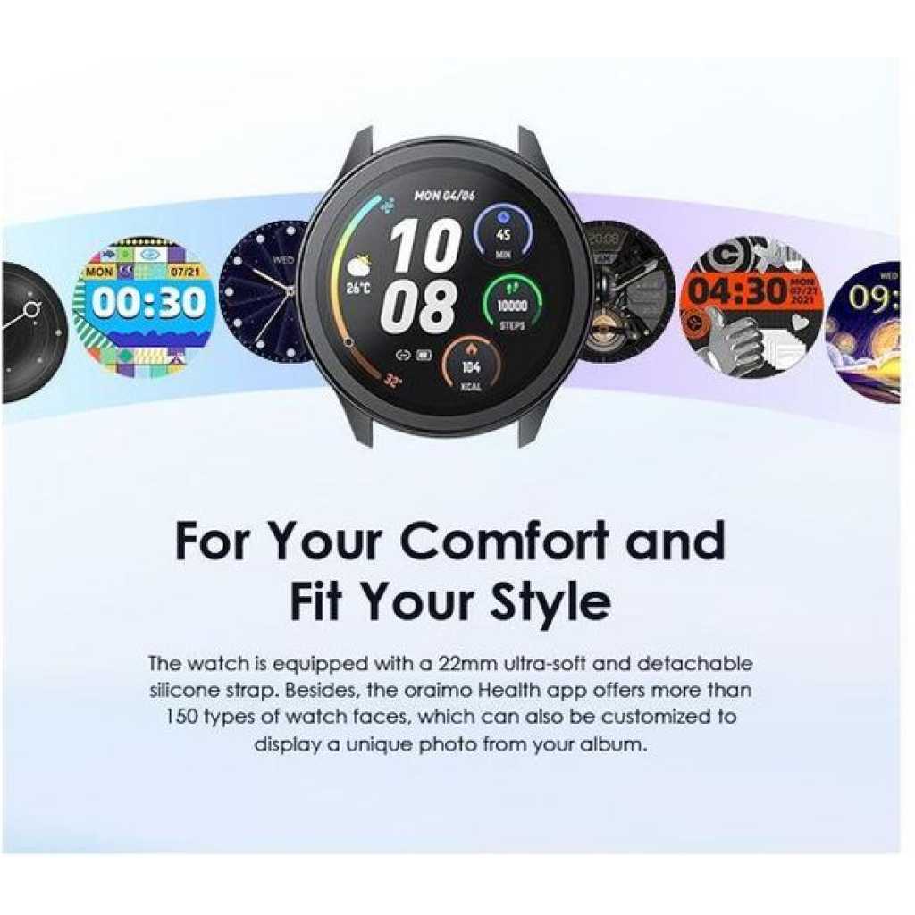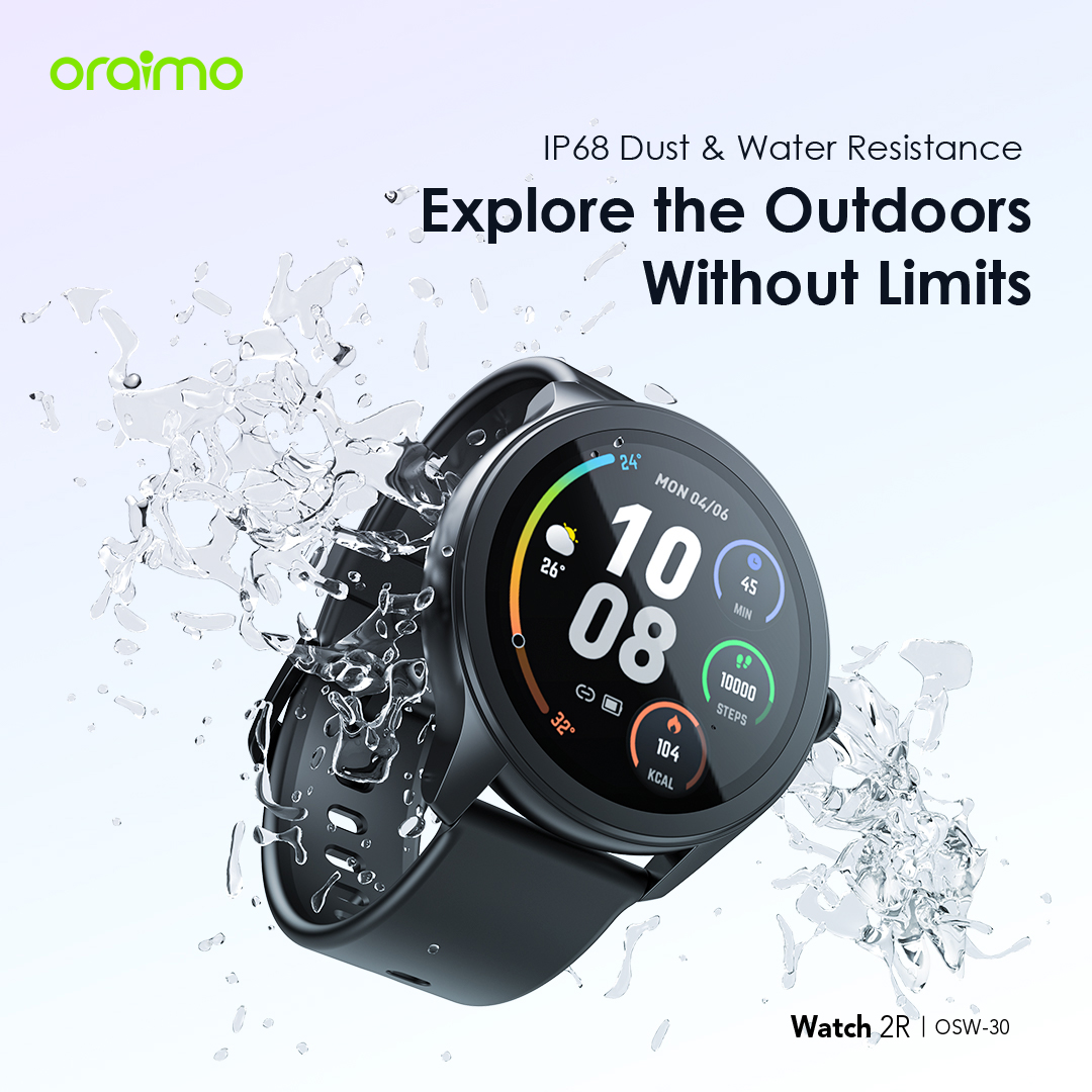 Product Parameters: Screen Size: 1.39″ TFT 360*360 BT Version: V5.2 Battery Capacity: 260 mAh Battery Type: Lithium polymer Charging Time:2h Standby Time: 7 days Waterproof: IP68 Watch Size: 46*46*11mm(without strap) Weight: 39.8 g(with strap) Material: ABS/PC/Silica Gel Model: OSW-30 *oraimo Lab test result Product Features: 1.39” High-definition Colorful Screen Clarity Like Never Before 1.39 TFT screen redefines clarity and delivers a brighter, more vivid viewing and smooth operating experience. * 1.39” (360*360 px) ; 500 nits brightness 120+ Sport Modes Customize Your Exercise Goals oraimo Watch 2R supports 120+ sports modes, meeting your diverse exercise needs. By monitoring your exercise status, you can adjust your goals more effectively. You can control music and media playing on your phone with your watch during training sessions as well. BT Calling Stay Connected on the Go Take, make, and reject calls directly from your wrist with ease anytime anywhere. The HD audio quality ensures that every conversation is clear and natural, making it feel like you’re talking face-to-face. The chip BT ensures fast, stable connectios and low power consumption. SMS Quick Reply and More Smart Communication at Simple Taps At one tap, a quick reply with a customized message will be sent when you hang up an incoming call. oraimo Watch 2R also enables quick callback and allows to add up to 100 common contacts. SOS Emergency Send Quick Alerts at Triple Clicks In case of emergency, you can quickly call an emergency contact by triple-clicking the side button. Reminders for Daily Health & Wellness Develop Healthy Habits Set up a health goal to help yourself form a good habit. For example, by setting a sedentary reminder, the watch will vibrate regularly to remind you to exercise after sitting for long periods. Useful Gadgets Your Sweet Personal Assistant Tap the dial to enjoy convenient functions such as remote control photography, setting alarm prompts, stopwatch timing, checking the weather, finding a phone, calculator, and more. 24-hour Health Monitoring Wellness Tracker—oraimo Health App oraimo Watch supports Heart rate, Blood oxygen saturation, Sleep, and Breathing exercise self-monitoring. Download the oraimo Health app for around-the-clock health and well-being tracking. IP68 Dust & Water Resistance Explore the Outdoors Without Limits An IP68 rating allows this watch to withstand rain and dust. Well-performing in various scenarios such as on the beach, desert, and in water sports, the watch is the ultimate accessory for a fitness enthusiast or an adventurous alike. * IP=Ingress Protection 6=Dust Tight 8=Survives being submerged in water 7-day Battery Life Long Lasting Watch for Everyday Use oraimo Watch 2R with long battery life ensures that you can relax and enjoy your adventure as your heart desires. The battery can hold up to 7 days on a full charge and 24 hours on a 10-minute charge. Ultra-soft Watch Strap and 150+ Watch Faces For Your Comfort and Fit Your Style The watch is equipped with a 22mm ultra-soft and detachable silicone strap. Besides, the oraimo Health app offers more than 150 types of watch faces, which can also be customized to display a unique photo from your album.
