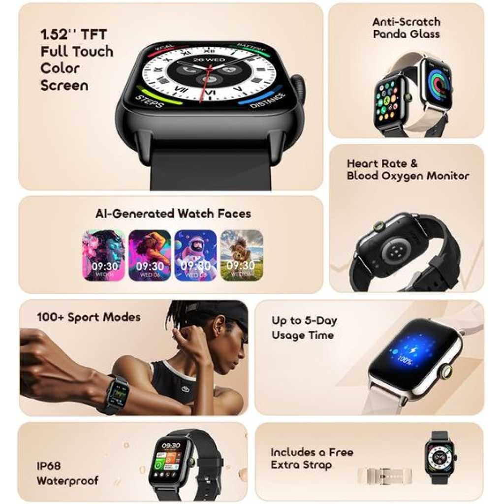 Key Features: 1.52″ TFT full‑touch display with vivid visuals AI‑generated customizable watch faces Anti‑scratch Panda Glass for durability Heart rate, blood oxygen, stress, and sleep monitoring 100+ sports modes for fitness tracking Up to 5‑day battery life Lightweight and compact design IP68 water and dust resistance Includes extra interchangeable strap