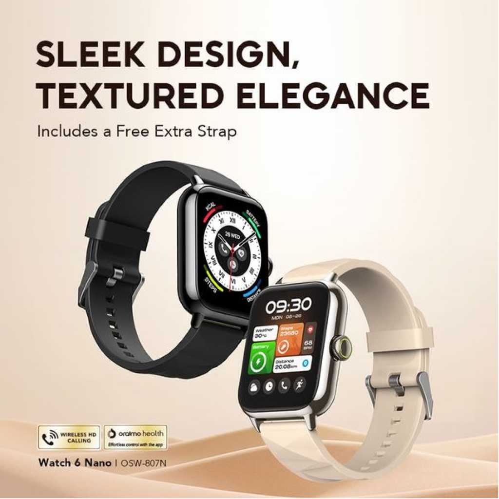 Display Screen: 1.52 TFT 240*283 Wireless Version: V5.3 Material: ABS/PC/Zinc Alloy Battery Type: Lithium Polymer Battery Capacity: 210mAh Charging Time: Approx. 3 Hours Normal Usage Time: 5 Days Standby Time: 20 Days Watch Size: 39.74*32.68*10.7mm Weight: 42.2g Waterproof: IP68 *oraimo Lab test results Product Features: 1.52 TFT Full Touch Color Screen Ultra Rich Color, Ultra Vivid Display Experience rich detail and vibrant visuals on the 1.52” TFT full-touch screen, delivering lifelike clarity in every glance. AI-Generated Watch Faces AI-Powered, Style-Forward Discover Watch 6 Nano with AI-crafted faces and 120+ designs on the oraimo health app. Anti-Scratch Panda Glass Keep Clear, Keep Durable Anti-scratch Panda Glass helps protect the screen and keep it clear through daily use. Heart Rate & Blood Oxygen Monitor Precision in Measurement, Wellness in Life Watch 6 Nano tracks heart rate, blood oxygen, stress, and sleep — helping you stay informed and live healthier with ease. IP68 Waterproof Rain or Sweat, Free from Worry Equipped with IP68 waterproof protection, Watch 6 Nano is made for sports and active lifestyles — resistant to rain, sweat, and tough workouts, ensuring reliable performance every step of the way. Up to 5-Day Usage Time Stay Ready, Always On Enjoy up to 5 days of usage on a single charge. Whether for work, or workouts, Watch 6 Nano keeps up with your life without frequent charging. 100+ Sport Modes Train Your Way,Empower Your Day With over 100 sport modes, Watch 6 Nano helps you track workouts across every activity — from walking and running to yoga. Always enjoy your day with oraimo. Includes a Free Extra Strap One Watch, More Looks Includes a free replacement strap for easy swapping, ensuring long-lasting use and worry-free wear. What’s in the Box? oraimo Watch 6 Nano ×1 Extra Silicone Watch Straps ×1 Magnetic Charging Cable ×1 Welcome Guide ×1